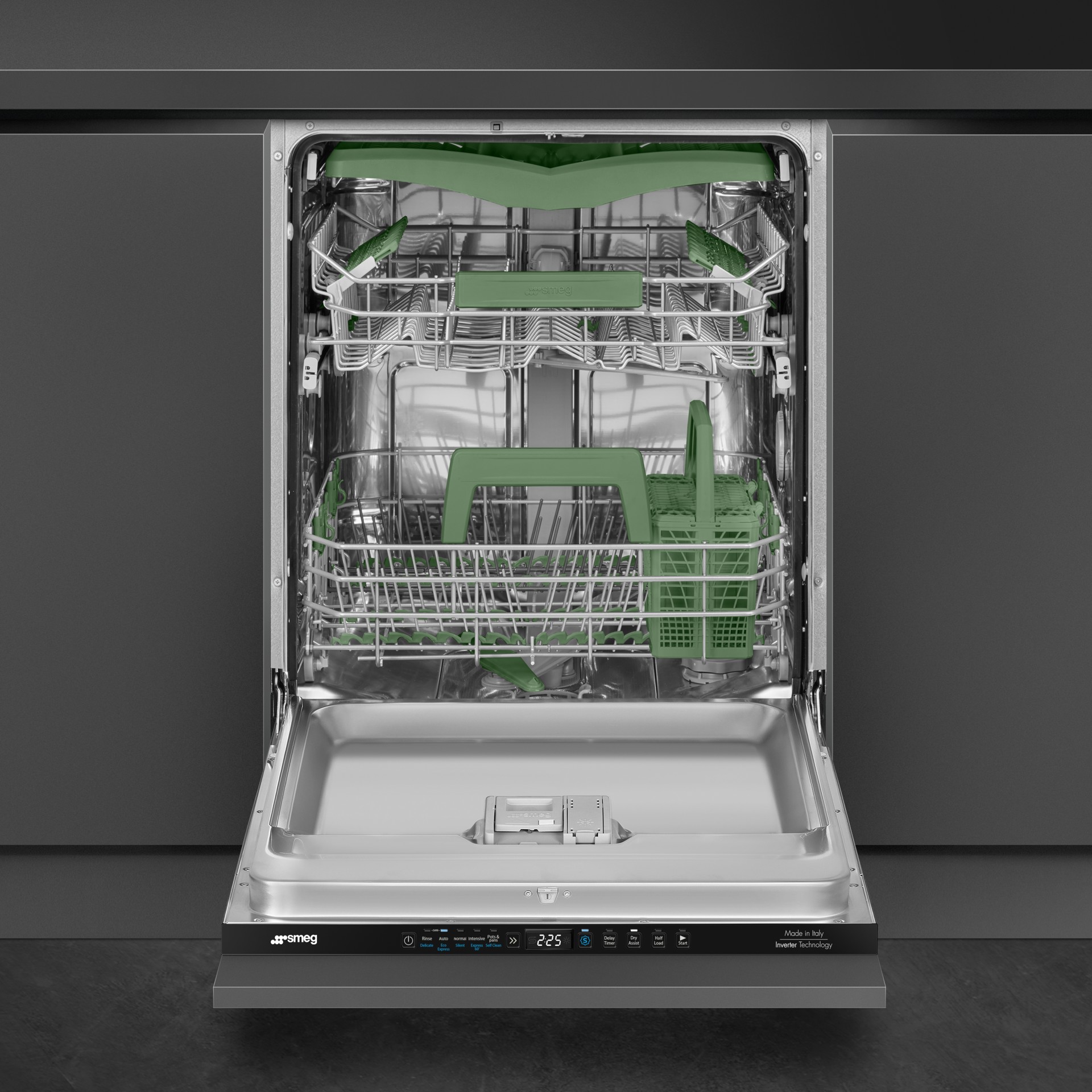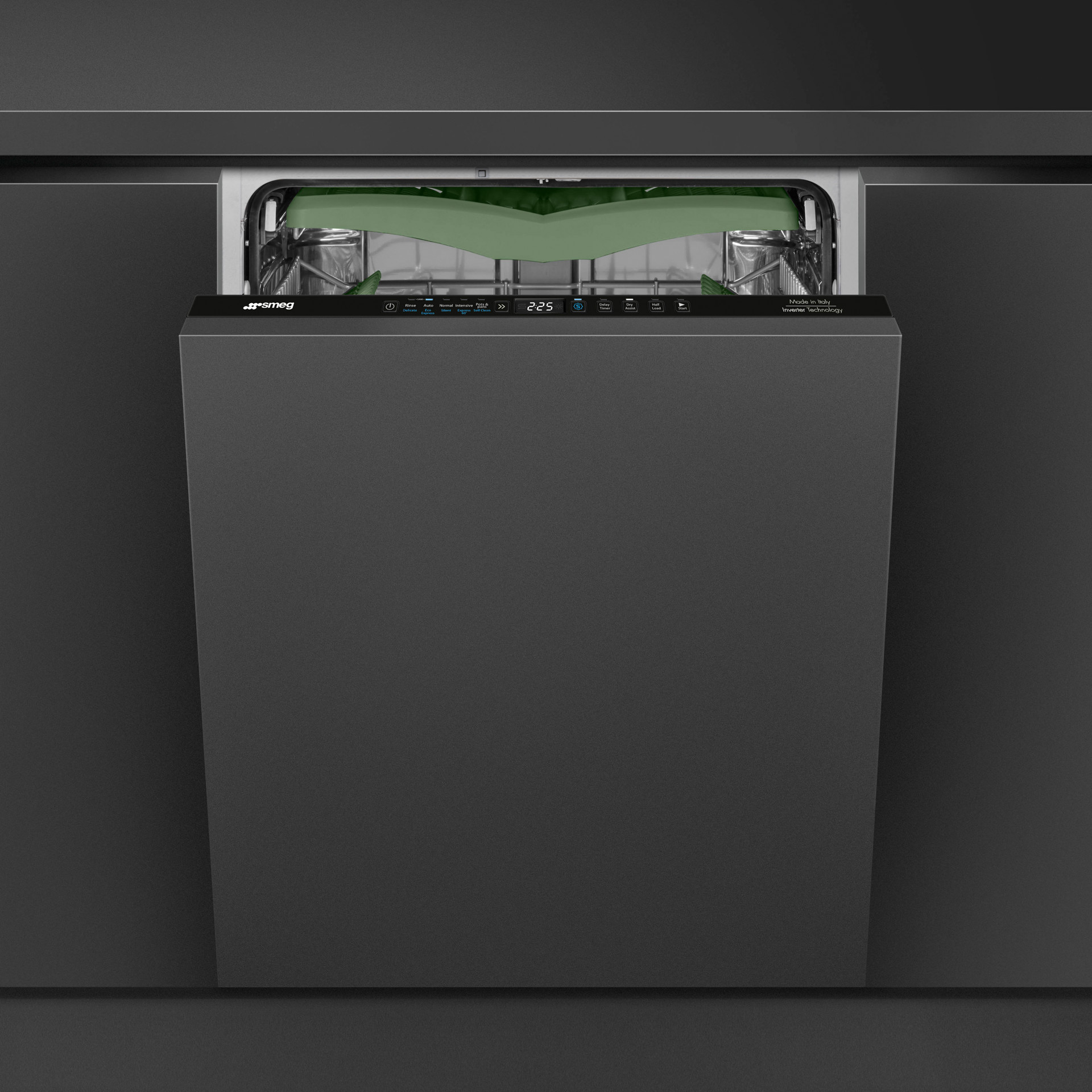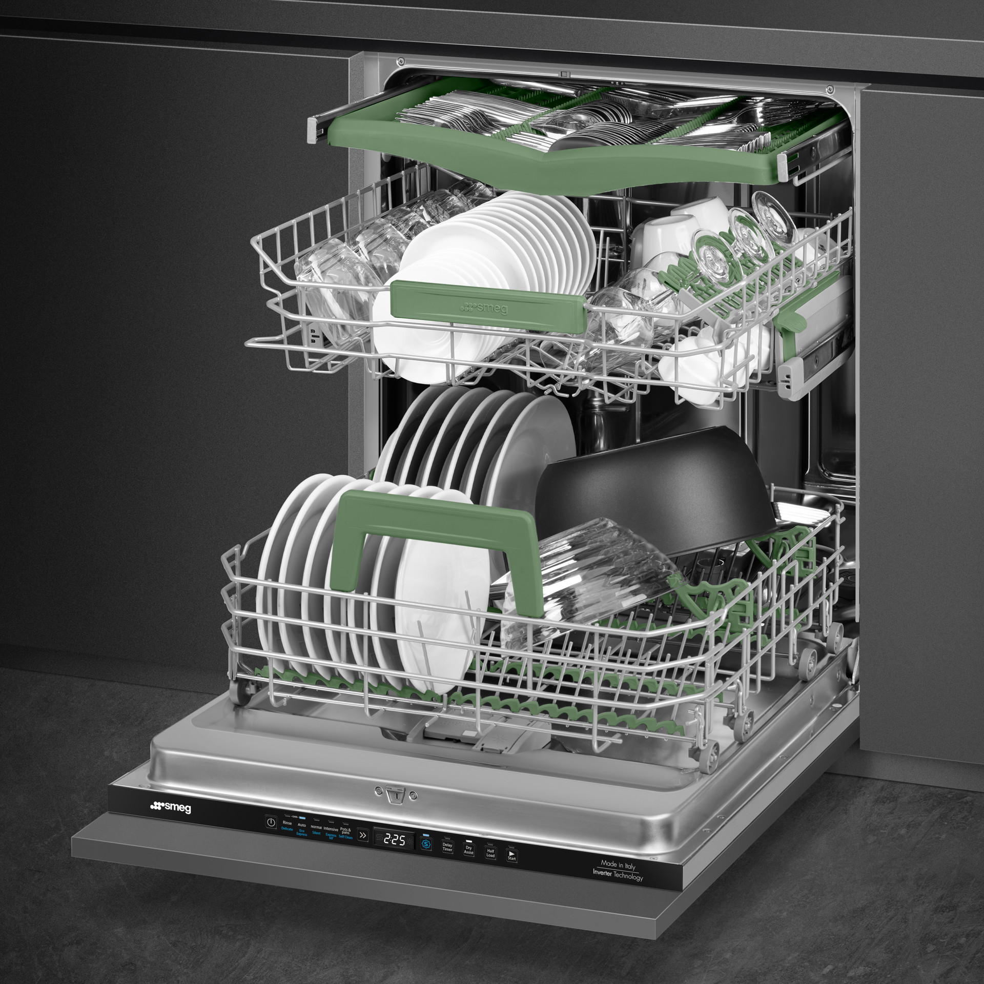 The Orbital Wash System, a signature feature of SMEG 24" dishwashers, consists of a double spray arm with reverse rotation that distributes water evenly throughout the cavity. This ensures excellent cleaning quality while significantly reducing noise levels.