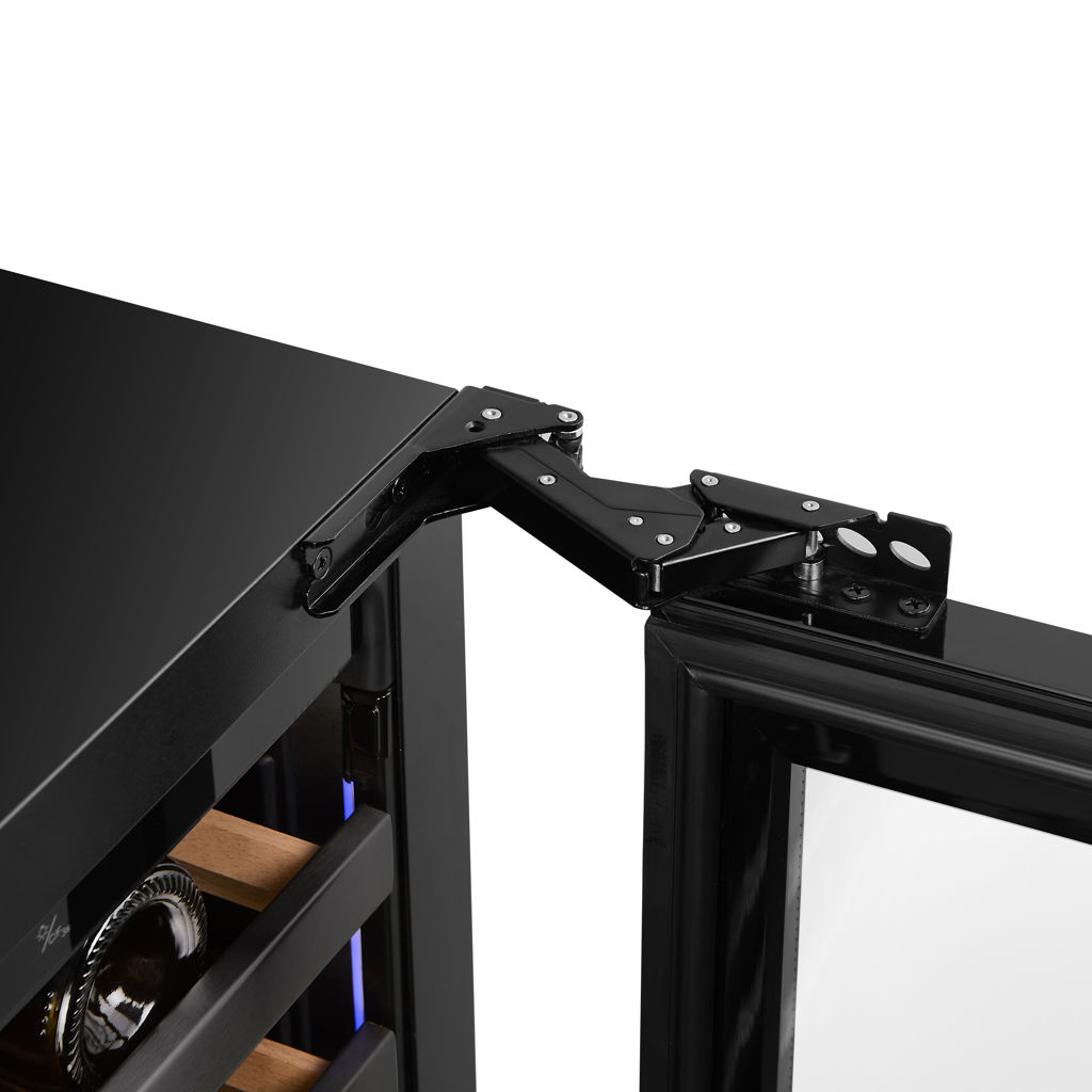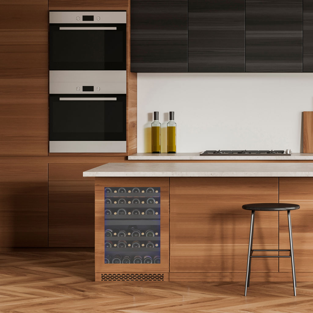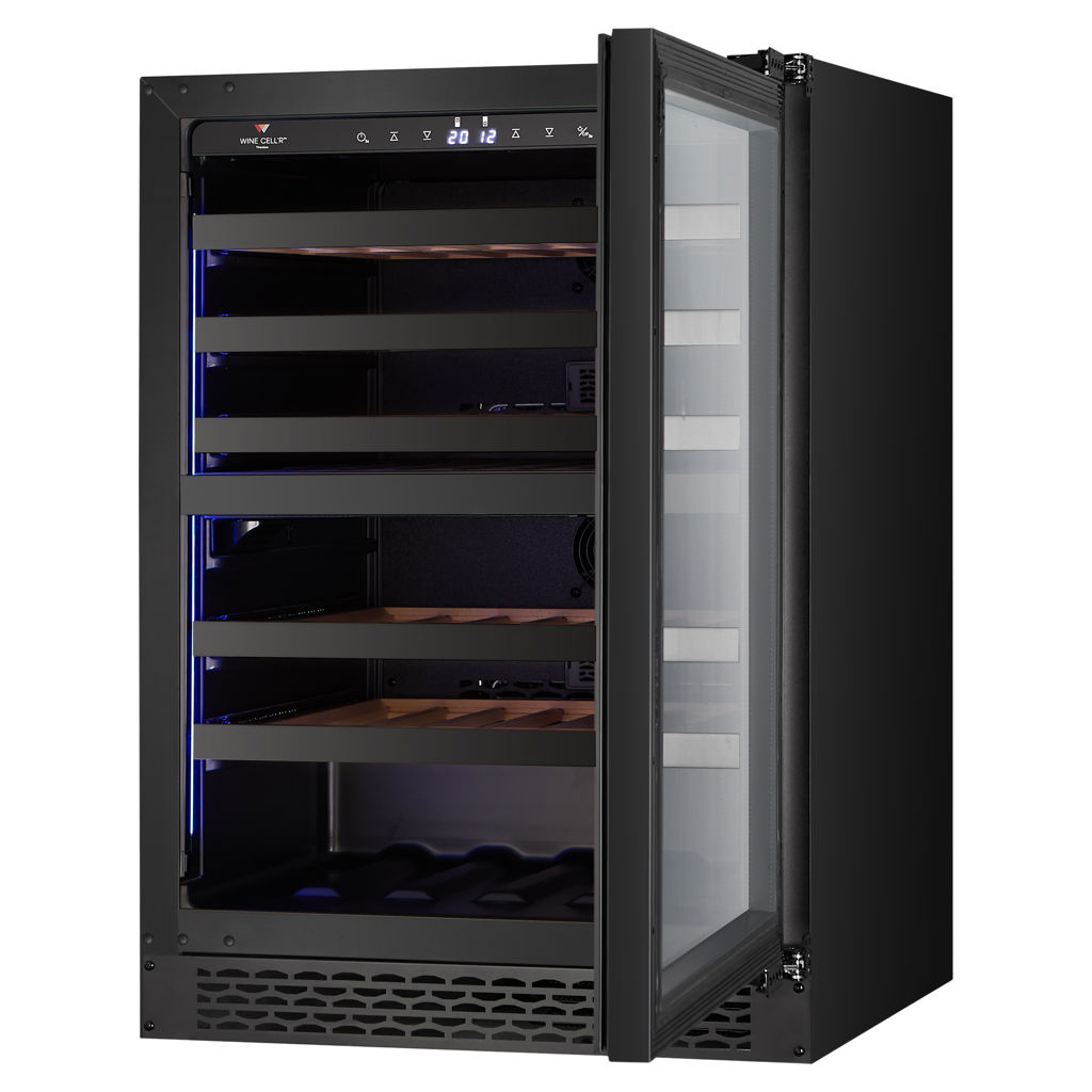 Two-zone cellar with 46-bottle capacity, can be built-in or free-standing. It features a reversible UV-resistant glass door, which can be partially or fully covered.