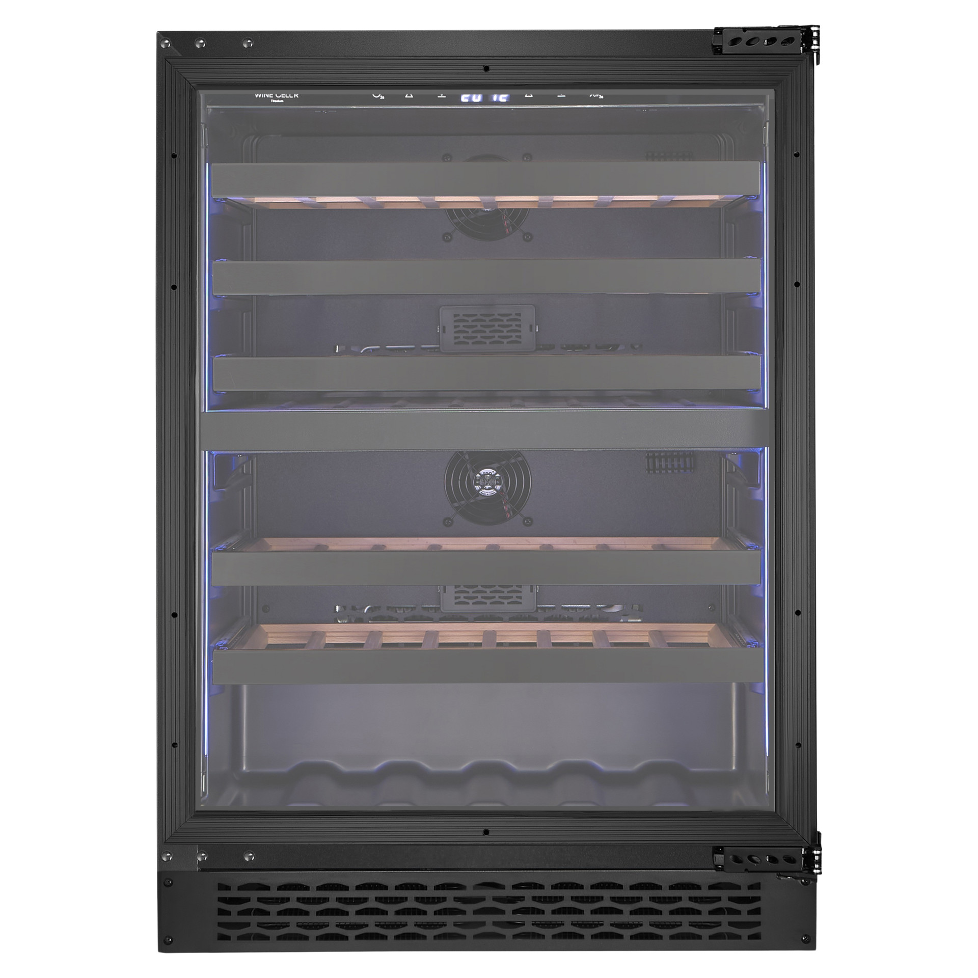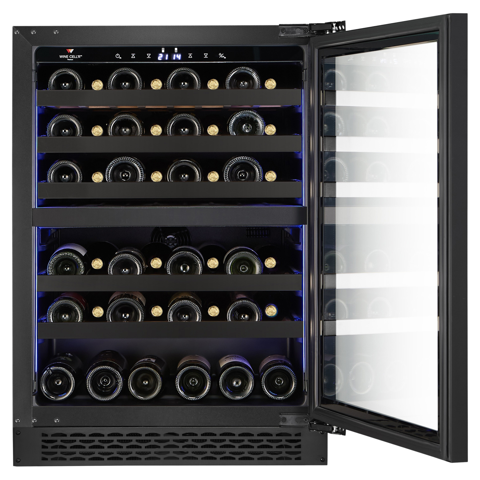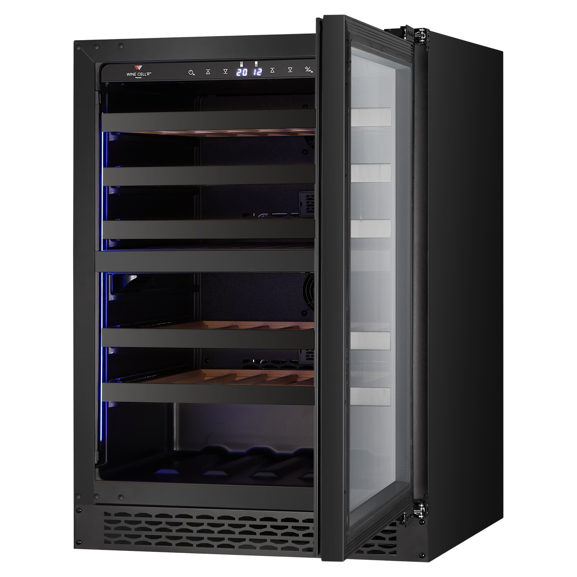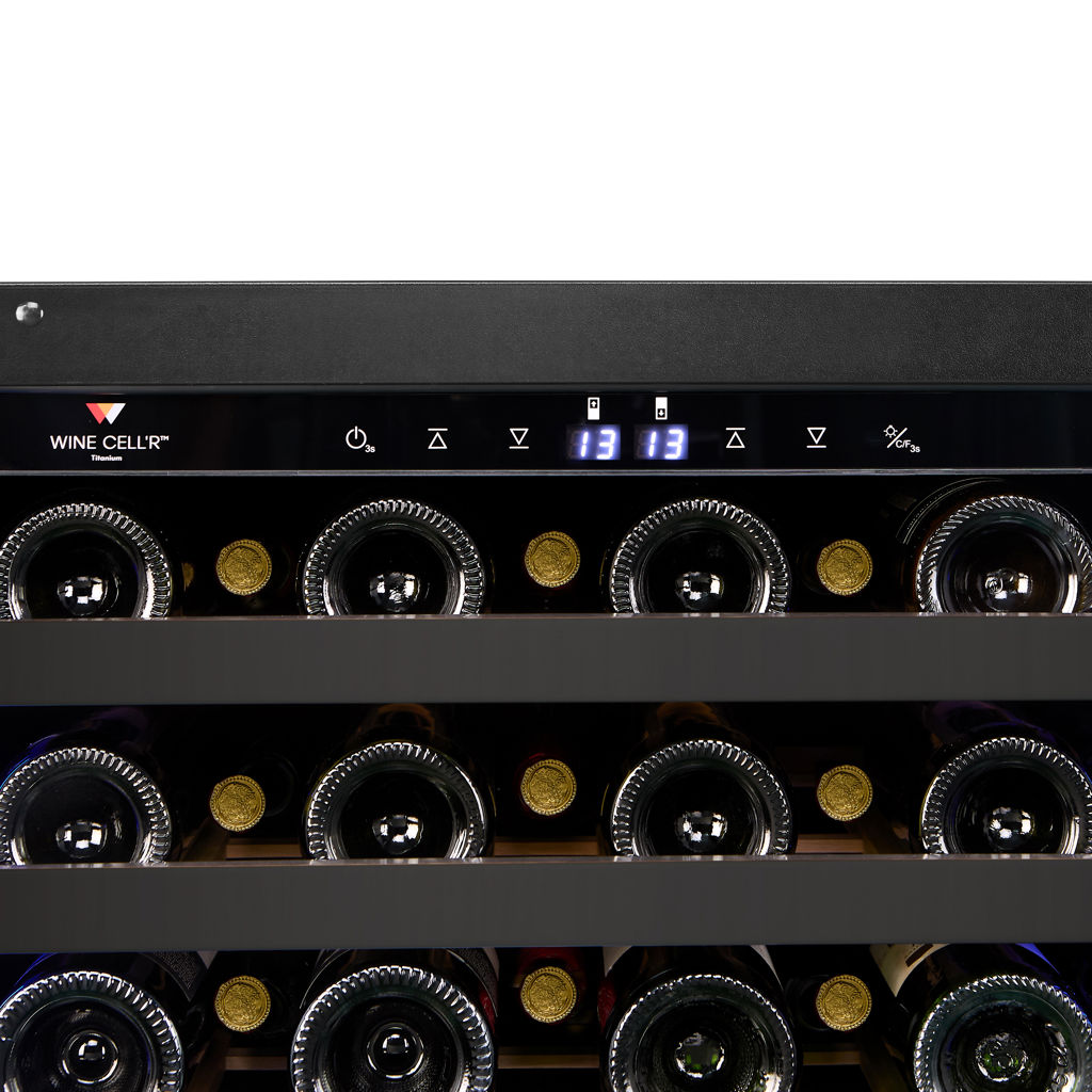 Five (5) ball-bearing shelves with gloss black stainless steel front. It features a 90% opening for better viewing and handling of your bottles. For the Titanium collection, Wine Cell'R returns with interior wooden shelves for better support of each bottle size.
