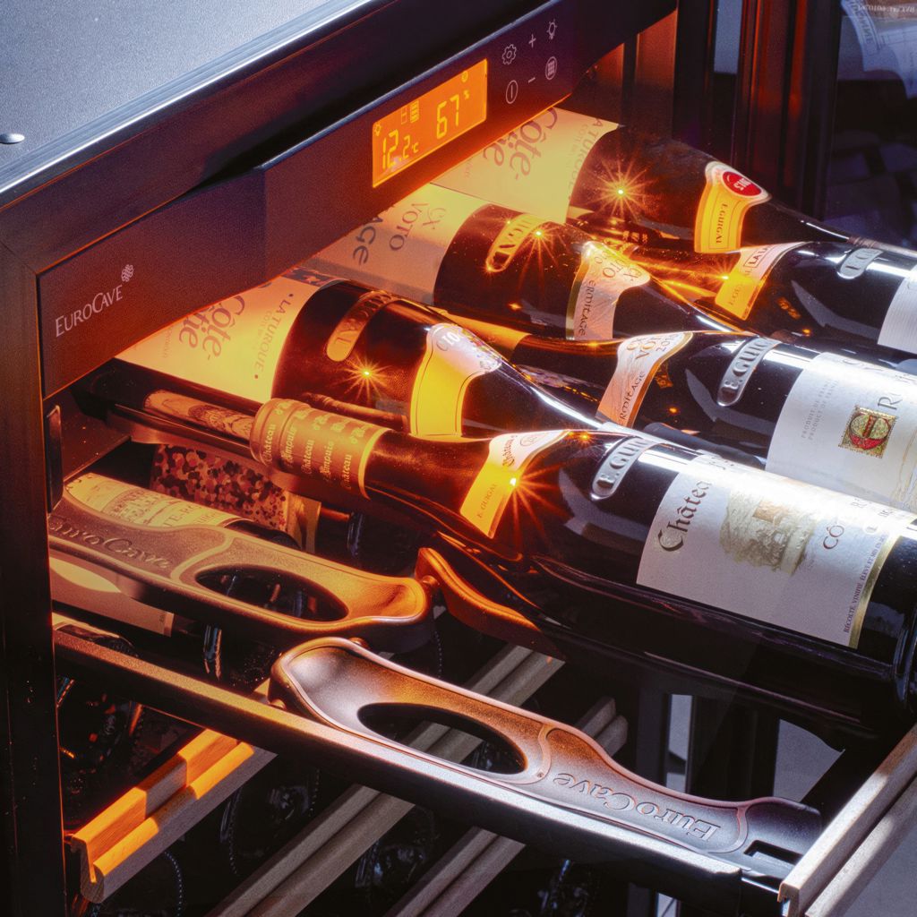 Darkness: Ultraviolet (UV) rays from both natural and artificial light are harmful to wine. That’s why EuroCave offers solid doors or double-pane UV-resistant glass doors to protect your bottles.