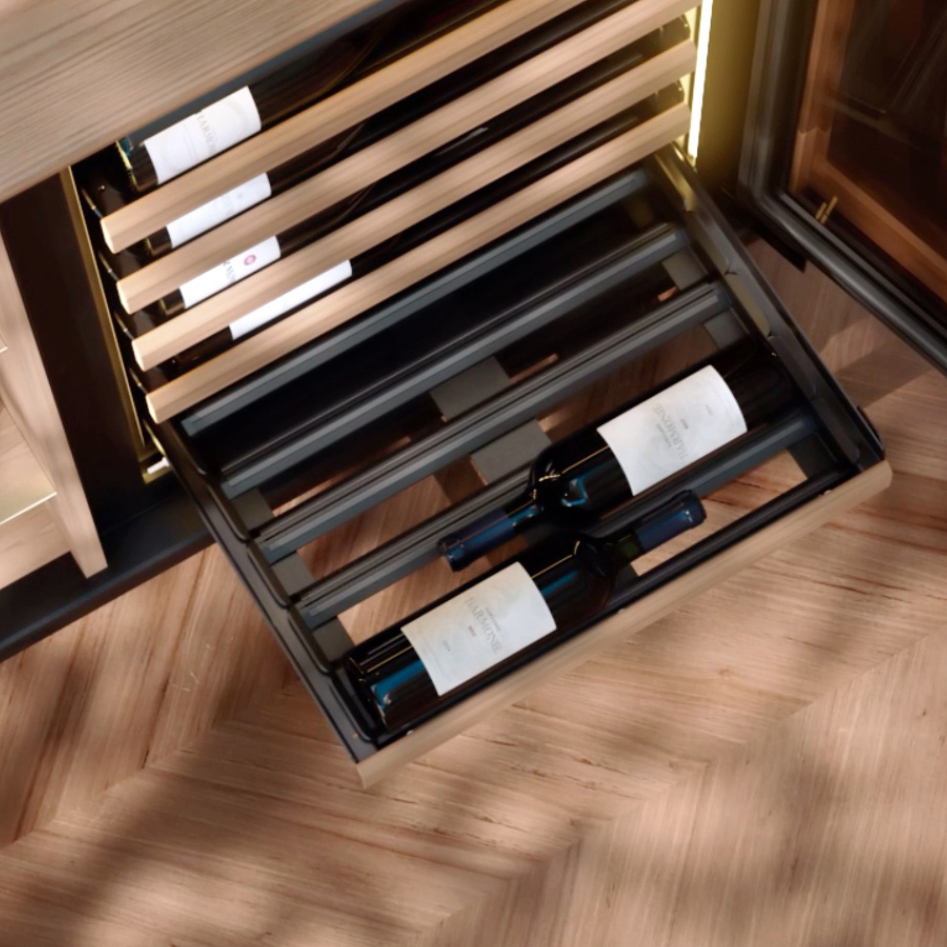 Its ingenious design features individual magnetic supports that make each shelf fully modular, while preserving the signature benefits of the iconic “Main du Sommelier.” Position them precisely to accommodate every bottle format: Alsace, Burgundy, Bordeaux, Magnums, Champagne, even cans.