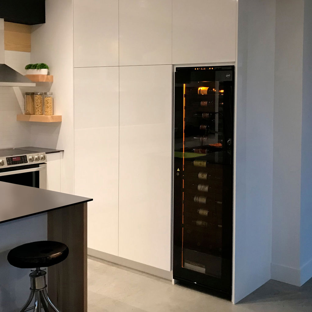 The EuroCave Inspiration Series large aging wine cellar has a frameless glass door and is equipped with visual alerts, automatic defrosting and a cold air circulating compressor.