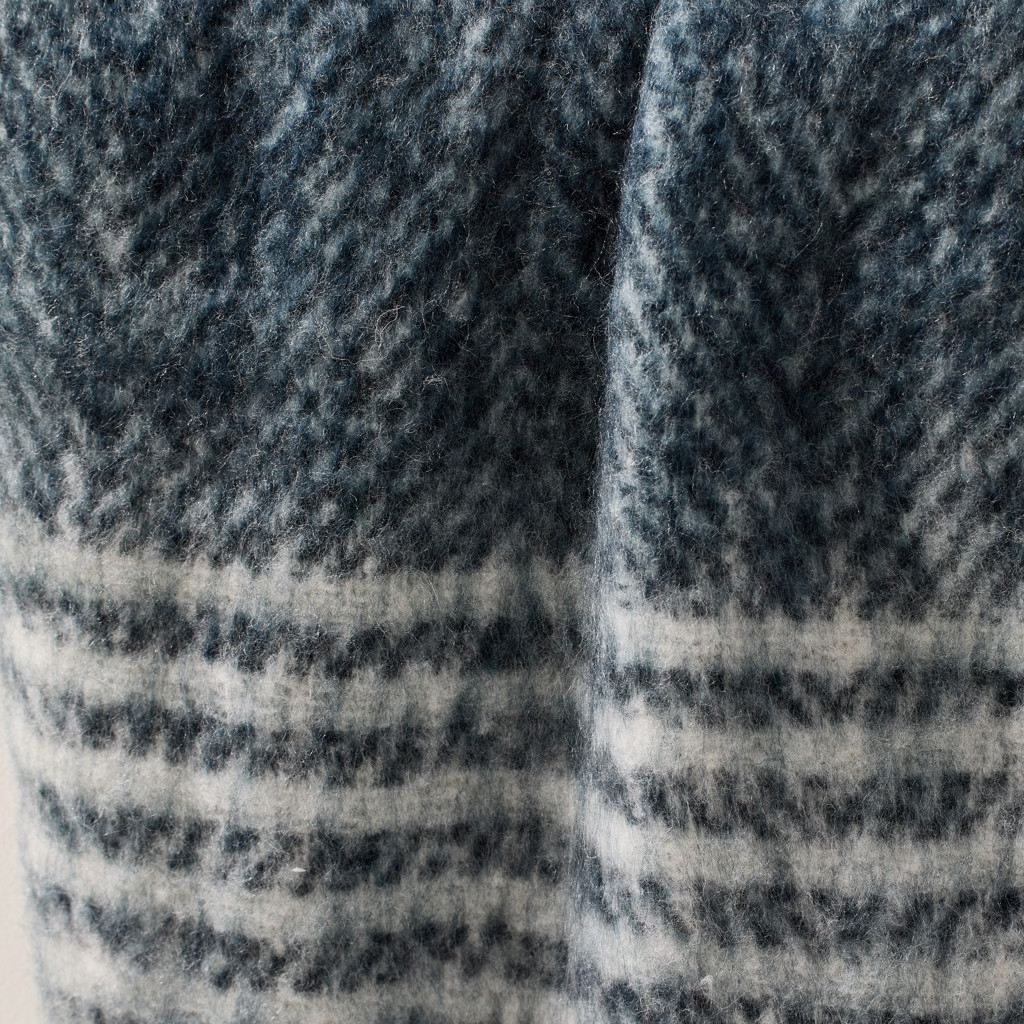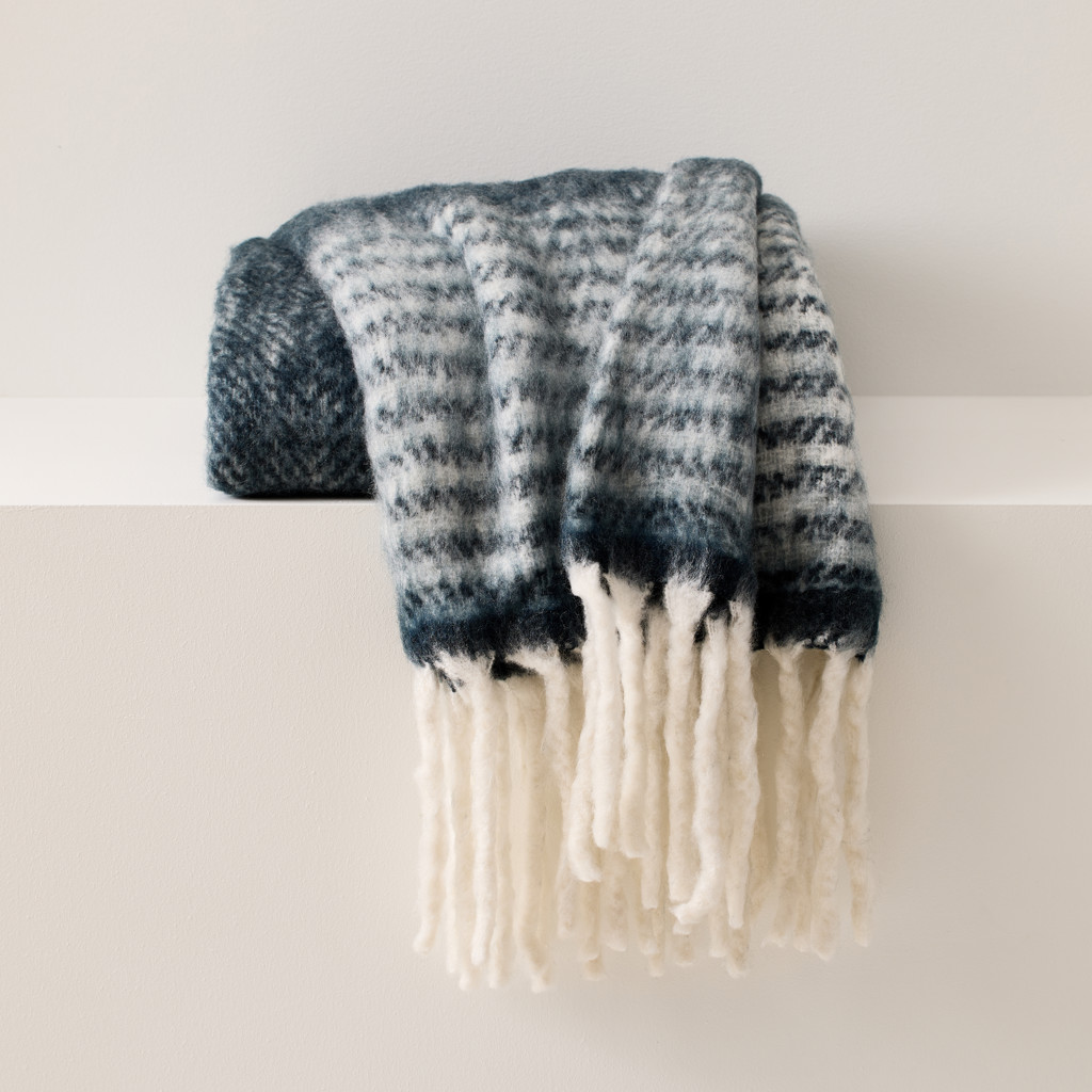 • Blue-grey 50" x 60" throw with white stripes and fringe.