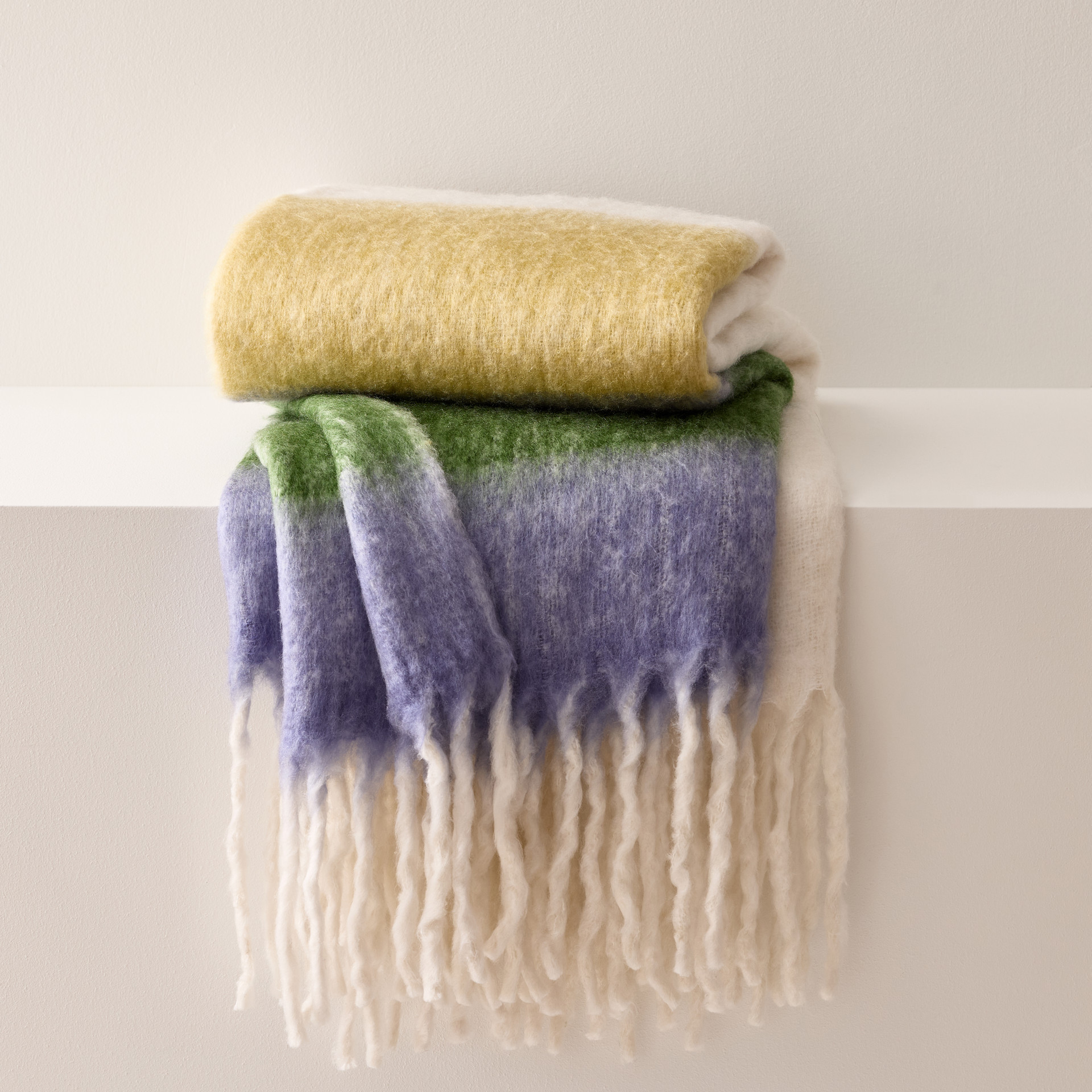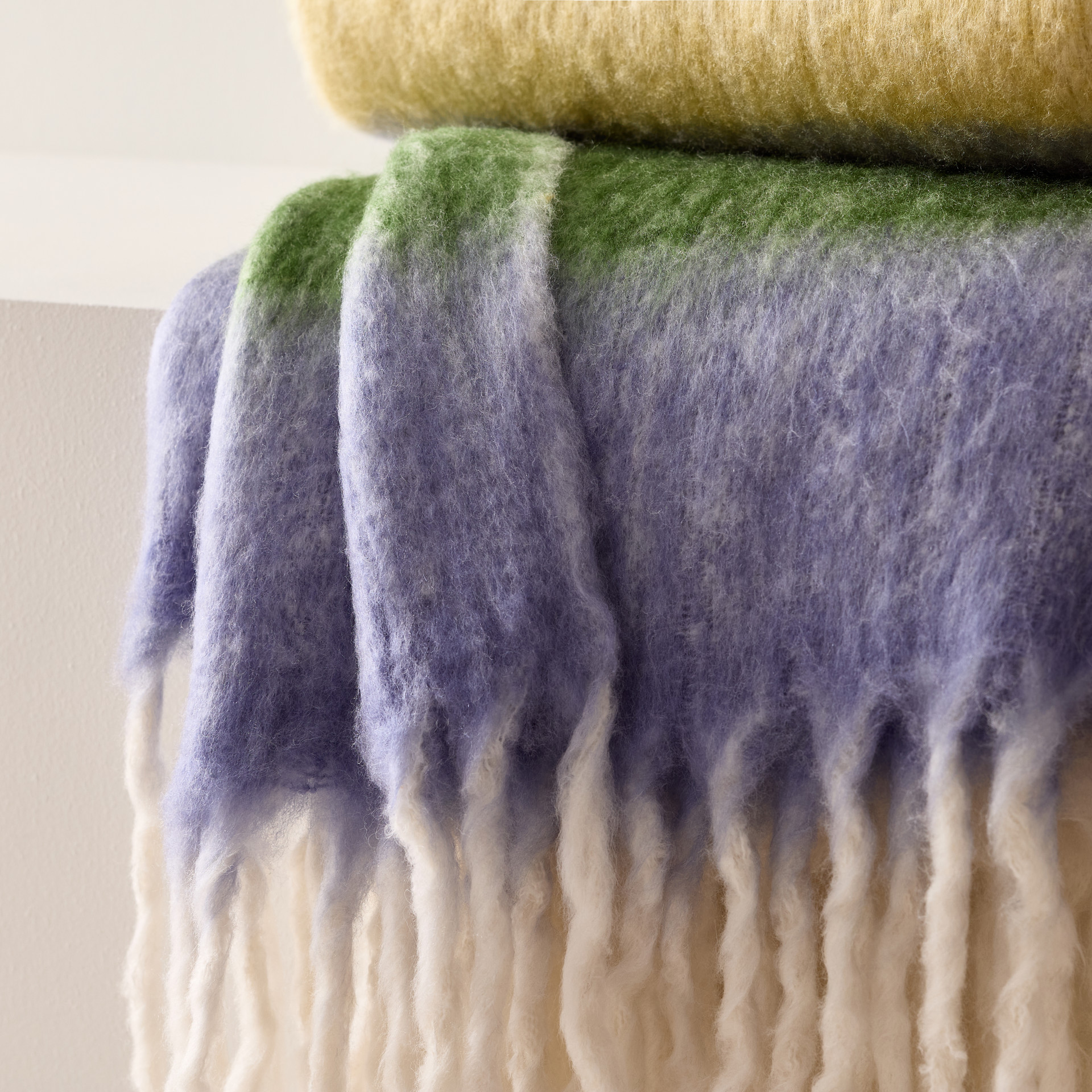 This acrylic throw features a smooth transition of colors from green to a pretty lilac, finishing in pure white, with detailed fringe at one end.