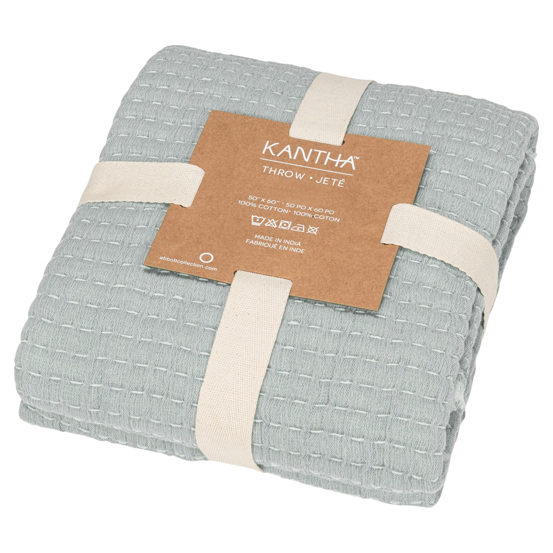 This soft blue cotton throw features visible overstitching for added texture and an artisanal finish.