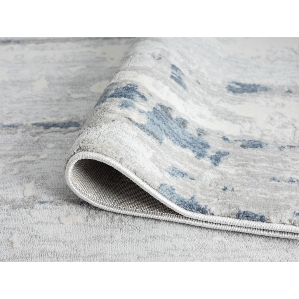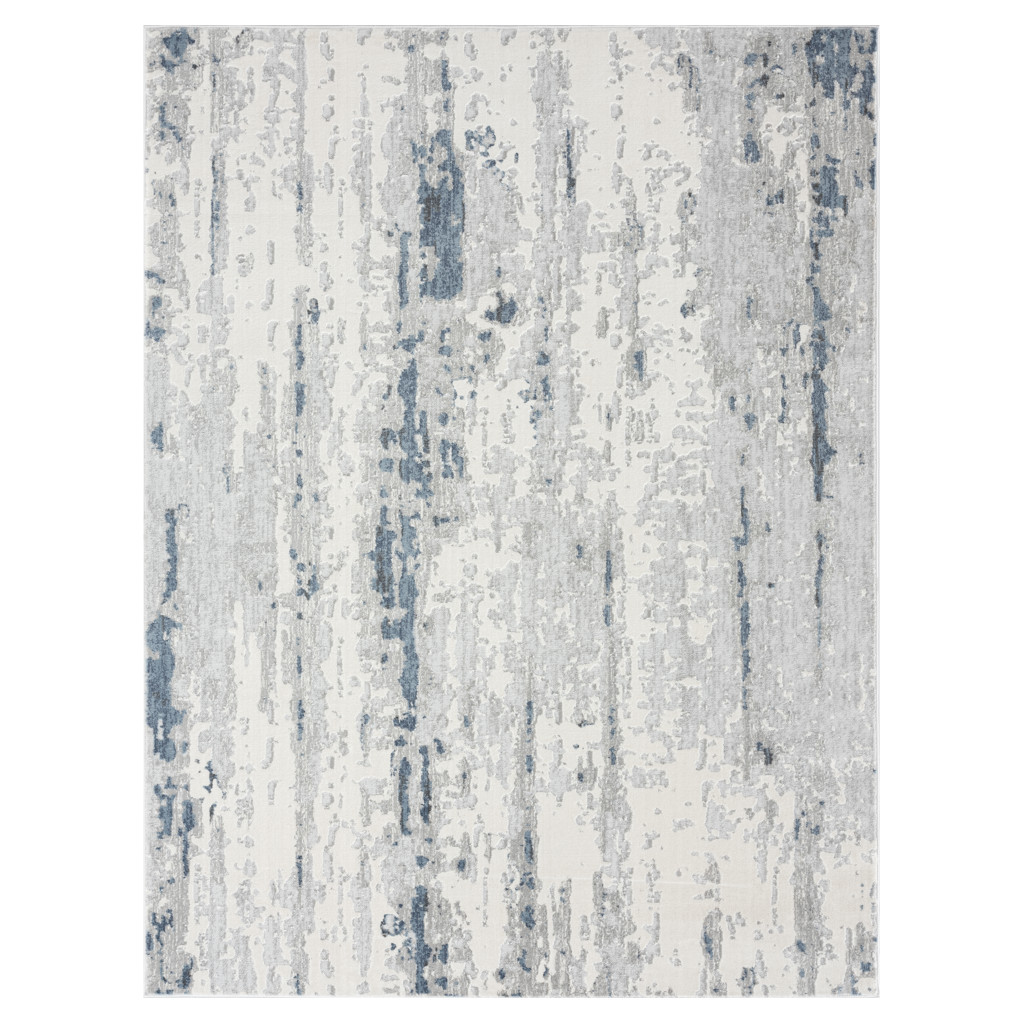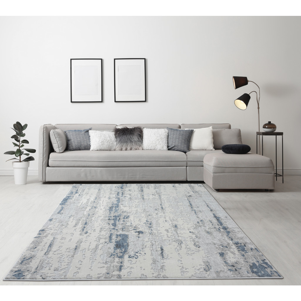 This indoor area rug features a modern design, with ivory, gray and blue hues to give your room an understated look that works with various styles from traditional to industrial.