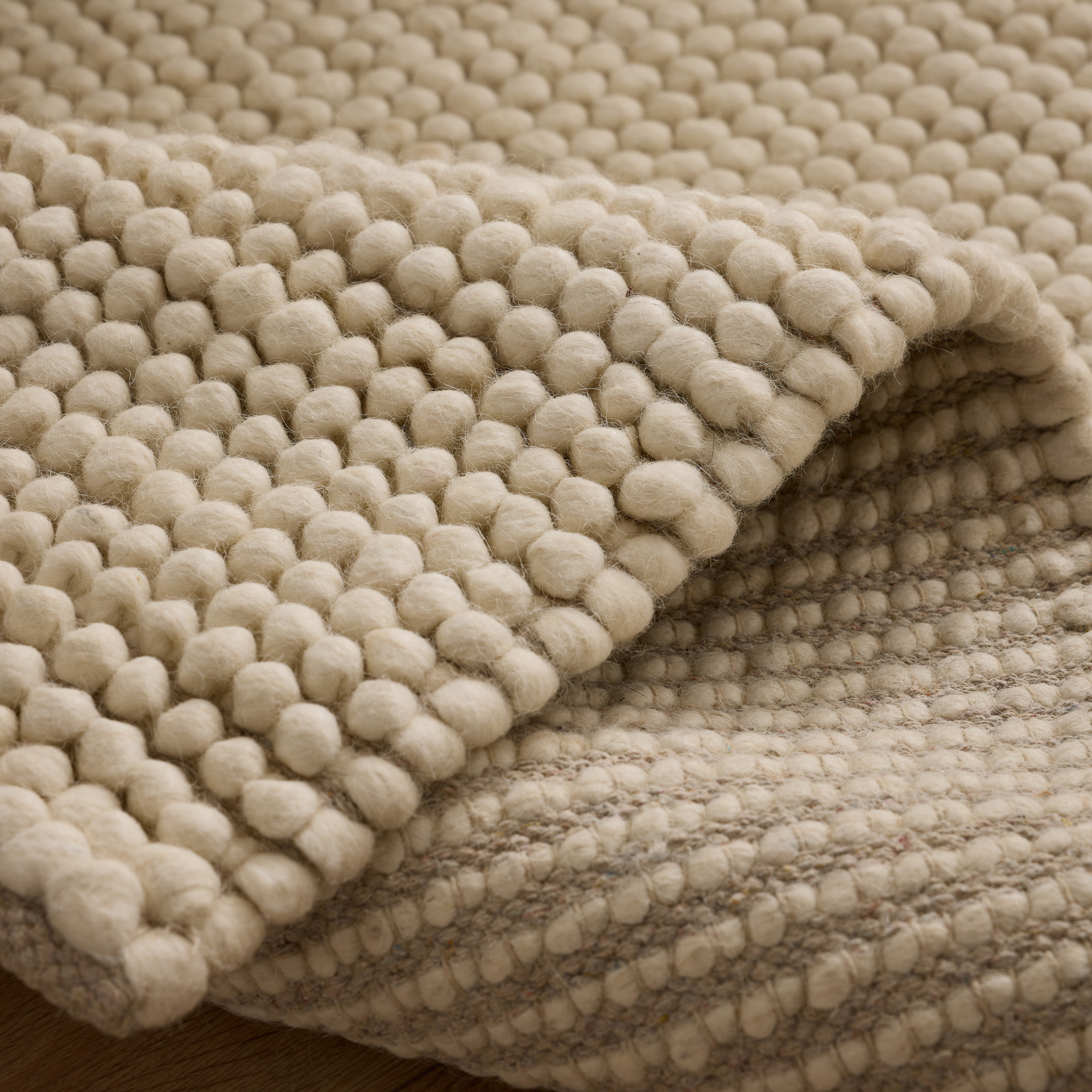 This rug showcases a luxurious texture with a modern pebble-like surface crafted from soft wool, providing an upscale appearance.