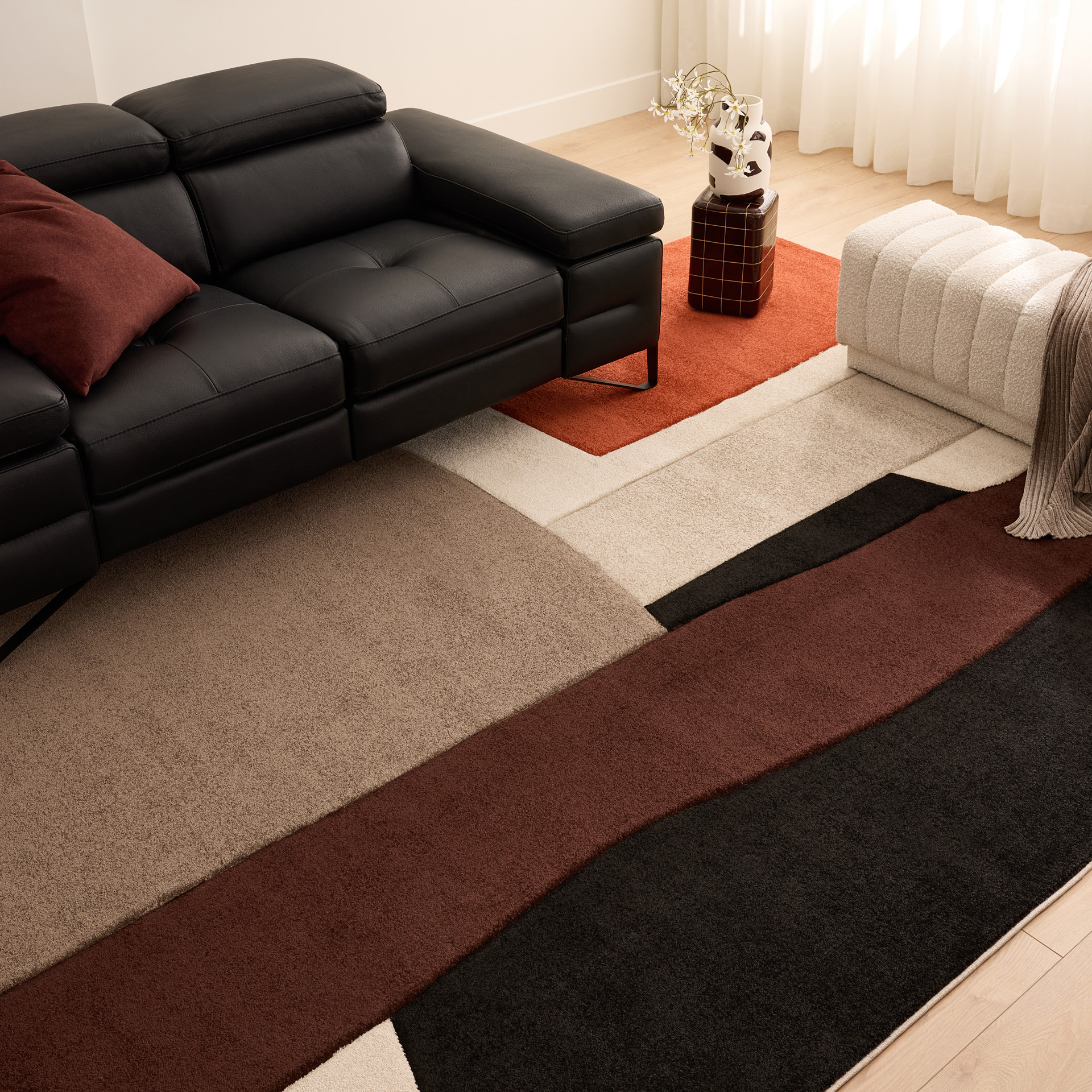 The Deco collection embodies the perfect blend of bold design and artistic geometry. Thanks to a rich texture and a unique sculpting method, each rug in this collection features a striking three-dimensional effect. The pile is carefully sheared from bottom to top, revealing a pattern sculpted directly into the material, for a dynamic rendering that catches the light and the eye.