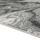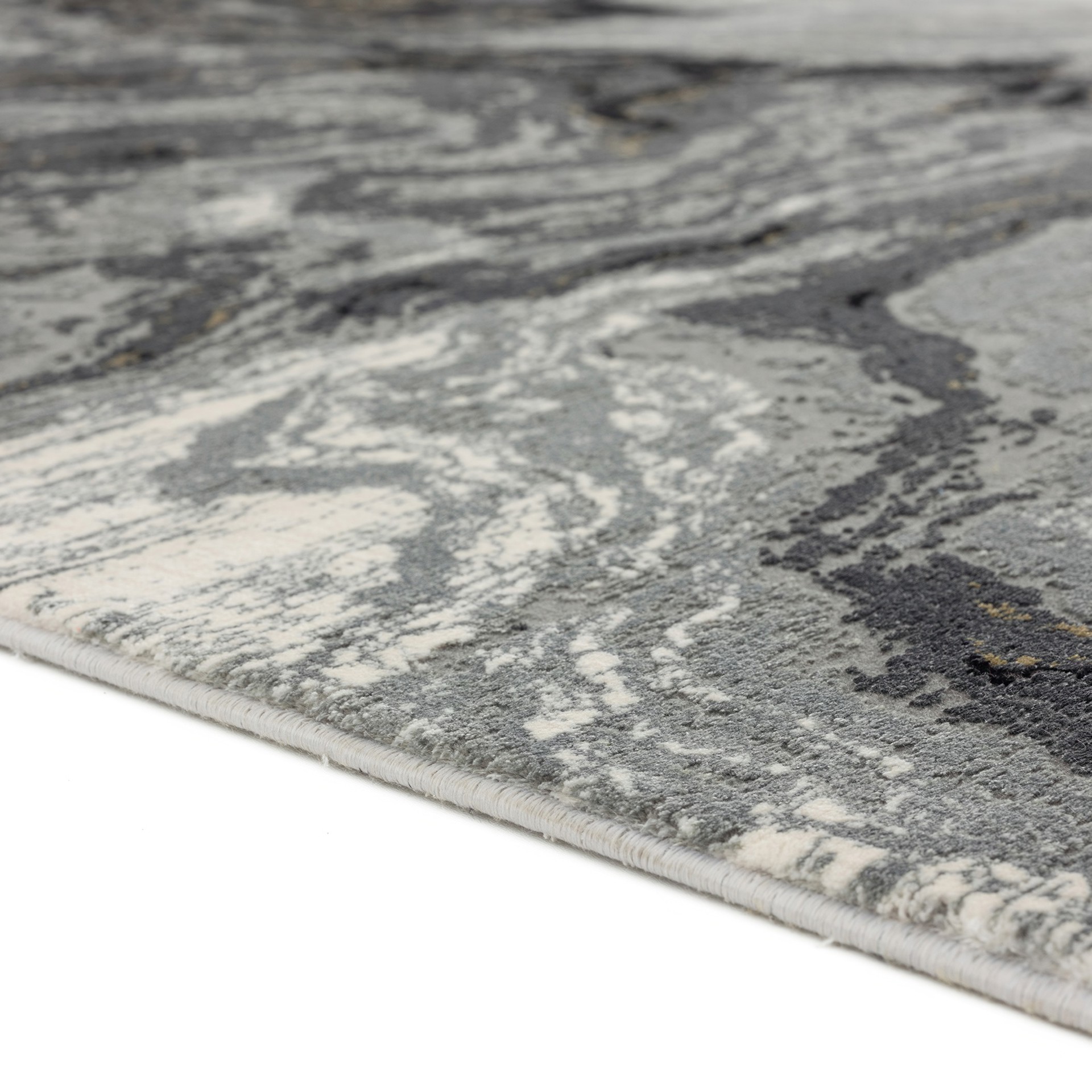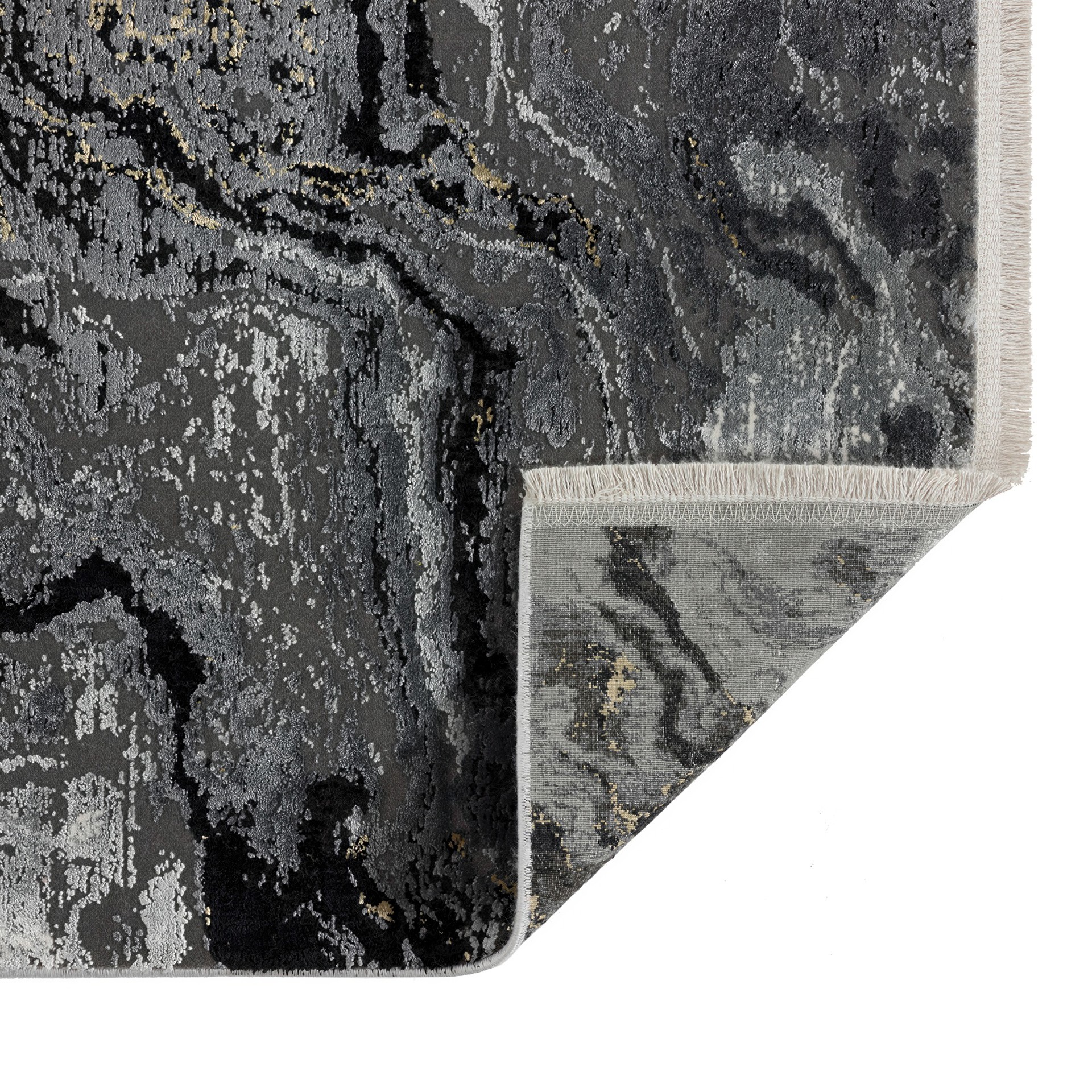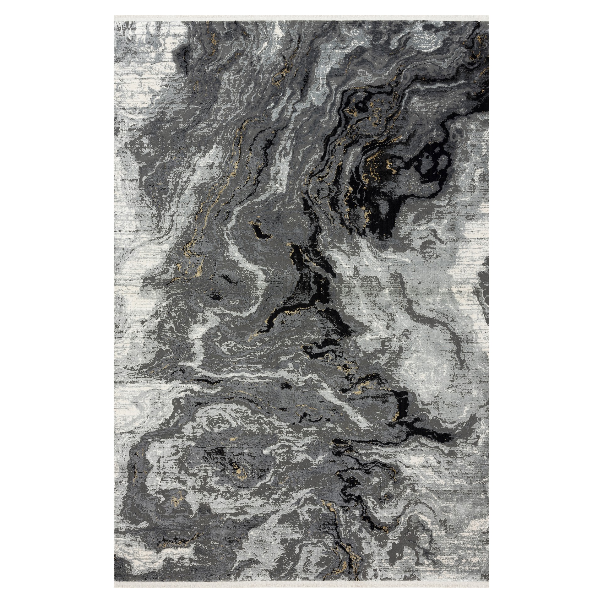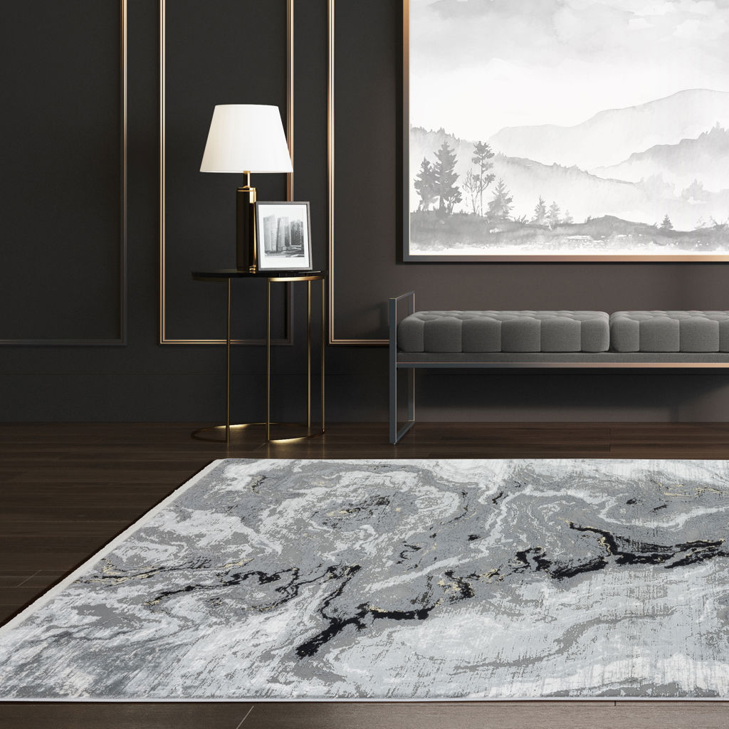 Abstract and elegant, this rug features a sophisticated marbled pattern in shades of grey, black, and gold, perfect for enhancing any contemporary interior.