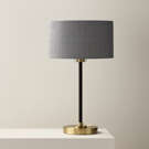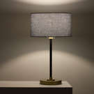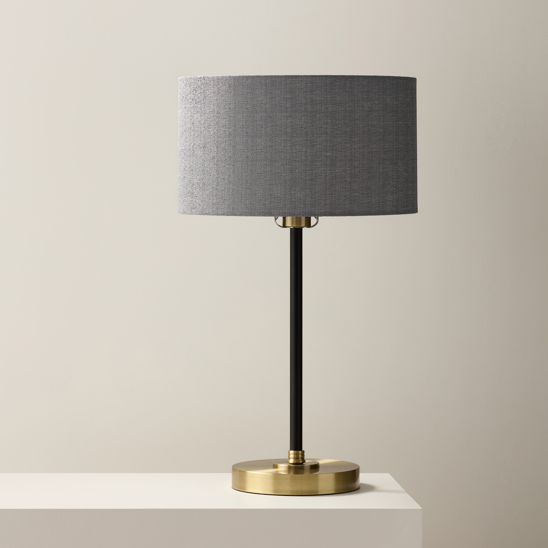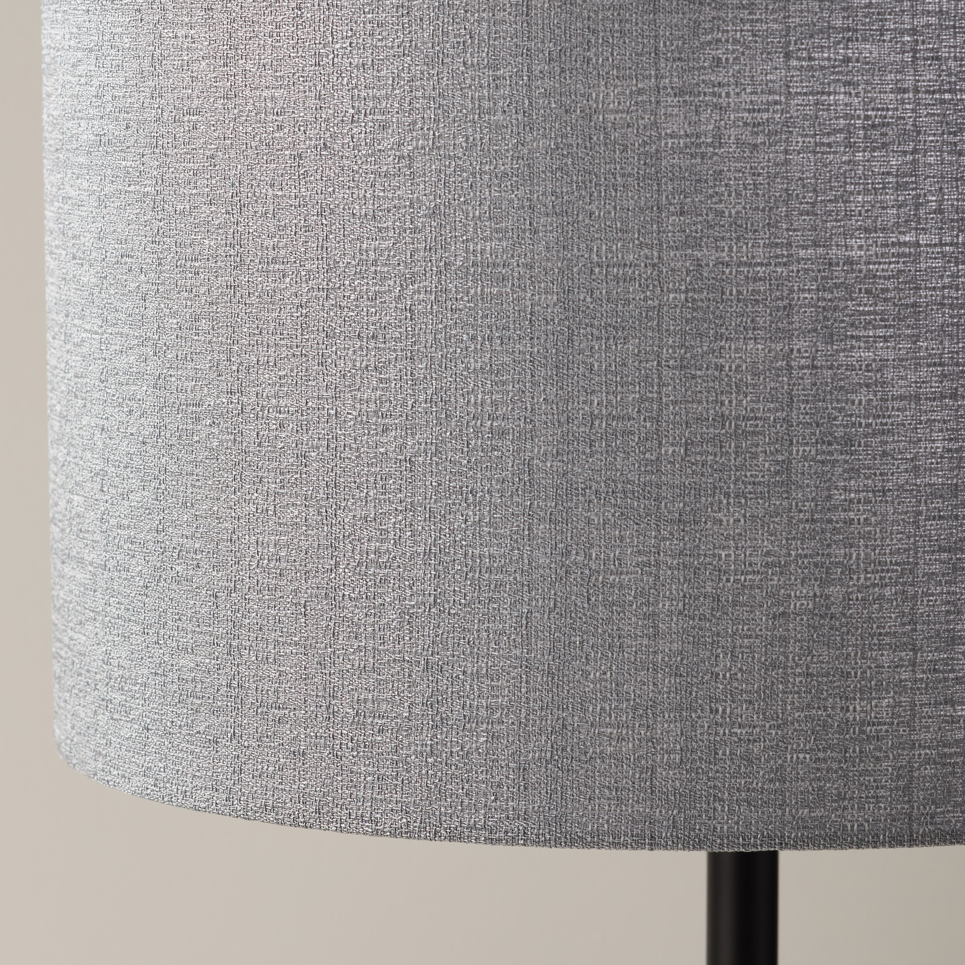 A soft, gray fabric shade reveals a delicate texture when lit. The cord is clear and discreet.
