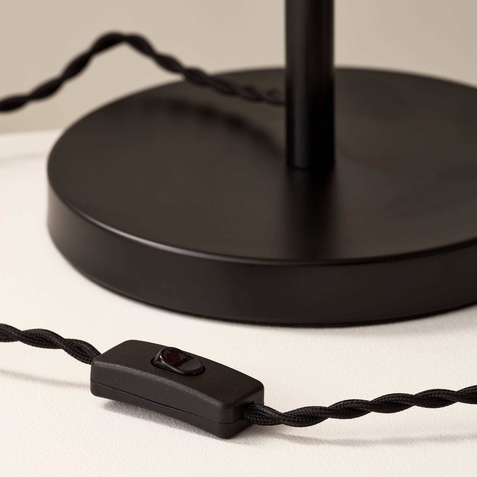 The sleek black steel base includes an accessible hand switch and a black fabric power cord for an added element of texture.