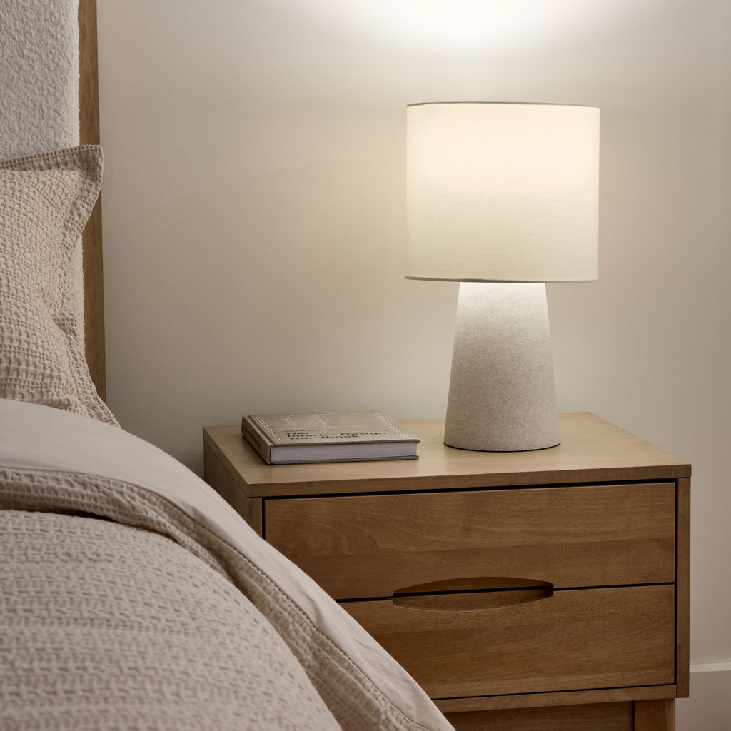 At the top sits a drum-style linen shade in a creamy white tone that filters the light from a 60 W bulb (sold separately).