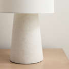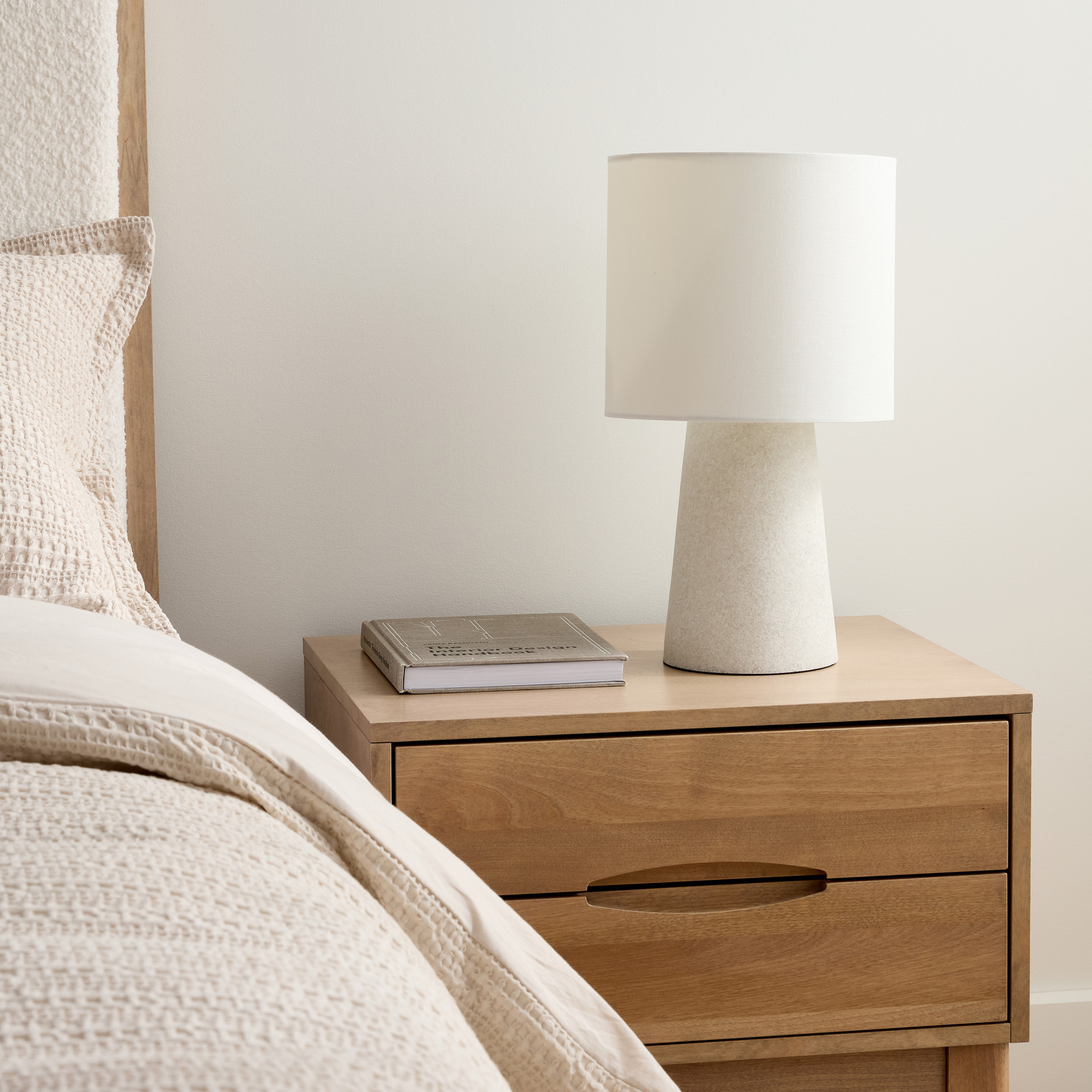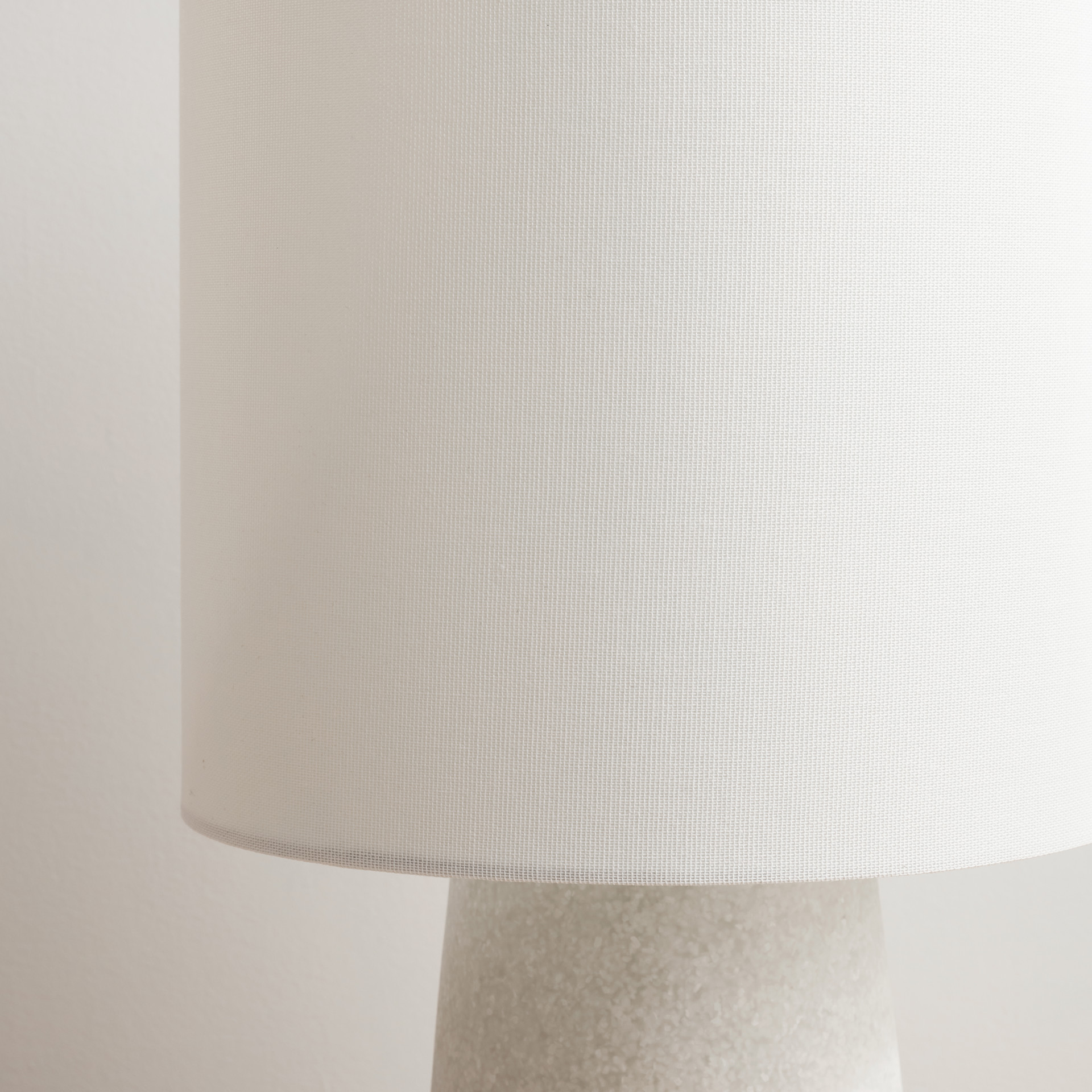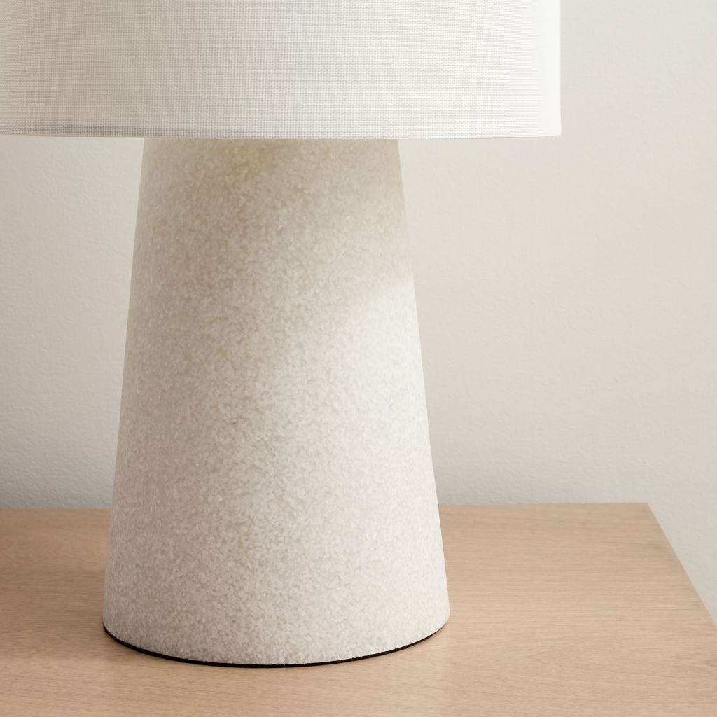 This table lamp grounds your space with a blend of rustic and industrial style, thanks to its solid, textured stone base. It features a geometric conical silhouette in a classic off-white textured finish for a modern touch.