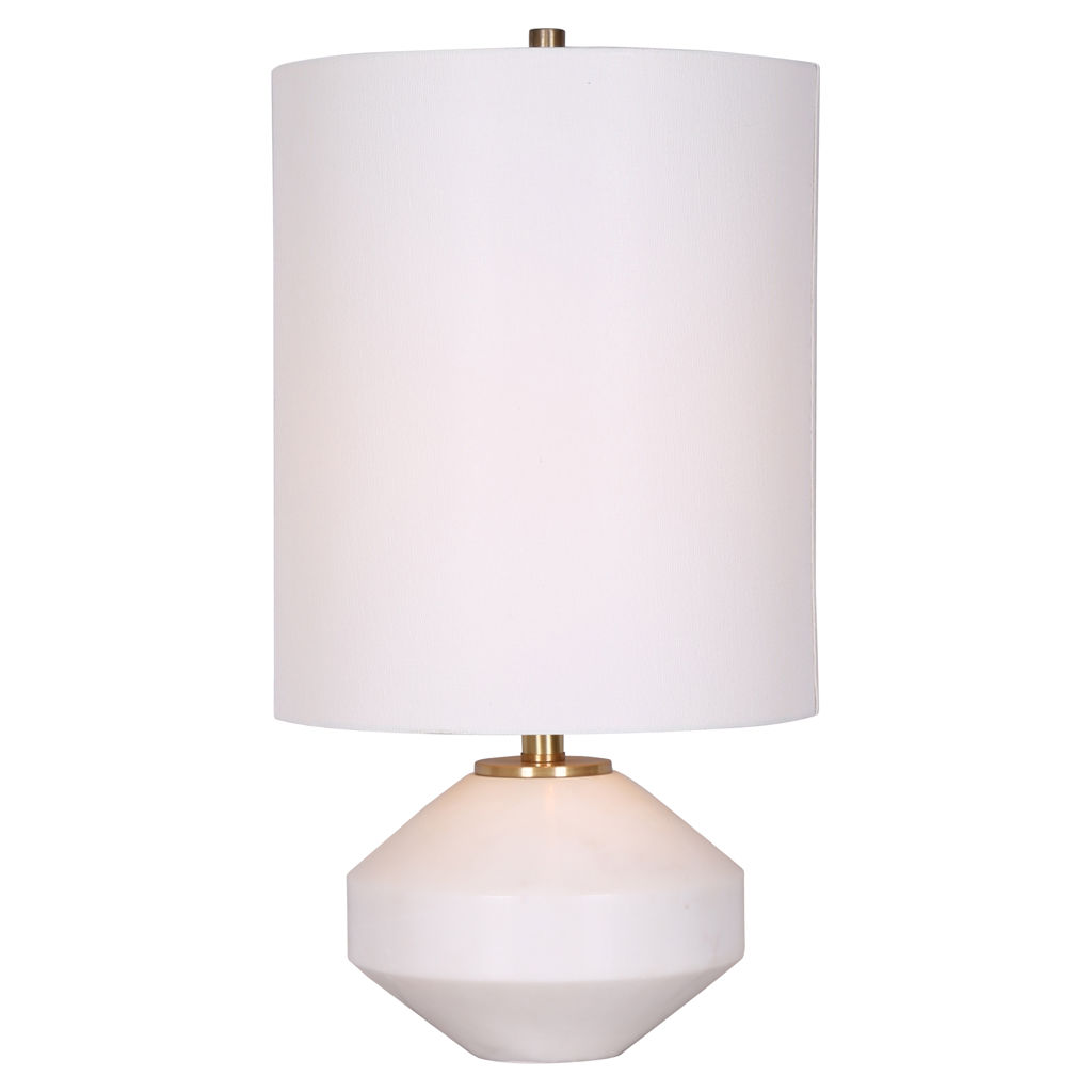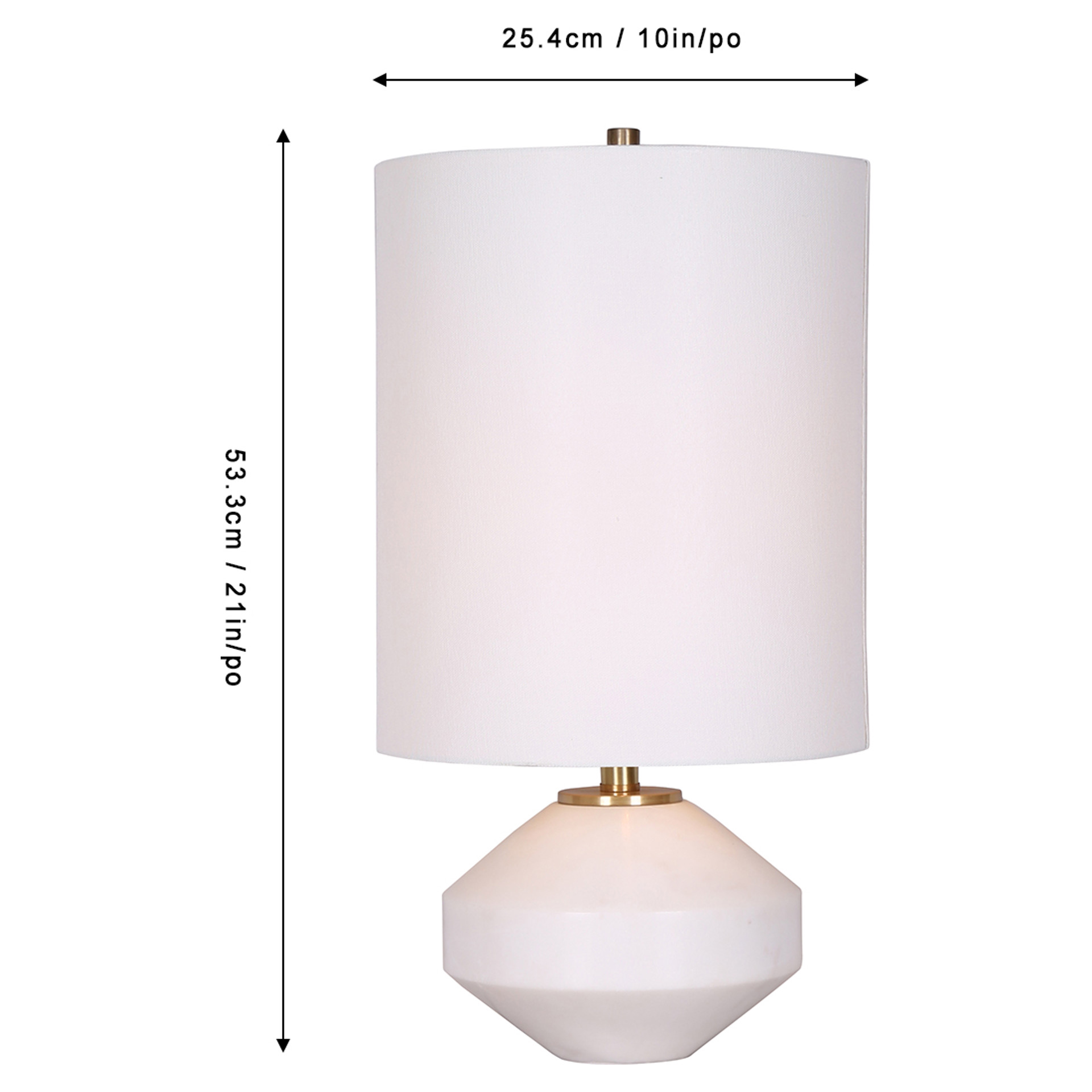 It is paired with a shade in a beautifully luminous hue; it blends perfectly with the geometric shape of the hand-cut solid marble lamp body. This lamp creates a beautiful aesthetic balance in your décor, adding classic contemporary style and design to any room.