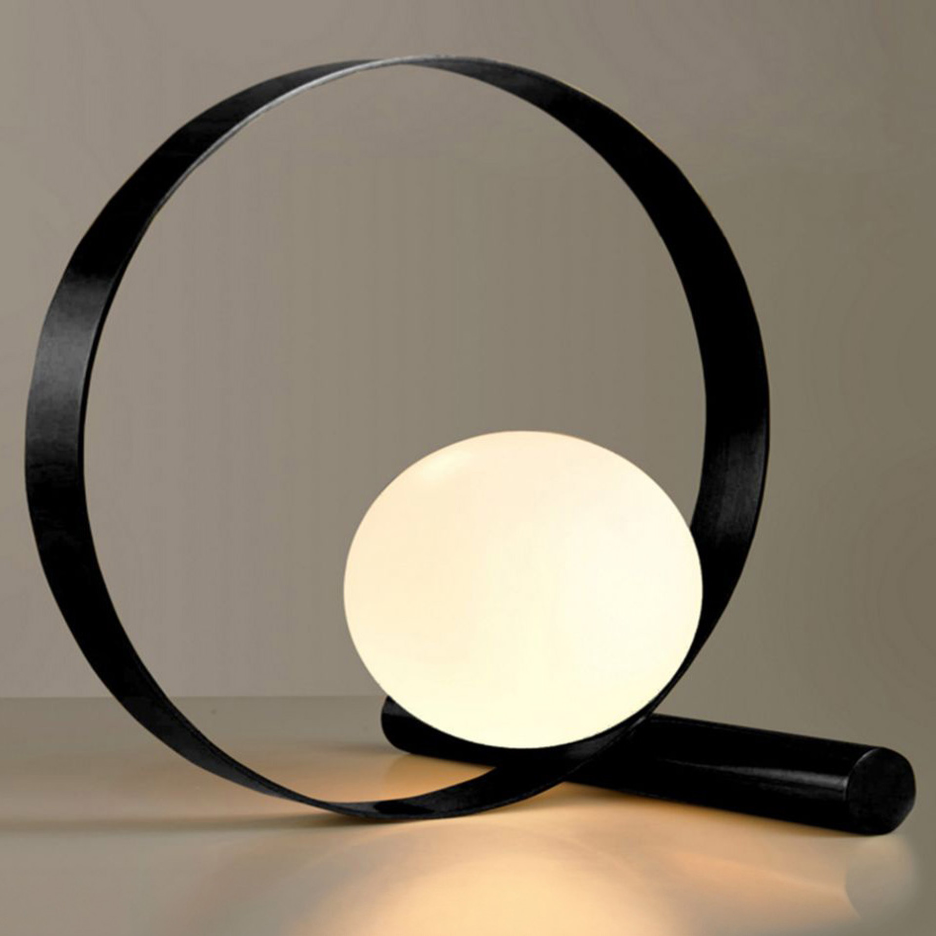 This table lamp reinvents the art of composition with its black metal ring delicately framing an opal-glass globe. A captivating visual tension emerges from the seemingly fragile balance between the rigid structure and the gentle sphere.