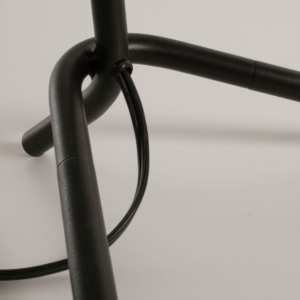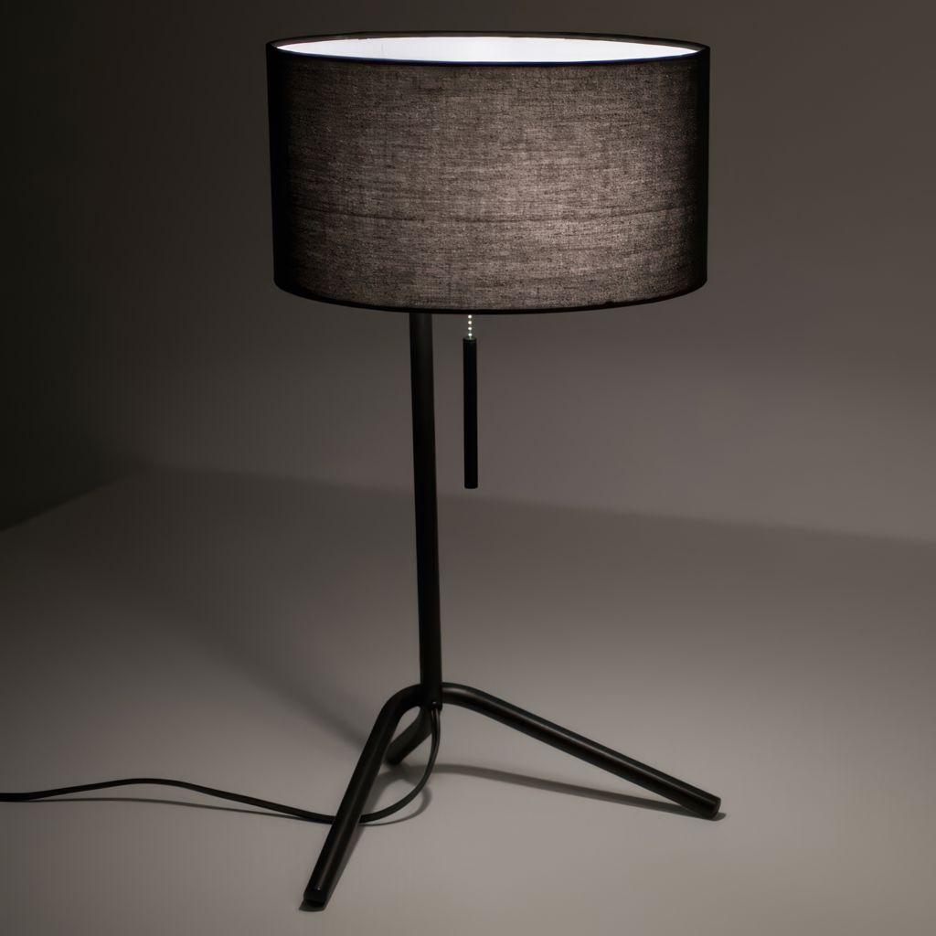 This table lamp stands out with its black metal base featuring asymmetrical lines that evoke a sculptural tripod. Three splayed legs create a stable yet dynamic stance, while the slender central post supports the shade with elegance.