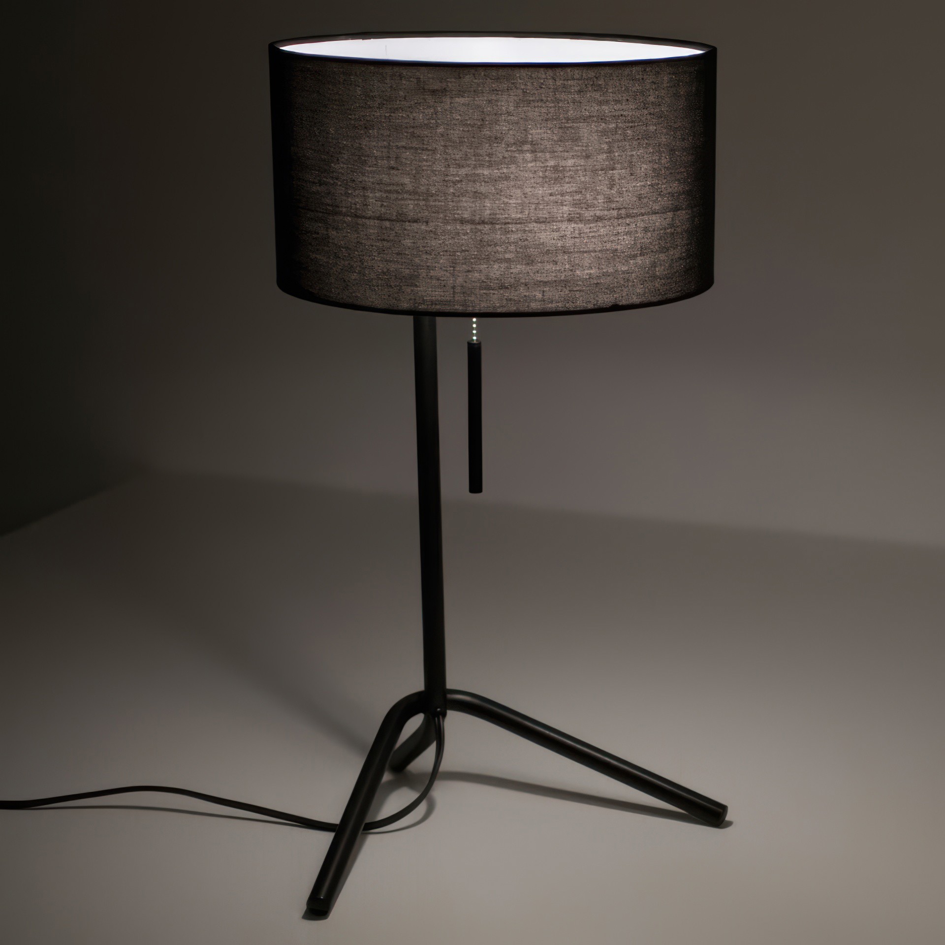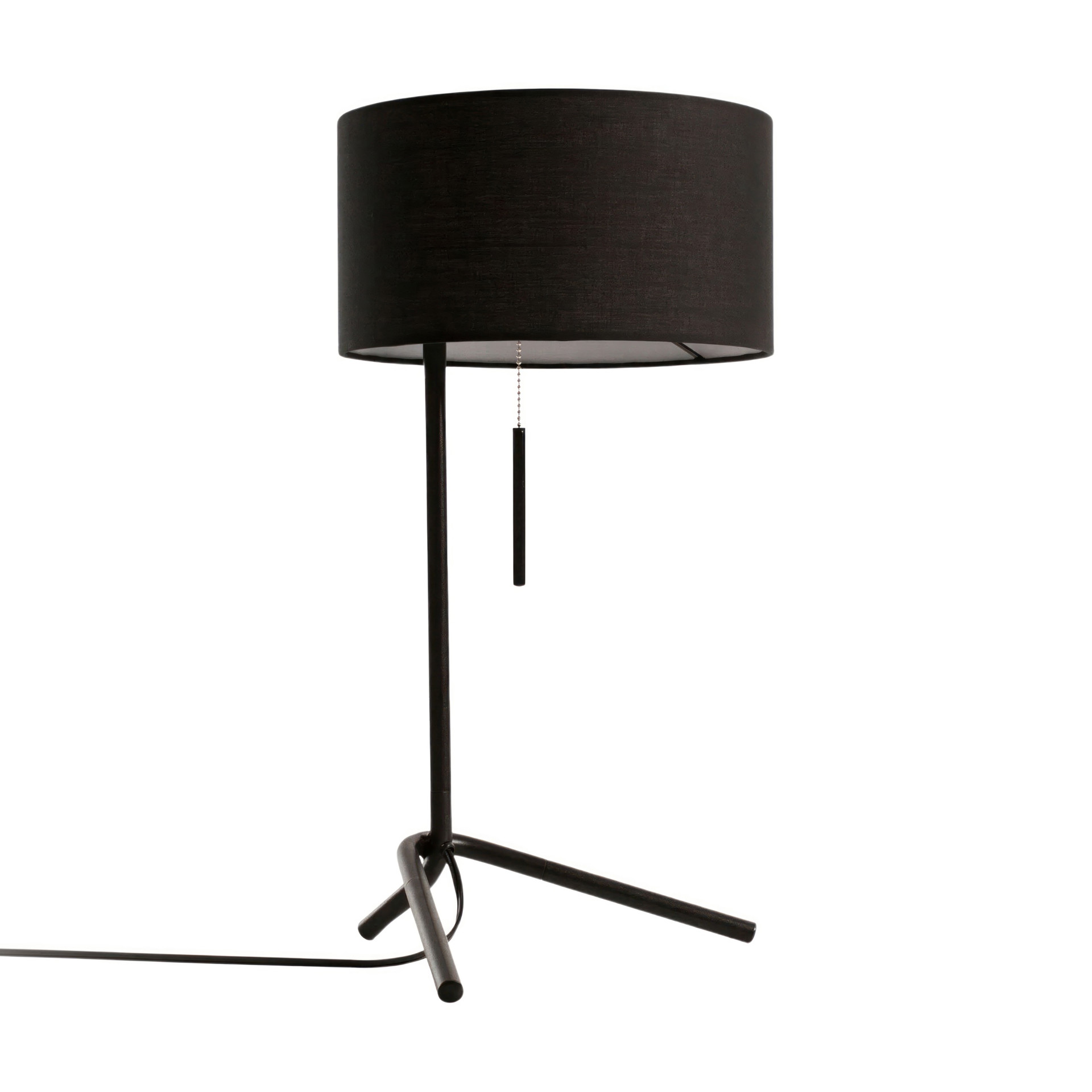 The generously sized cylindrical fabric shade in black directs light downward, perfect for reading or working, while also creating an intimate ambiance. The convenient pull chain offers easy control, adding a refined touch to the overall design.