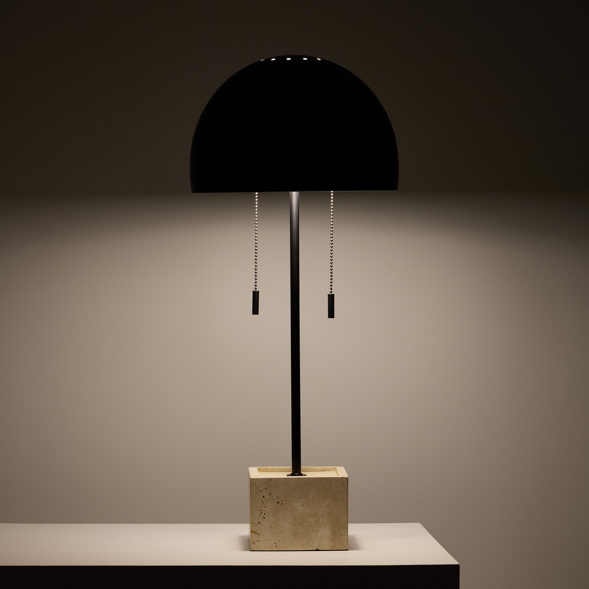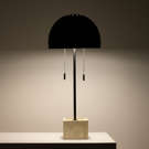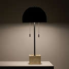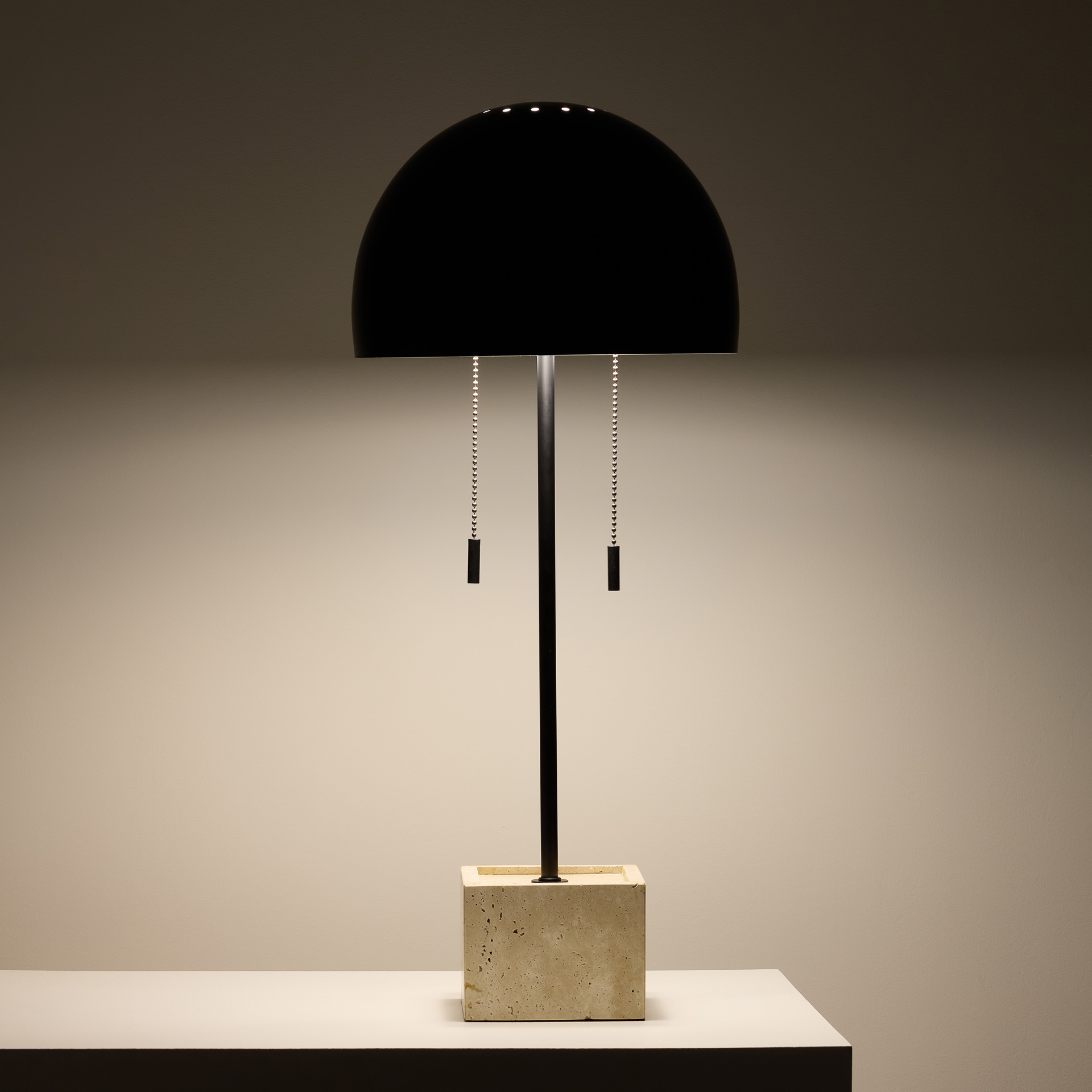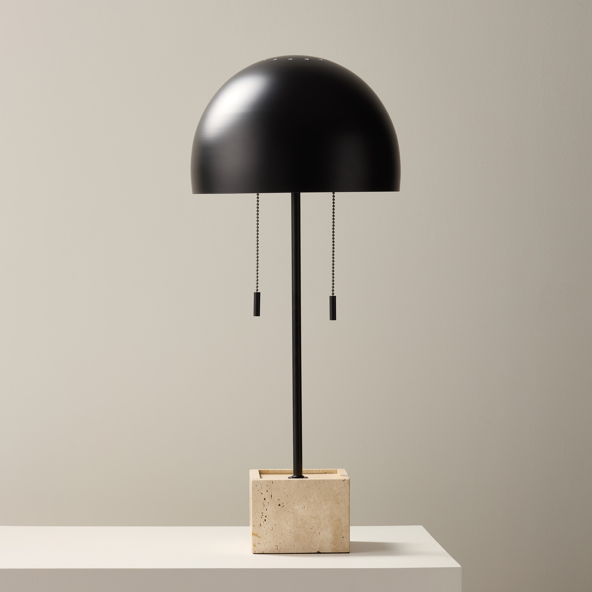 This lamp, finished in bold black, commands attention with its distinctive black dome-shaped metal shade.