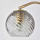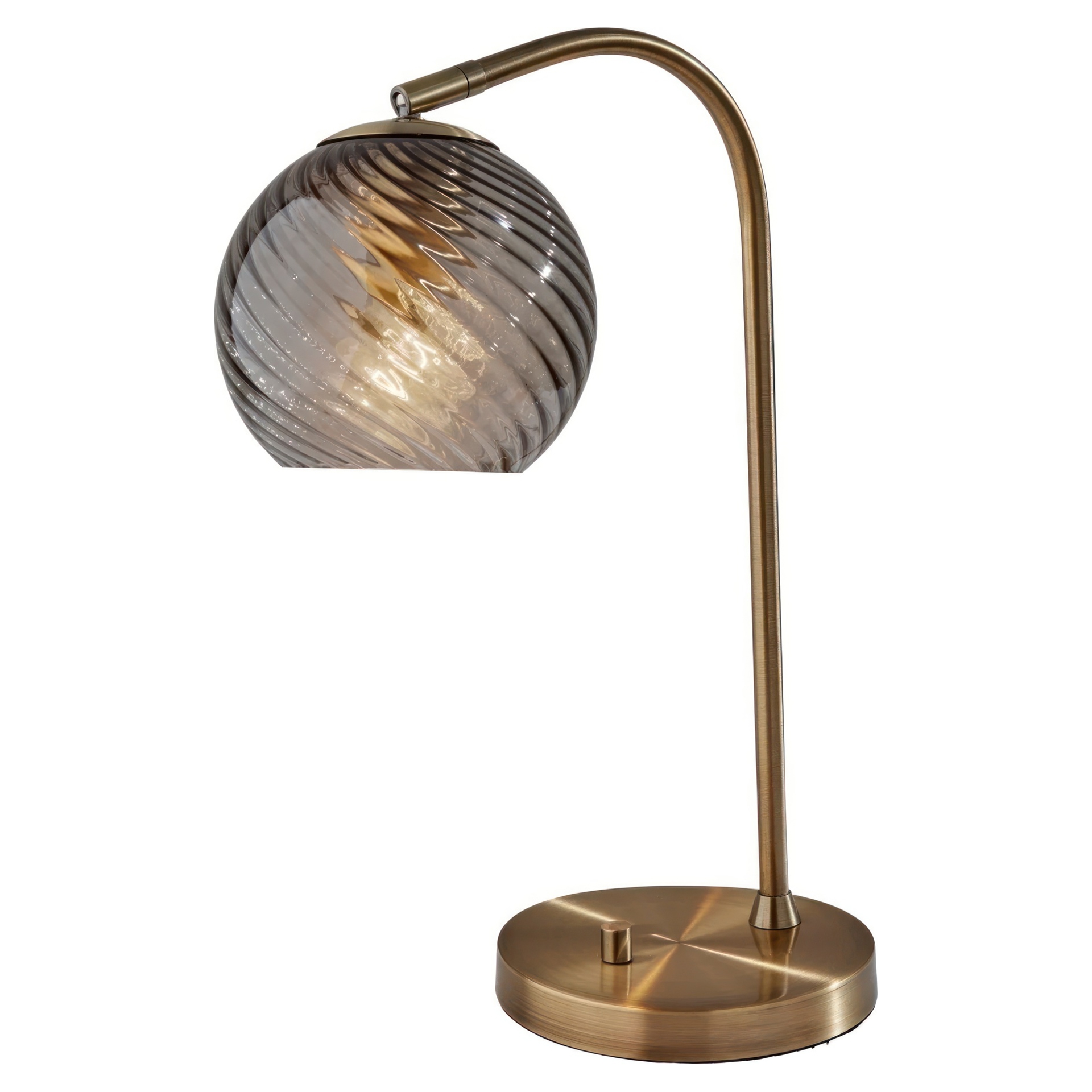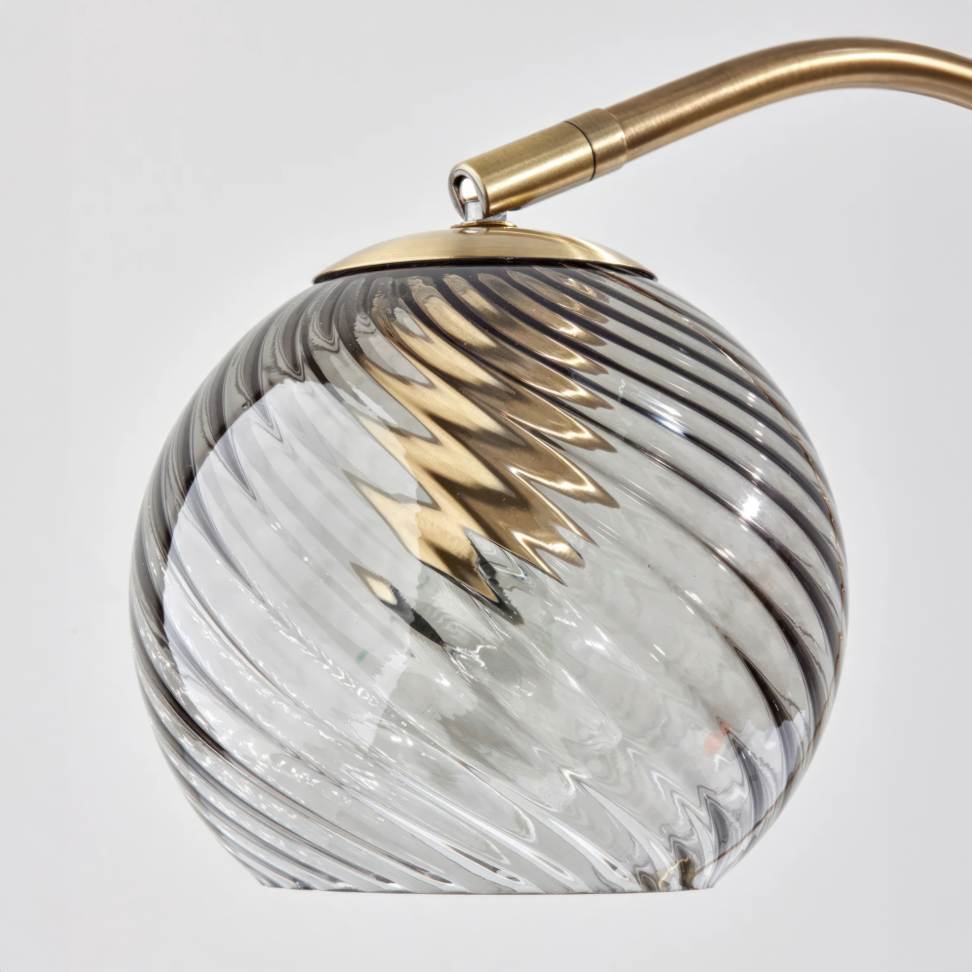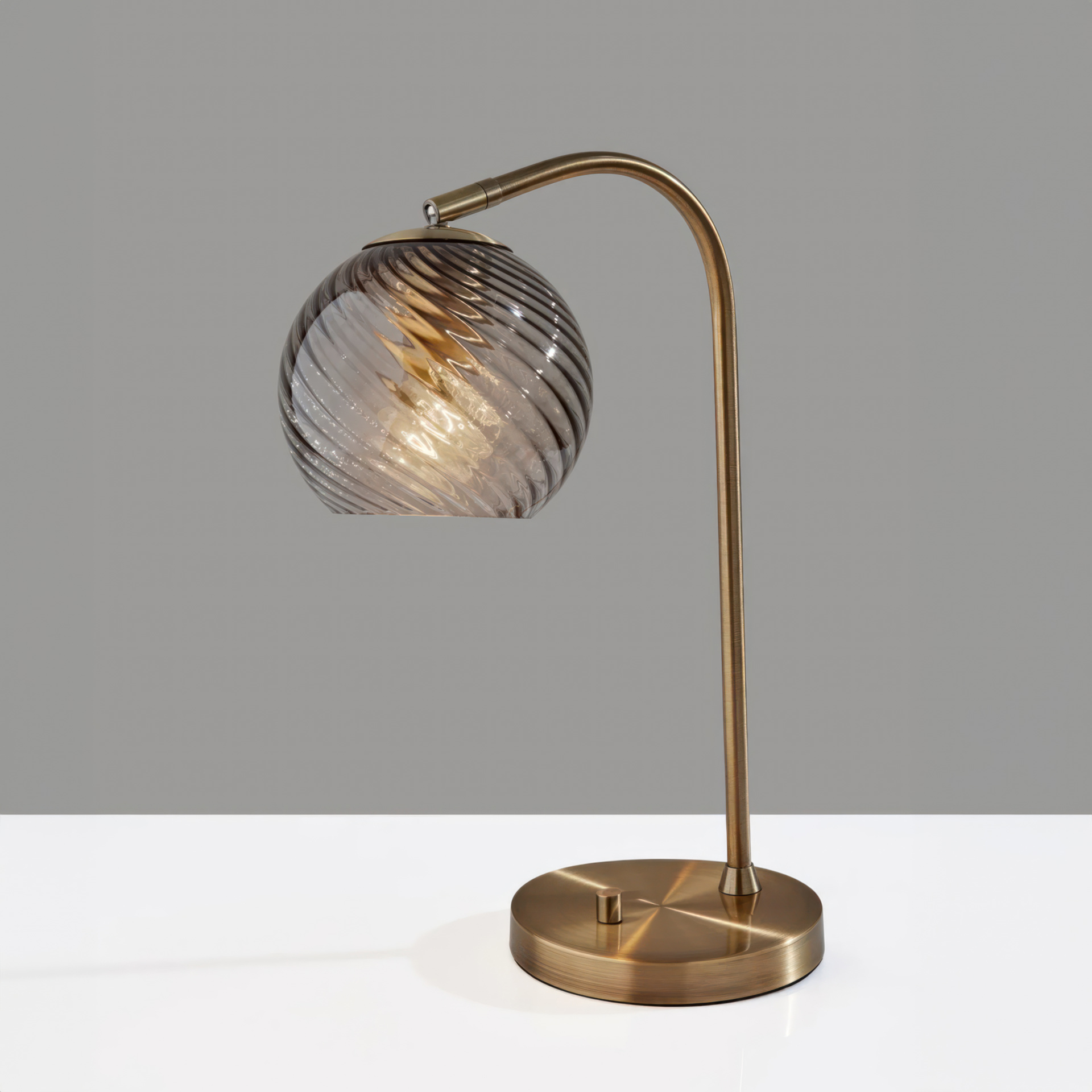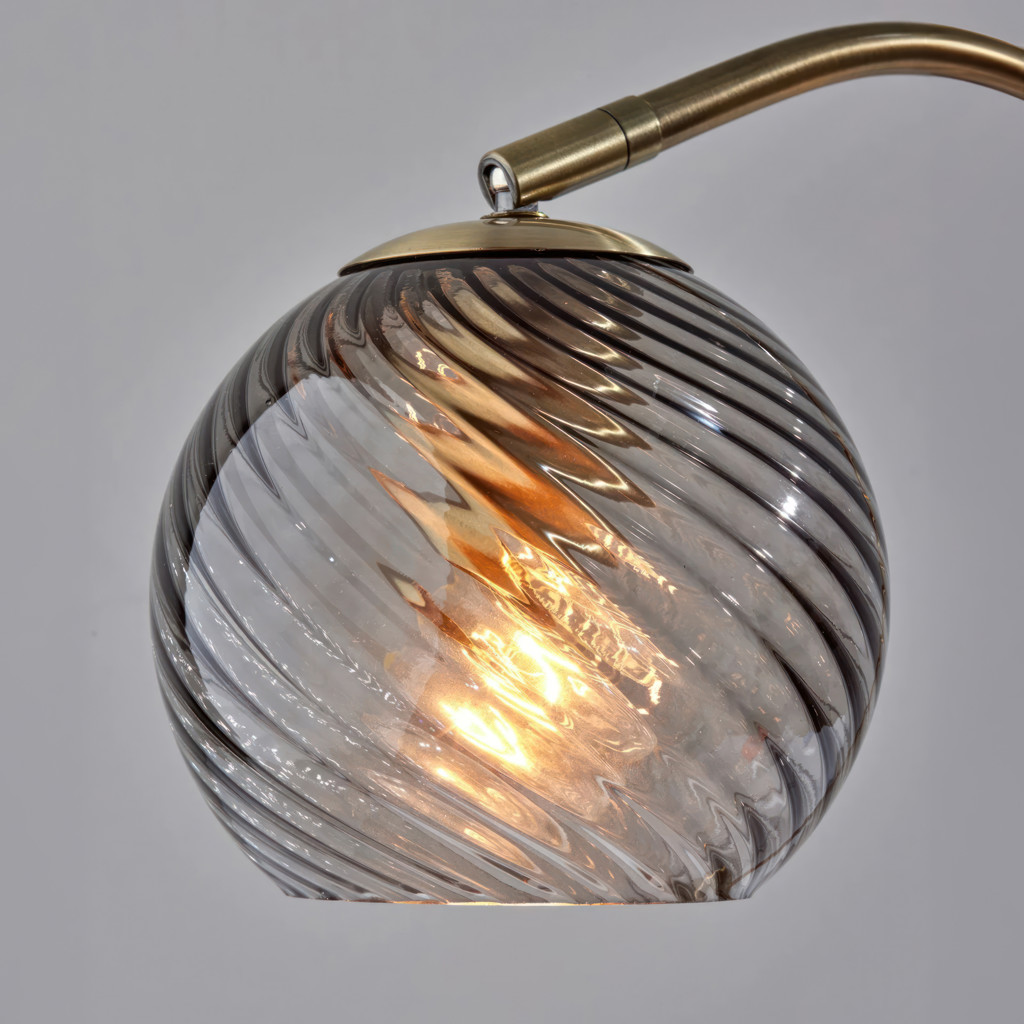 A round base with an antique brass finish supports a matching gently arcing stem. Suspended from the stem is a 6.5" diameter globe shade crafted of smoked glass with a delicate swirl pattern.