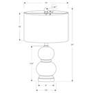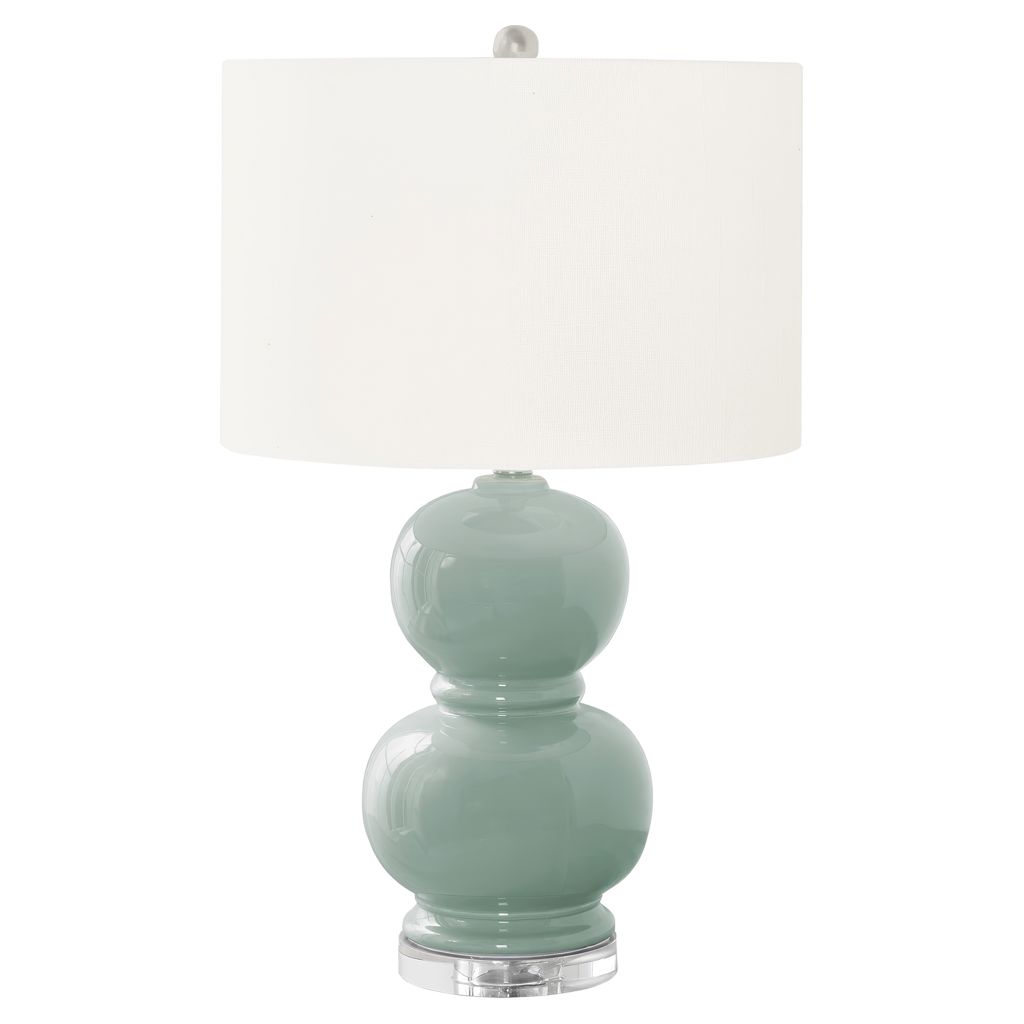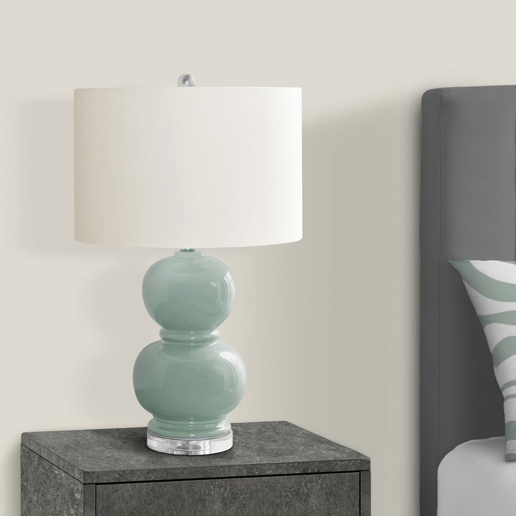 Brings some freshness to your space with this stylish 25"h table lamp in a soft blue ceramic in a double gourd shape, mounted on a clear acrylic crystal-like base with a contemporary drum ivory shade.