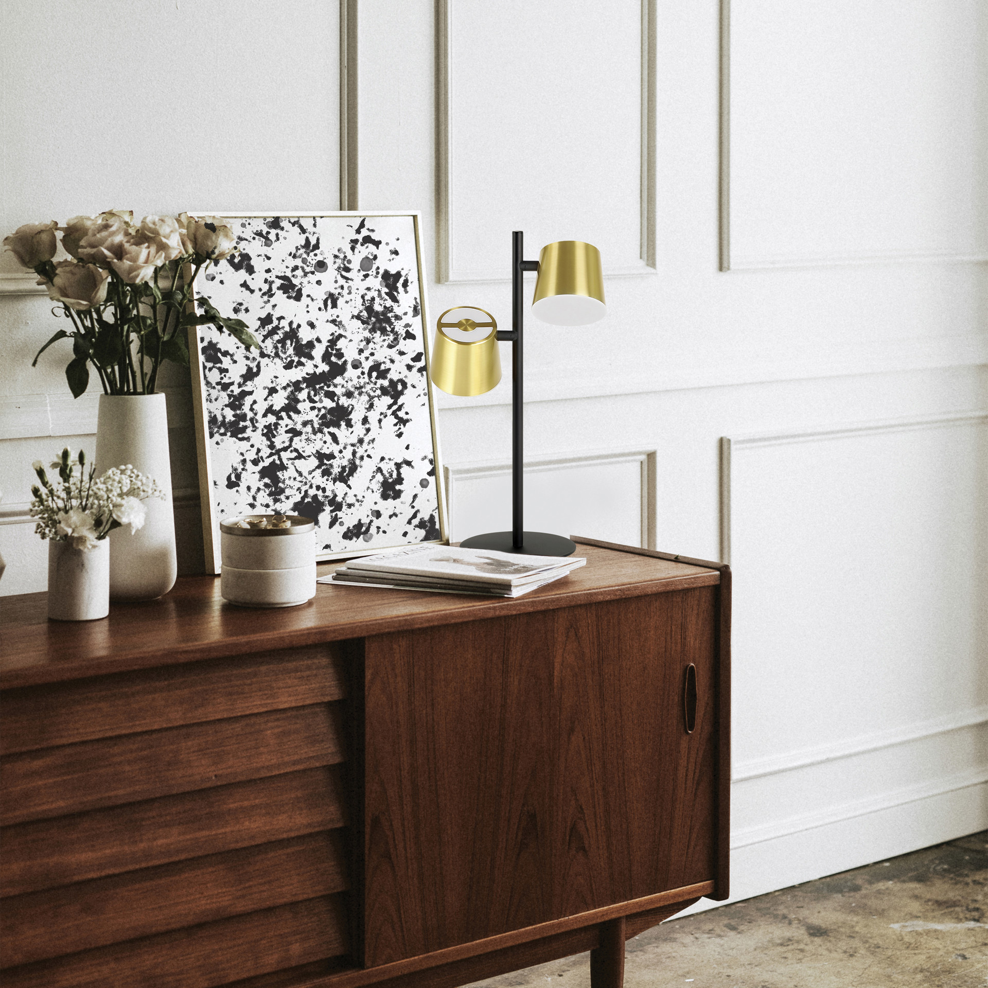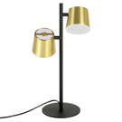 The Altmira table lamp is both simple and striking. This lamp in black finish features two brushed brass lampshades that are staggered upon a black rod.