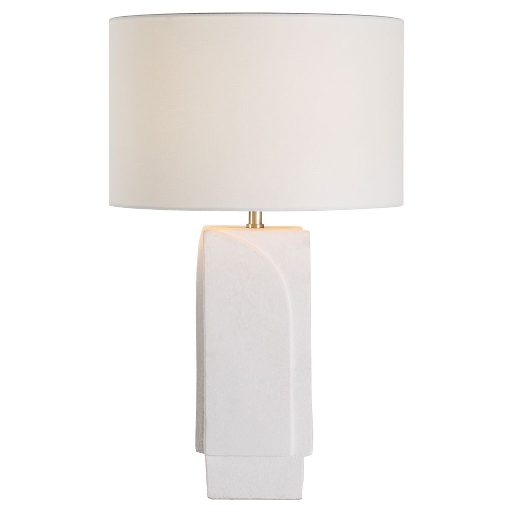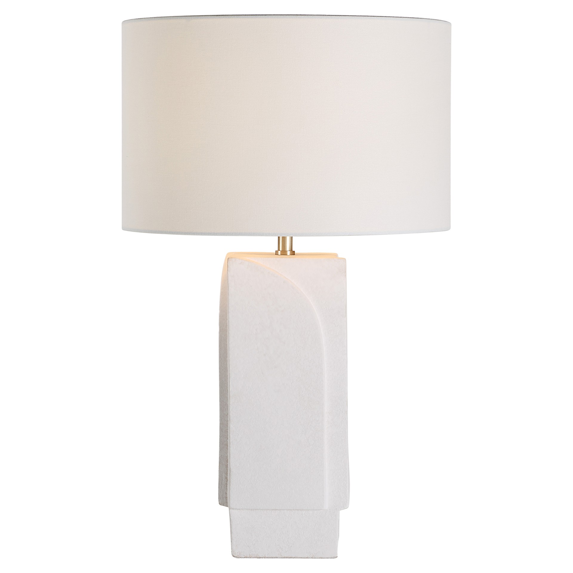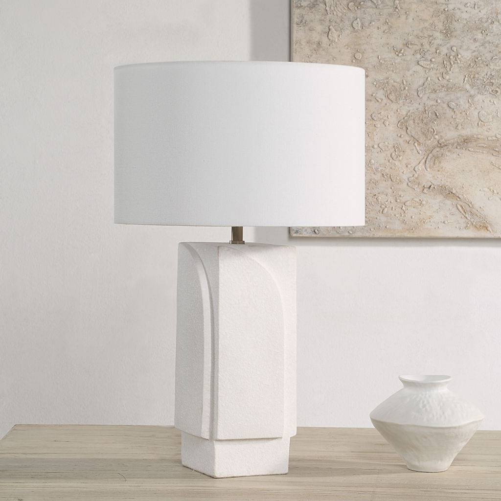 Gracing the room with the subtle beauty of fine ceramics, this lamp boasts a matte off-white textured finish on its statuesque base for a stone-like effect.