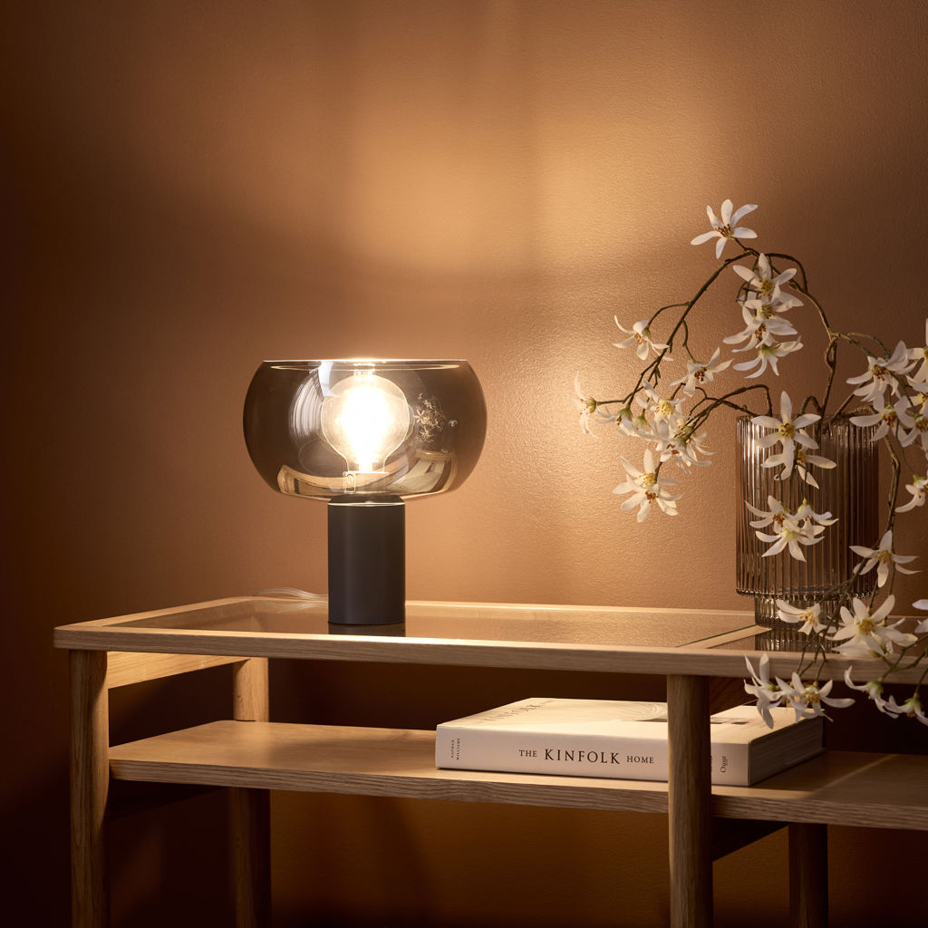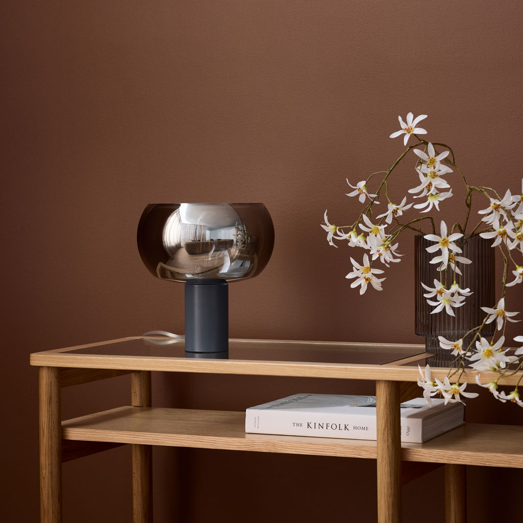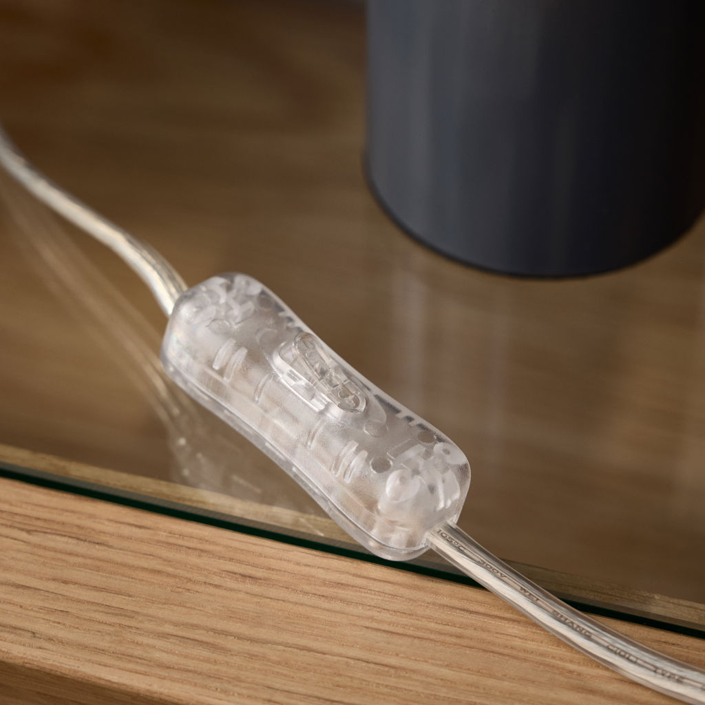 The metal cylindrical base matches the shade in colour, giving the lamp a sleek, minimalist aesthetic.