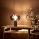 This lamp features a modern design, with its rounded, dome-like metallic glass shade creates a golden hue effect with the light bulb.