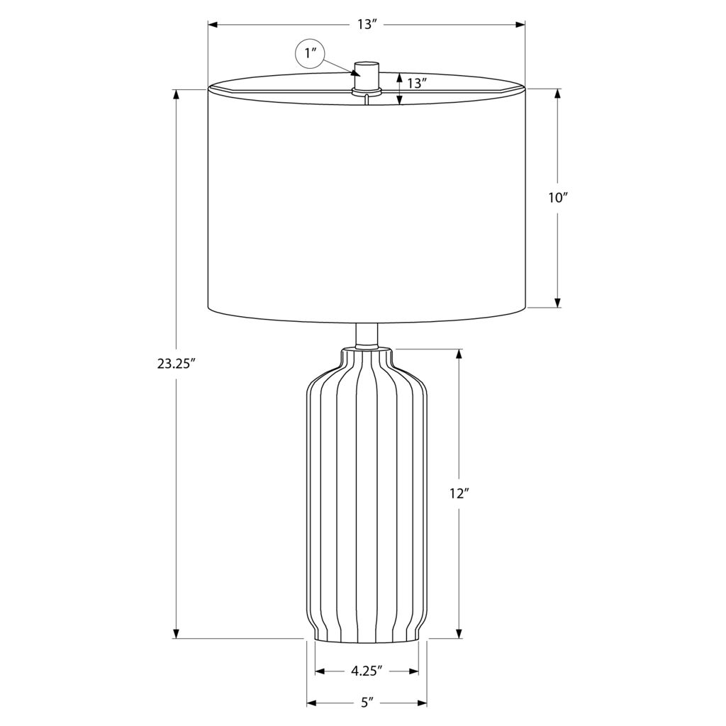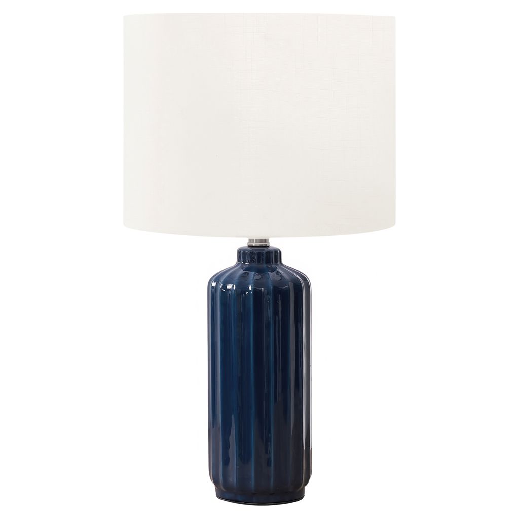 Composed of high-quality ceramic material in a chic ribbed design, this decorative lamp is complimented with a sophisticated ivory fabric shade that diffuses the light beautifully, generating a warm ambiance that brightens your end or side table, nightstand, or bedside table.