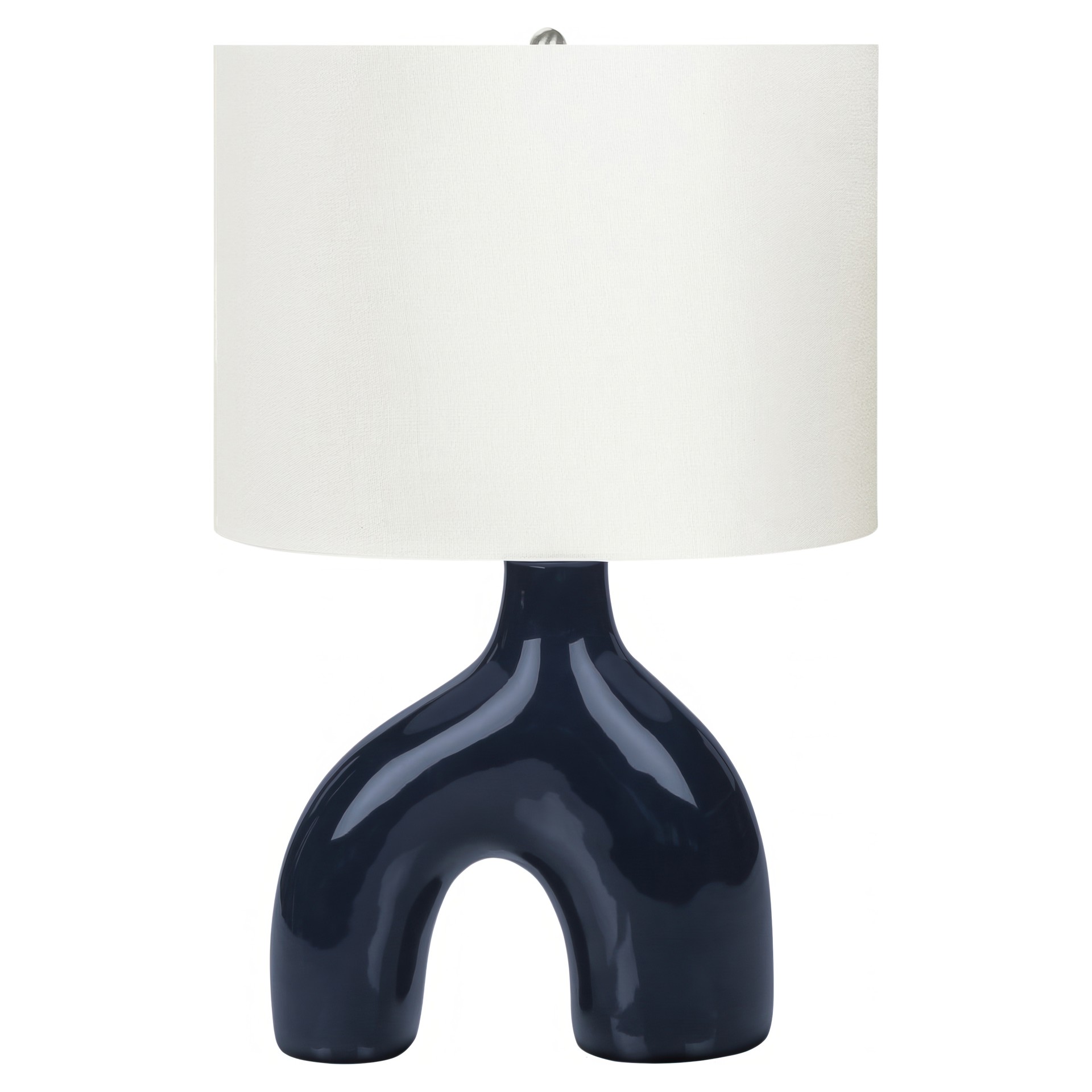 This decorative table lamp will brighten up any room with its contemporary and whimsical two-leg shape ceramic base and linen-blend fabric shade.