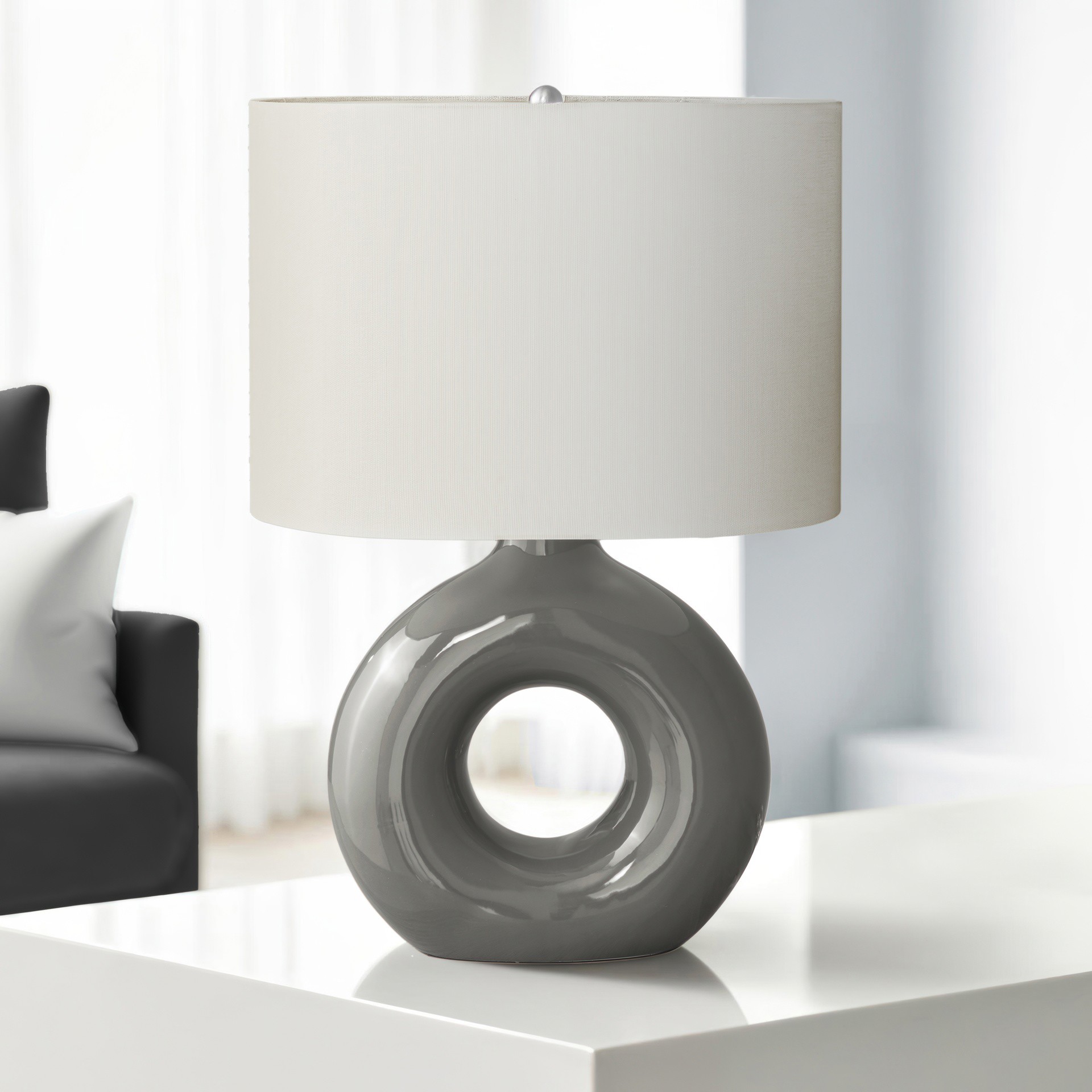 This decorative table lamp will brighten up any room with its contemporary, donut-shaped ceramic base and oval linen-blend fabric shade.