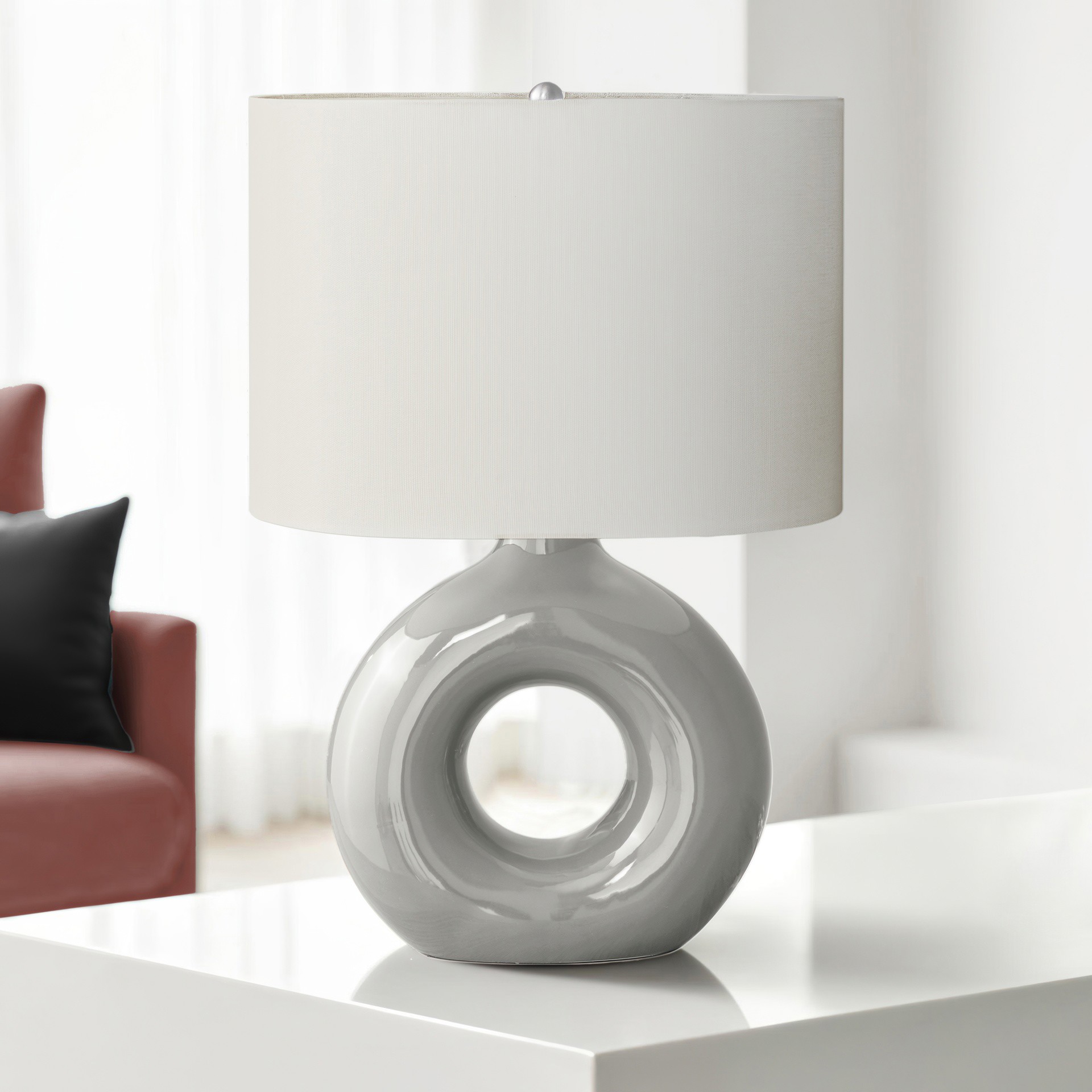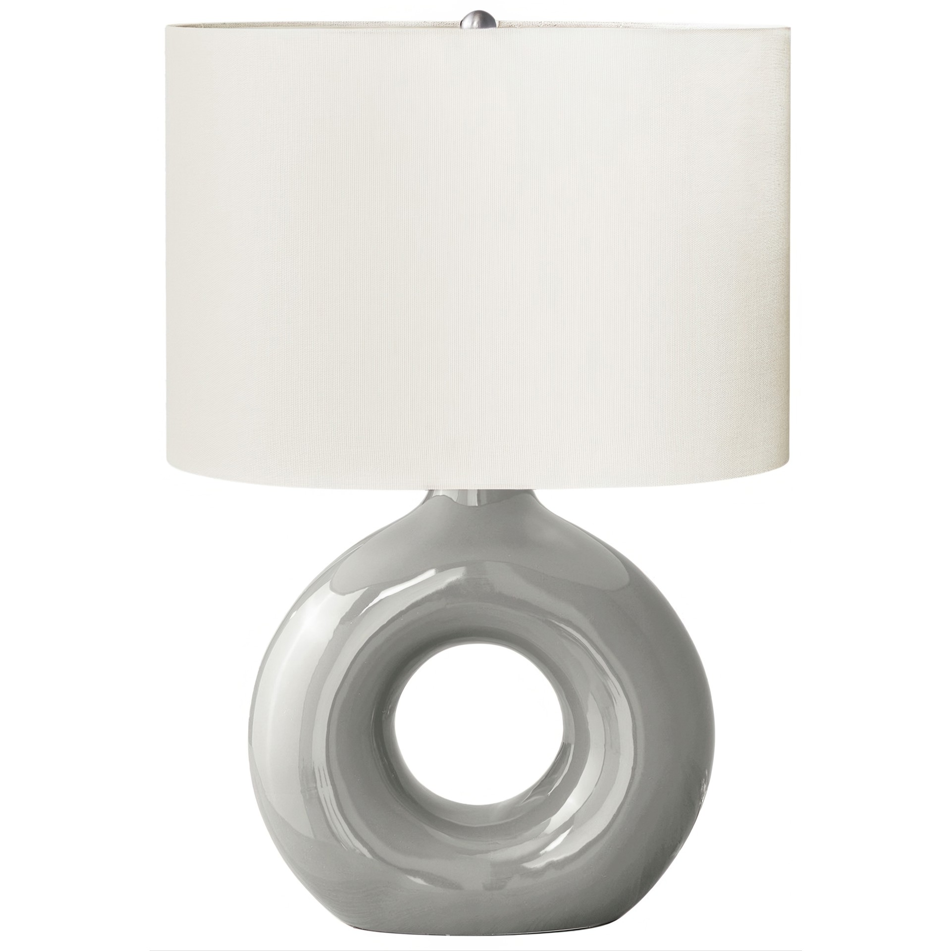 This decorative table lamp will brighten up any room with its contemporary, donut-shaped ceramic base and oval linen-blend fabric shade.