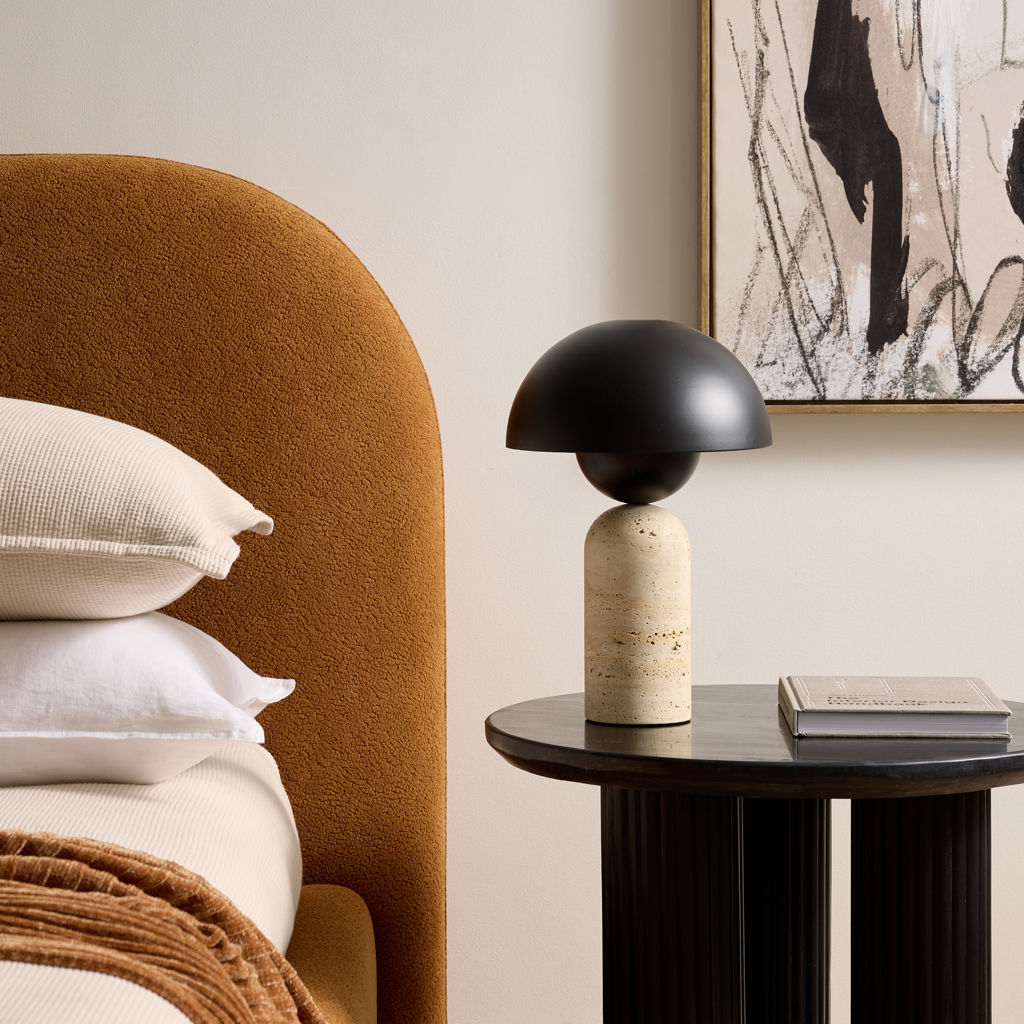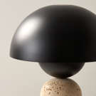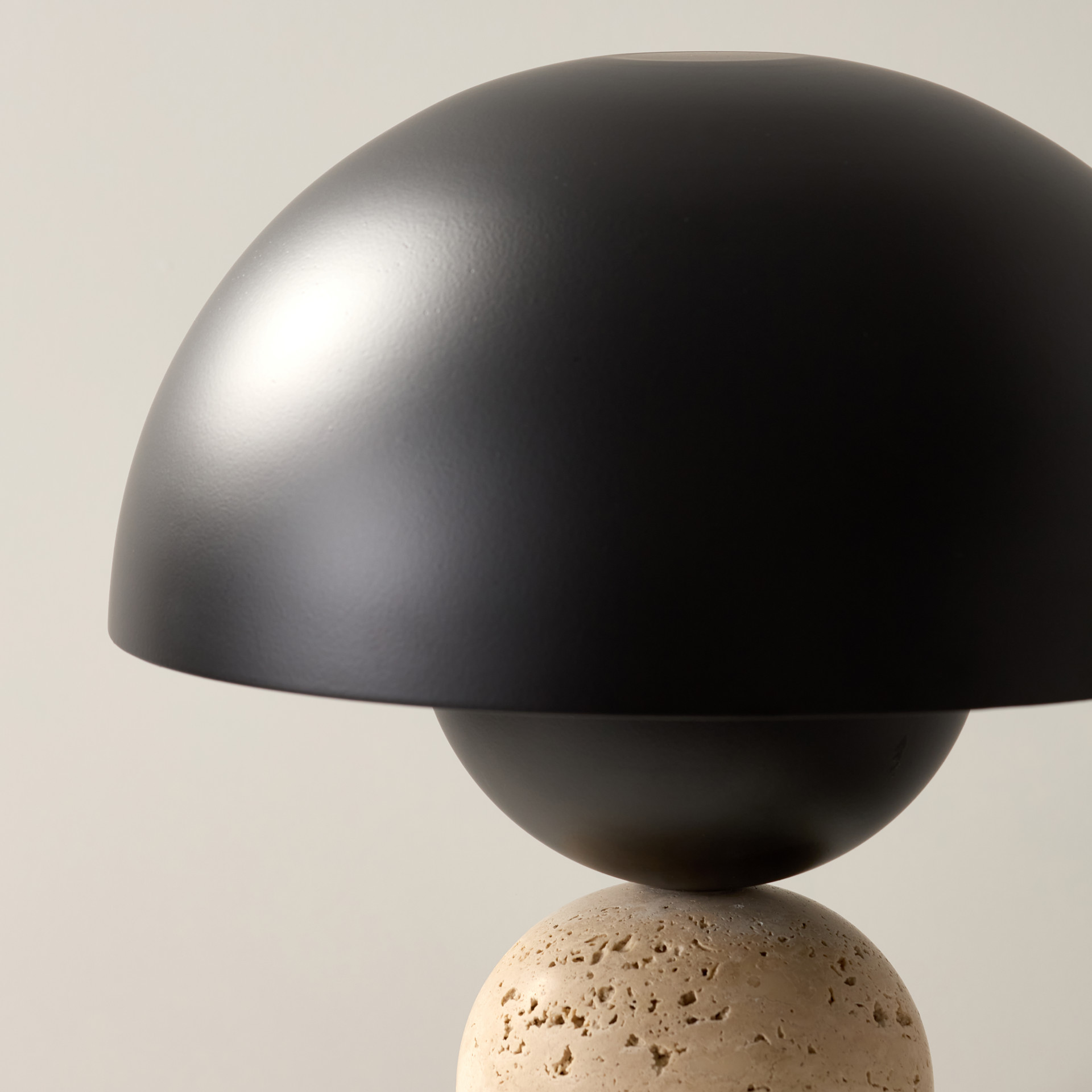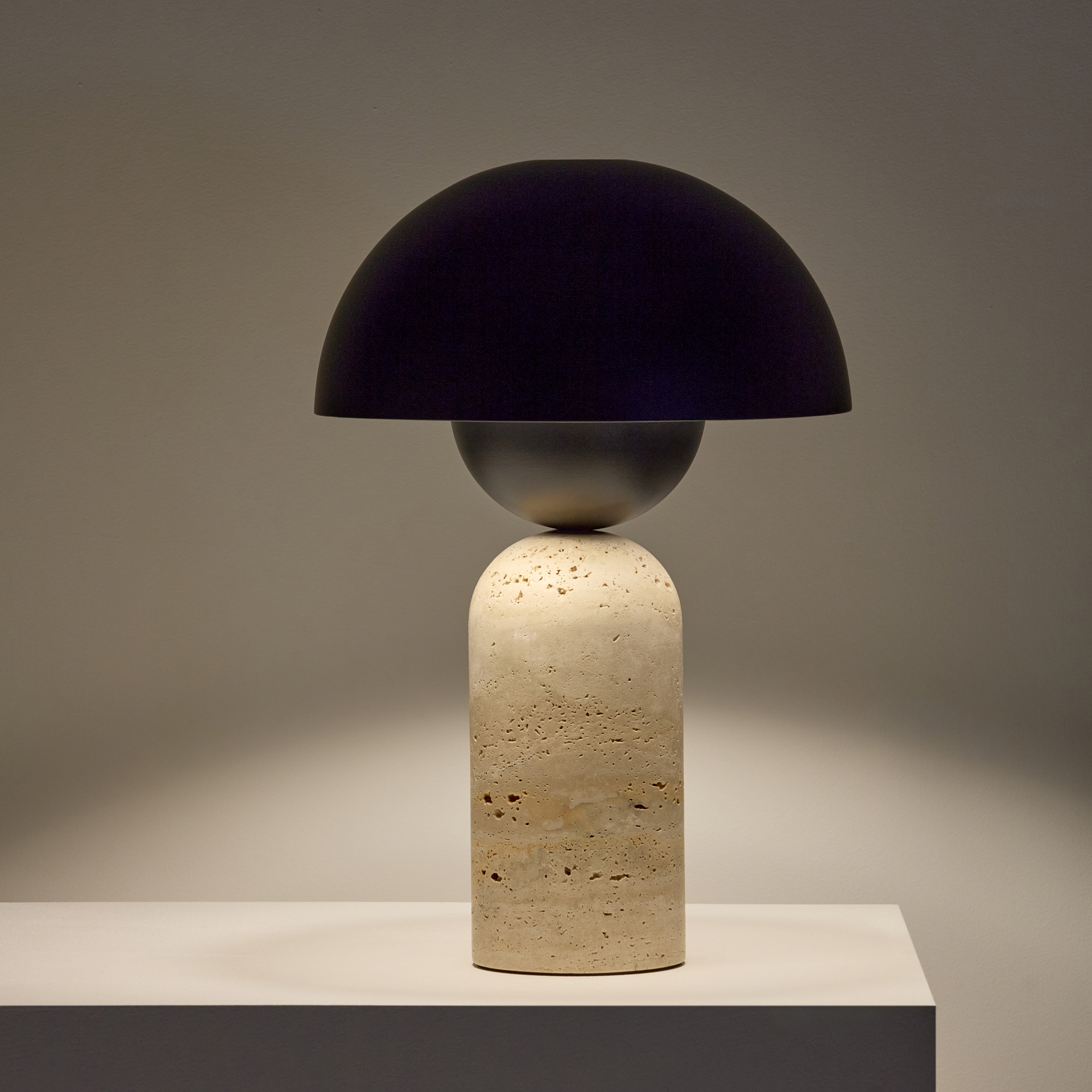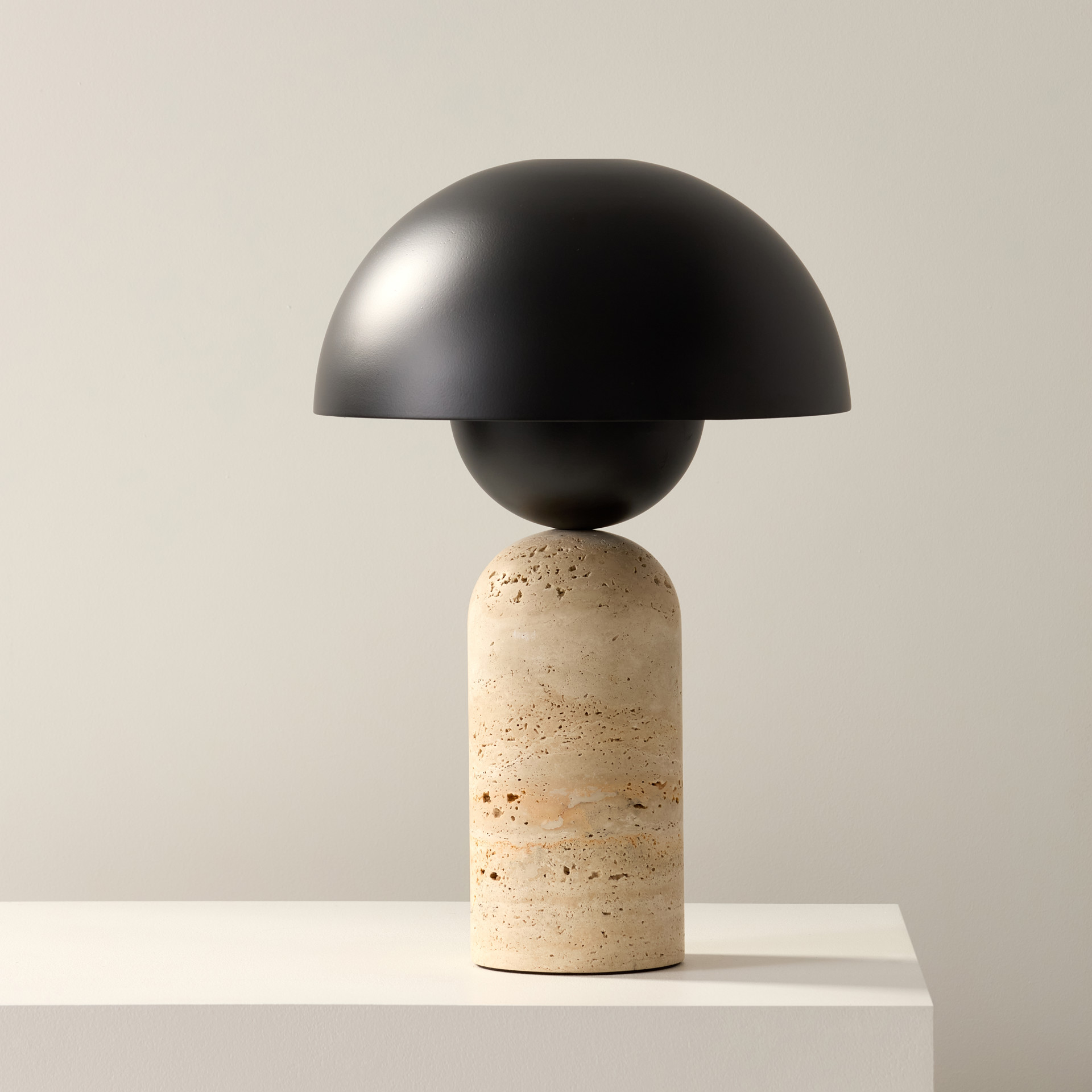Warm, creamy travertine contrasts beautifully with the matte black metal elements,  a central sphere and an upper dome that directs the light downward. This interplay of shapes and materials creates a visually compelling dialogue between raw mineral character and refined metal design.