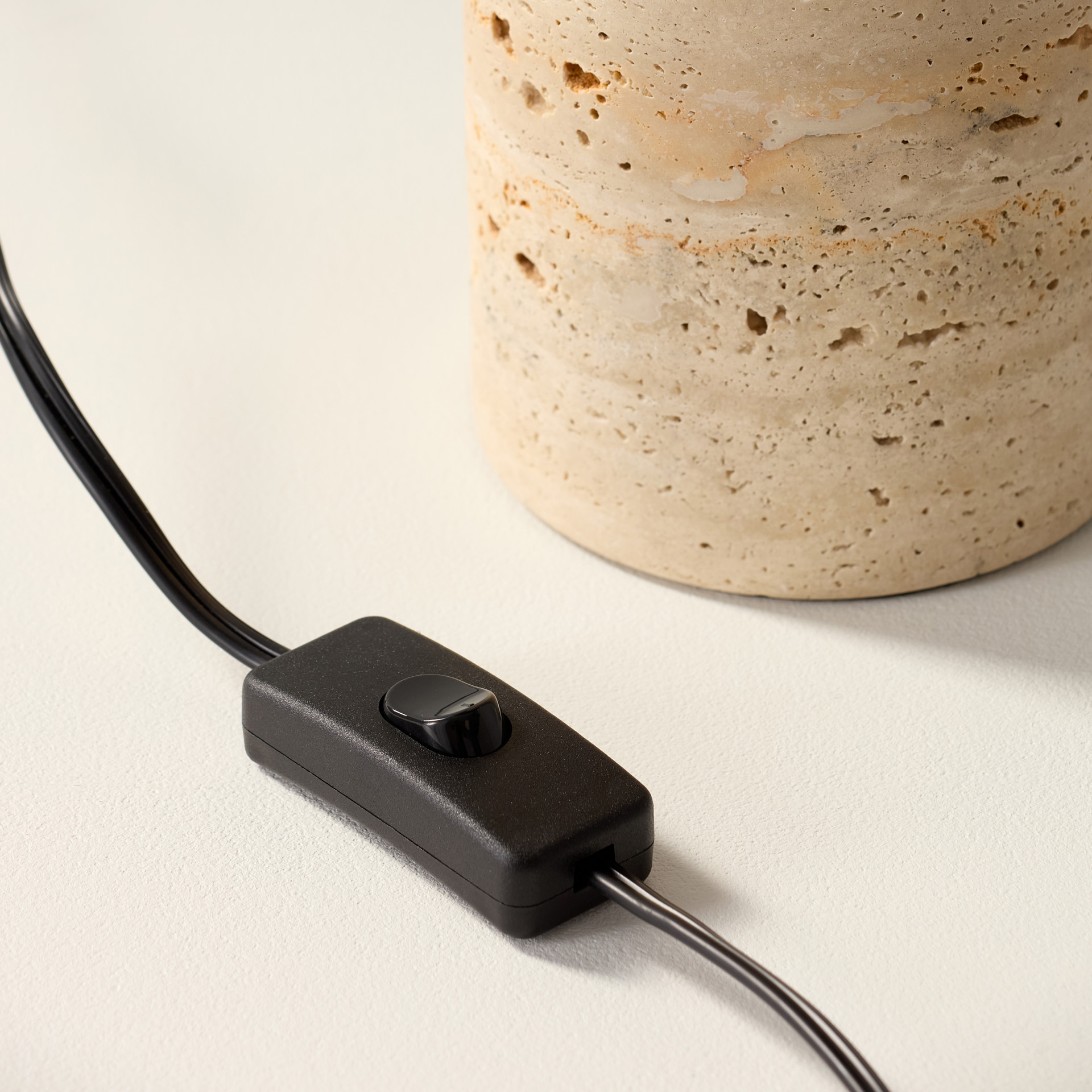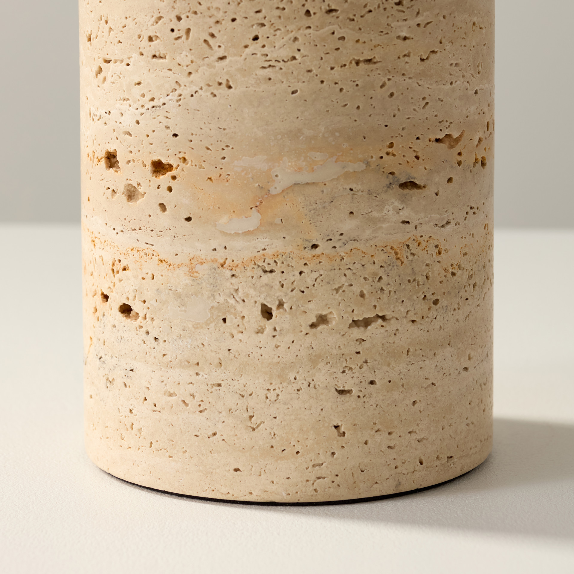 This table lamp makes a bold statement with its sculptural composition that stacks three pure geometric forms. The cylindrical base in natural travertine showcases the stone’s authentic porous texture, creating a solid, organic foundation.