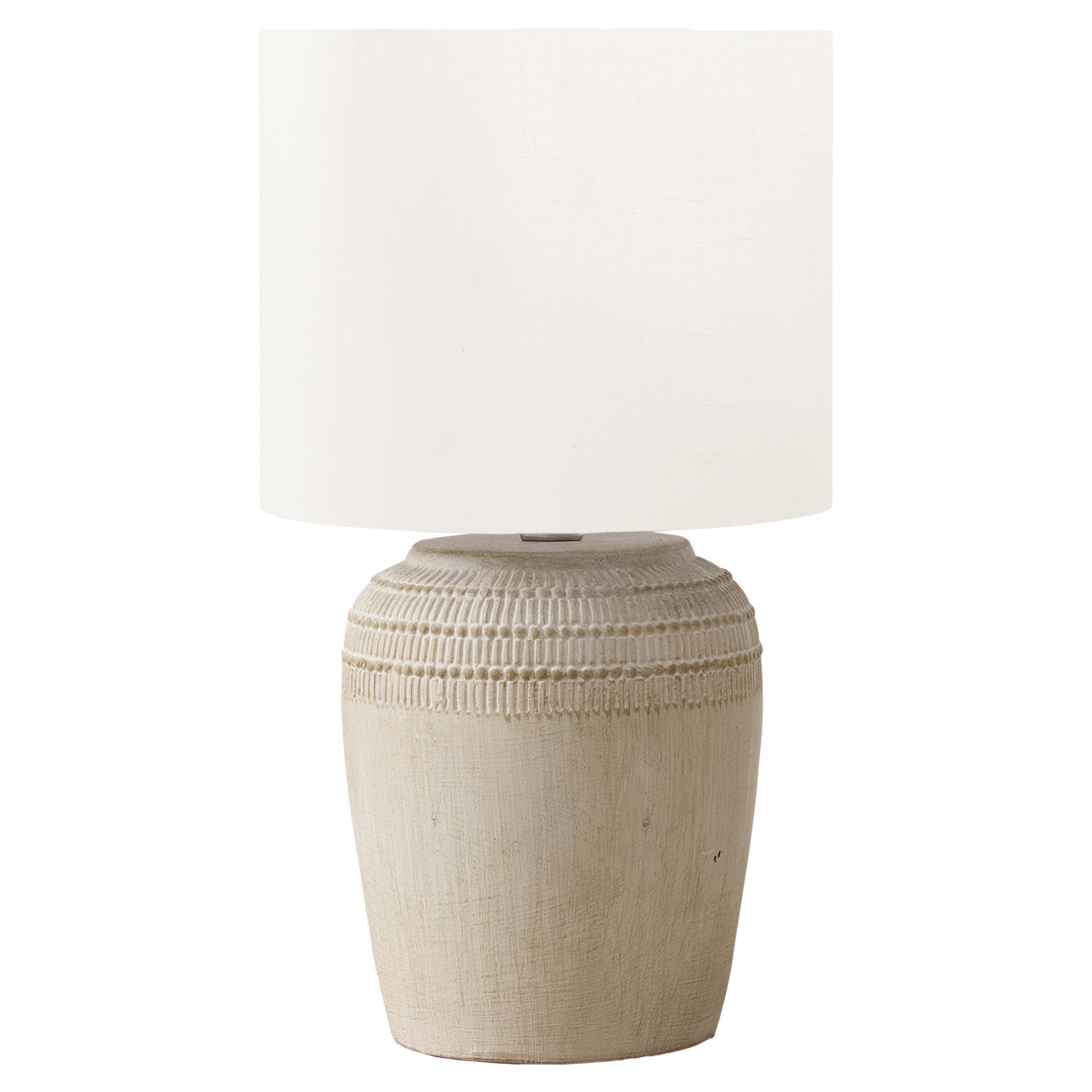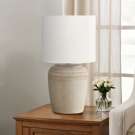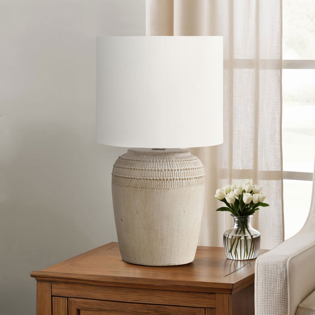 Refresh your living room, bedroom, or home office with this stylish 17"h table in beige ceramic. The elegant, jar shaped beige base with a textured finish along the top is paired with an ivory fabric shade for a contemporary upgrade.