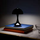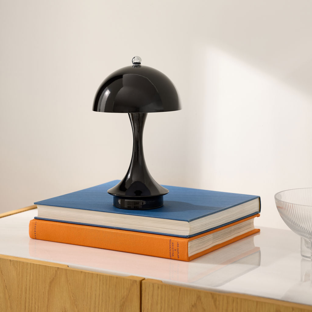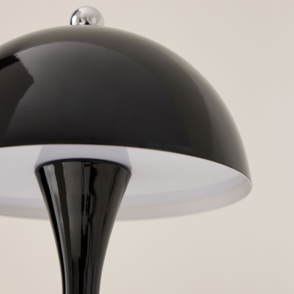 This metallic mushroom LED table lamp offers modern style and portable brilliance.