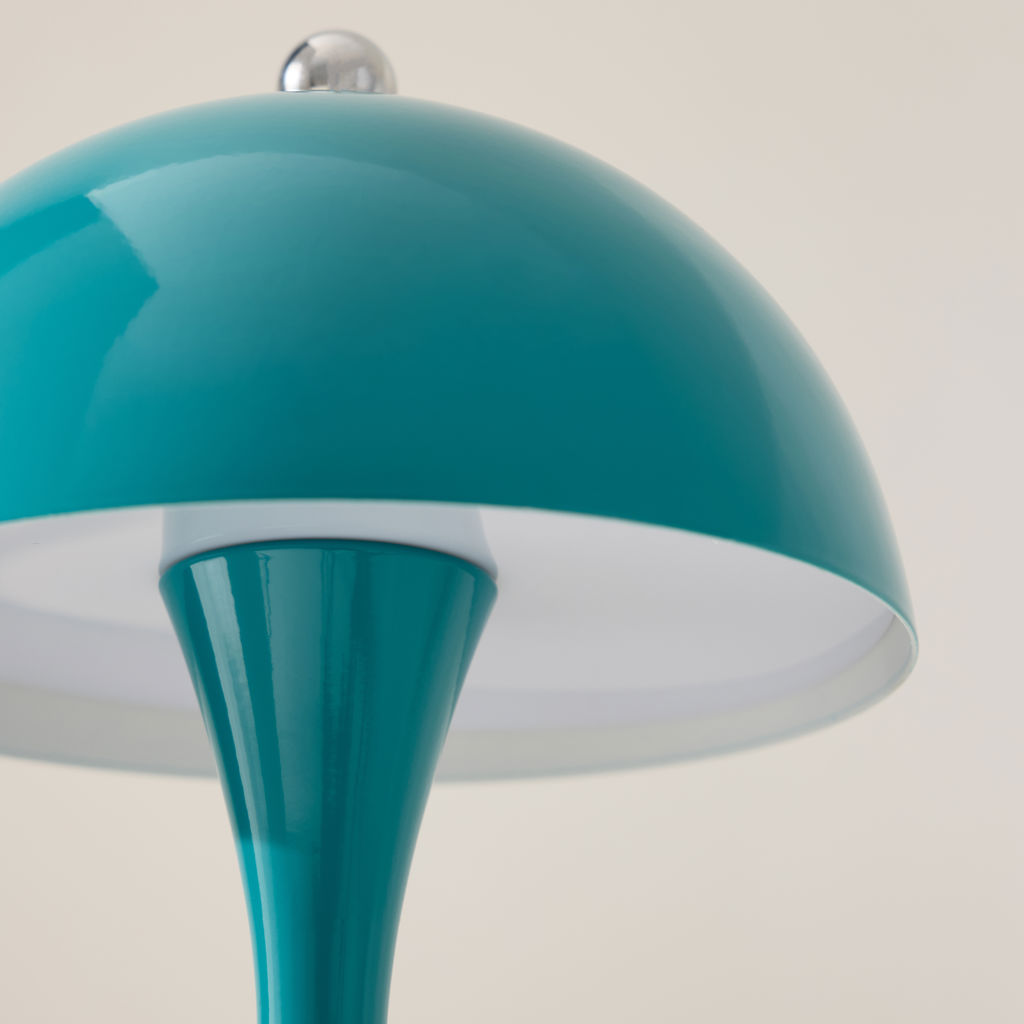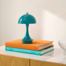 This metallic mushroom LED table lamp offers modern style and portable brilliance.