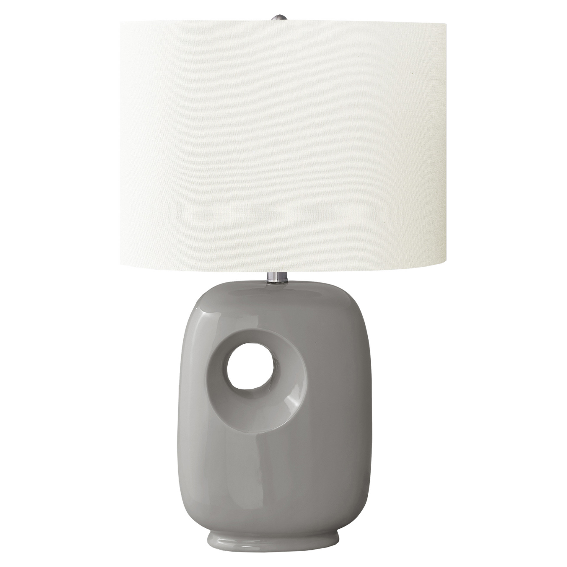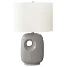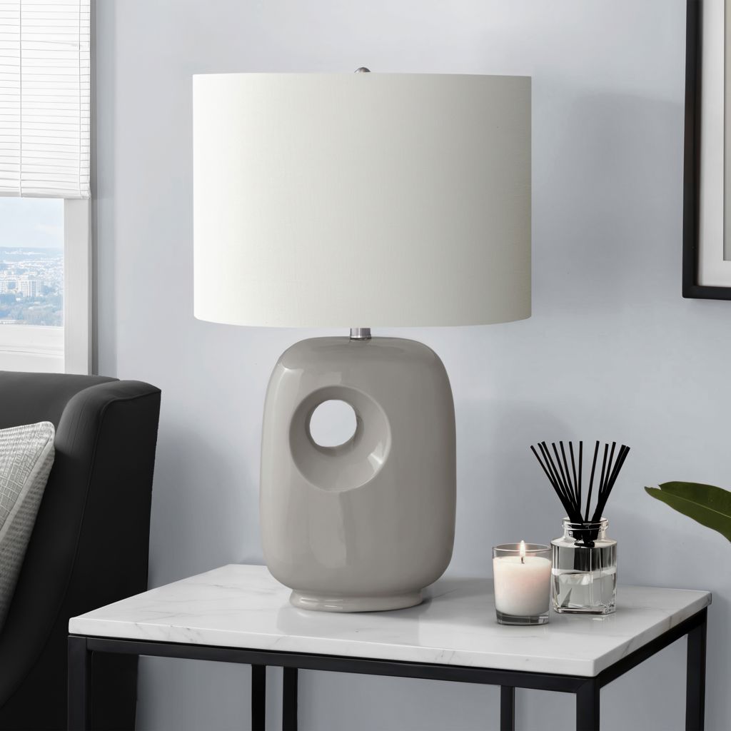 Illuminate your space with this modern and trendy 26"h table lamp with a sleek dark grey ceramic base and topped with a linen-blend, ivory fabric shade.