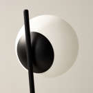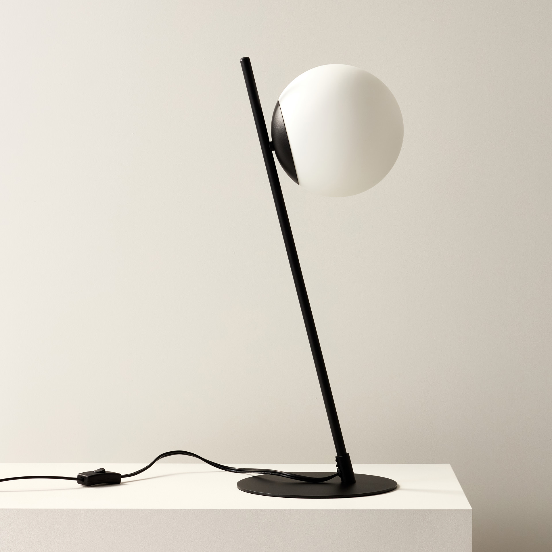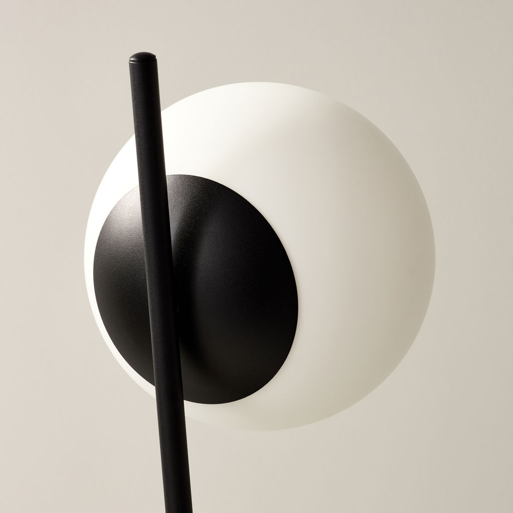 This table lamp consists of a round flat metal base in black with a rod attached at a dynamic angle and an white glass ball.