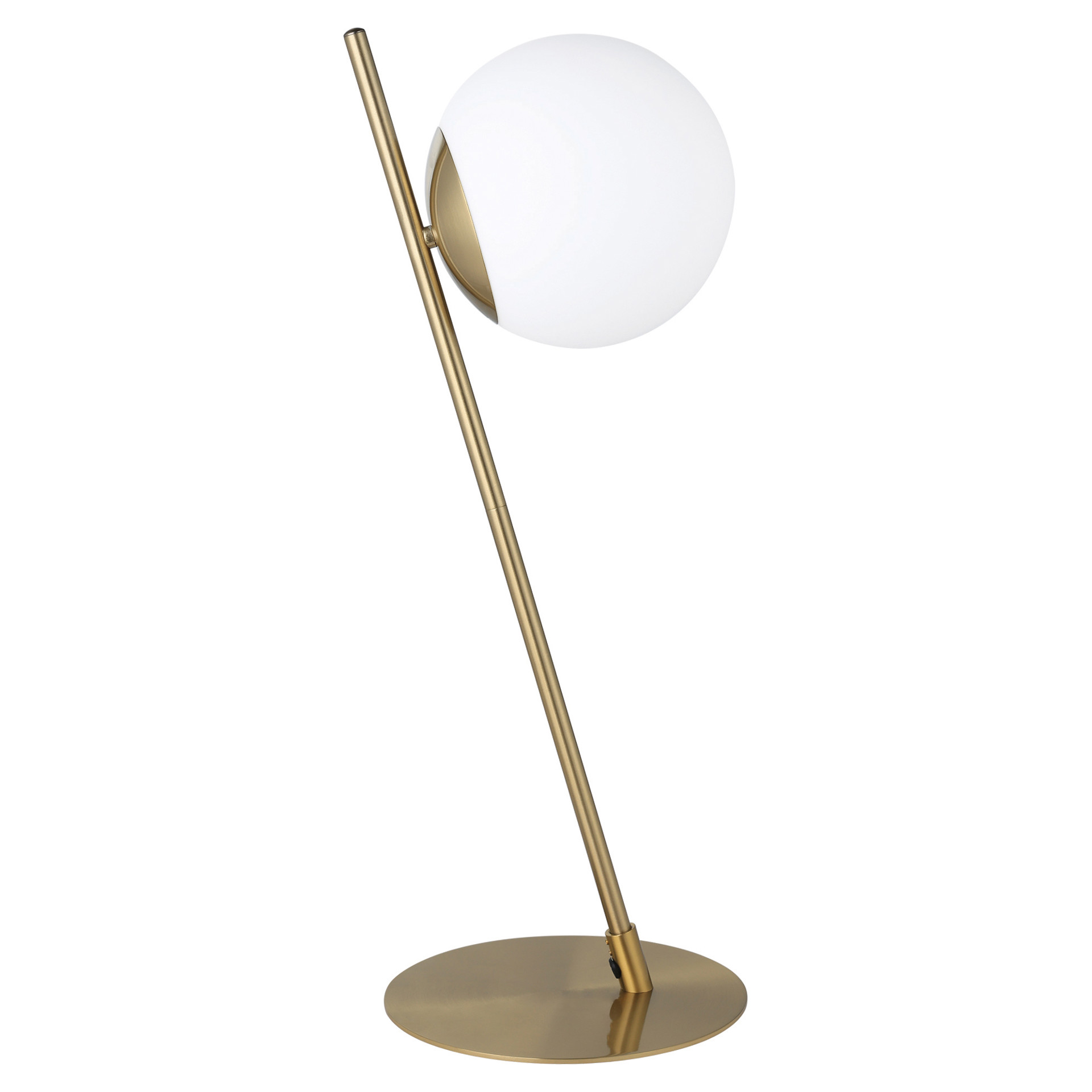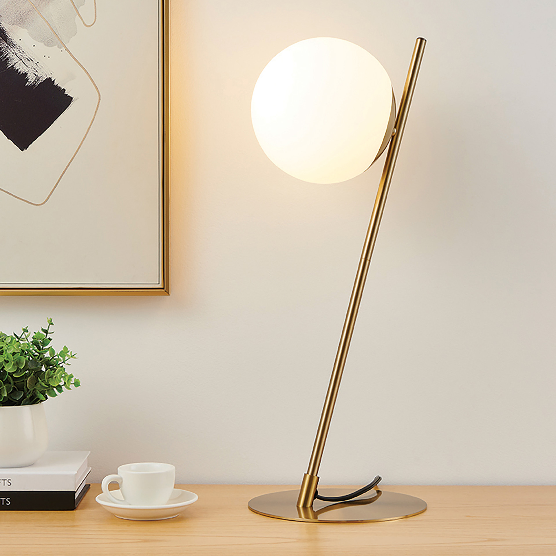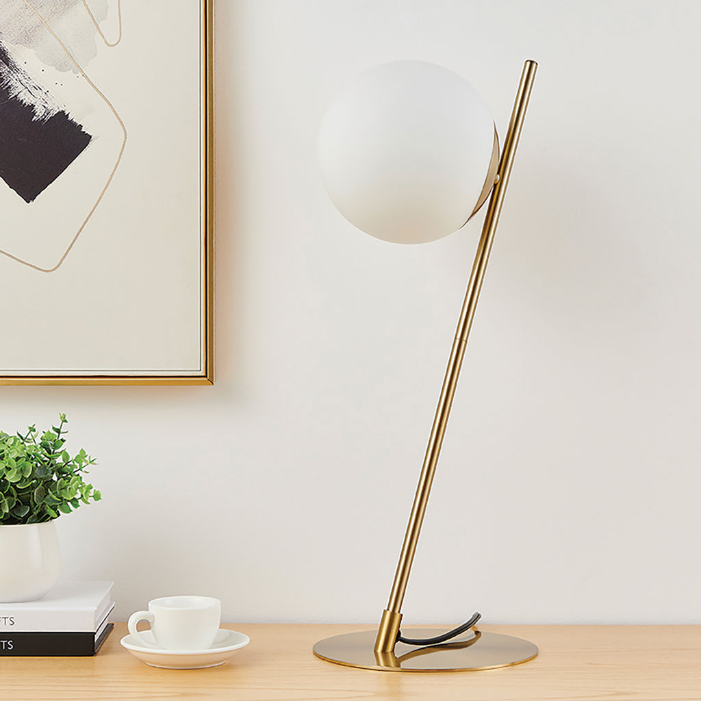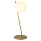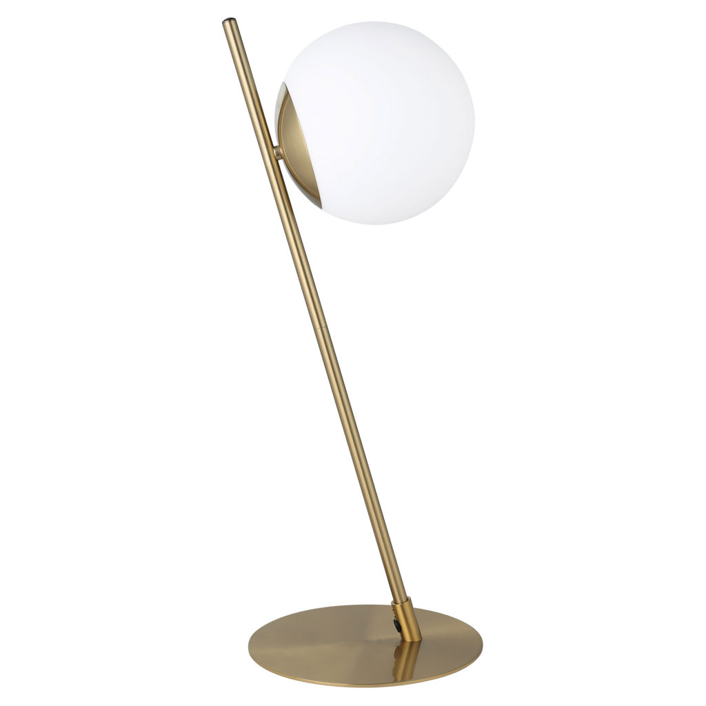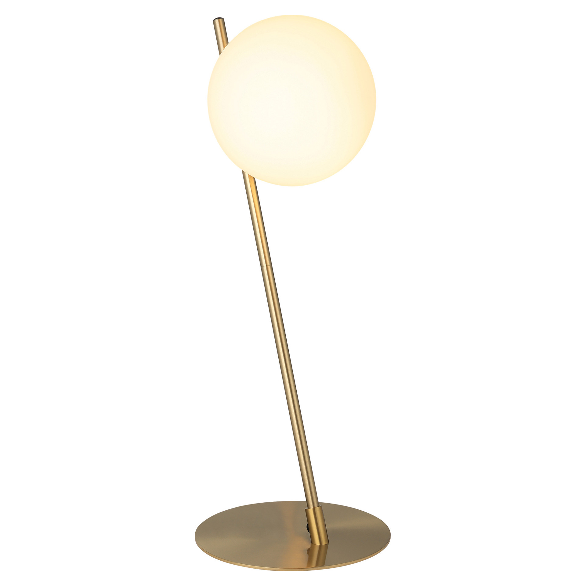 The Rondo table lamp consists of a round flat metal base in gold with a rod attached at a dynamic angle and an white glass ball.