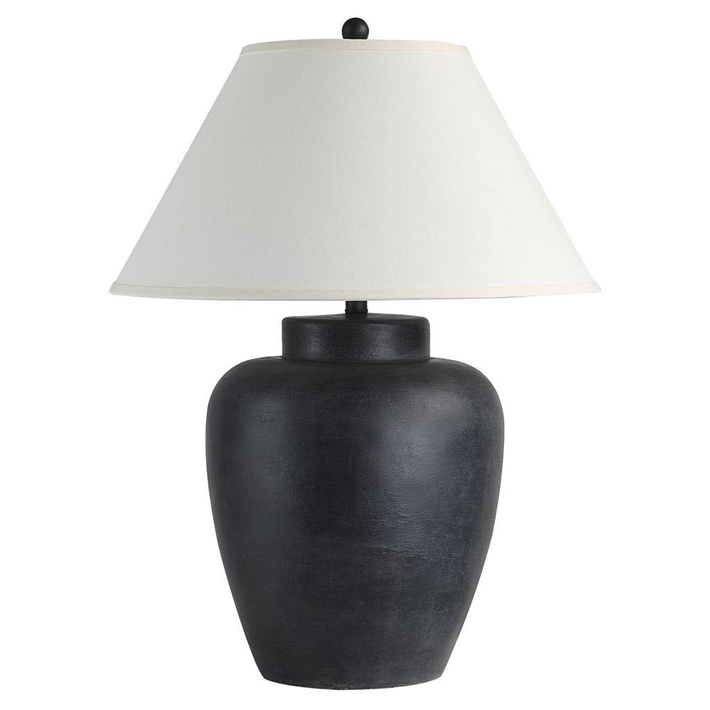 Whether you need lighting for a living room, dining room or bedroom, this lamp delivers an earthy, handmade vibe that makes a big impact. It features a dramatic dark wash weathered finish, antique brass-plated iron fittings and a sleek ivory linen tapered drum shade that diffuses a warm glow in any space.