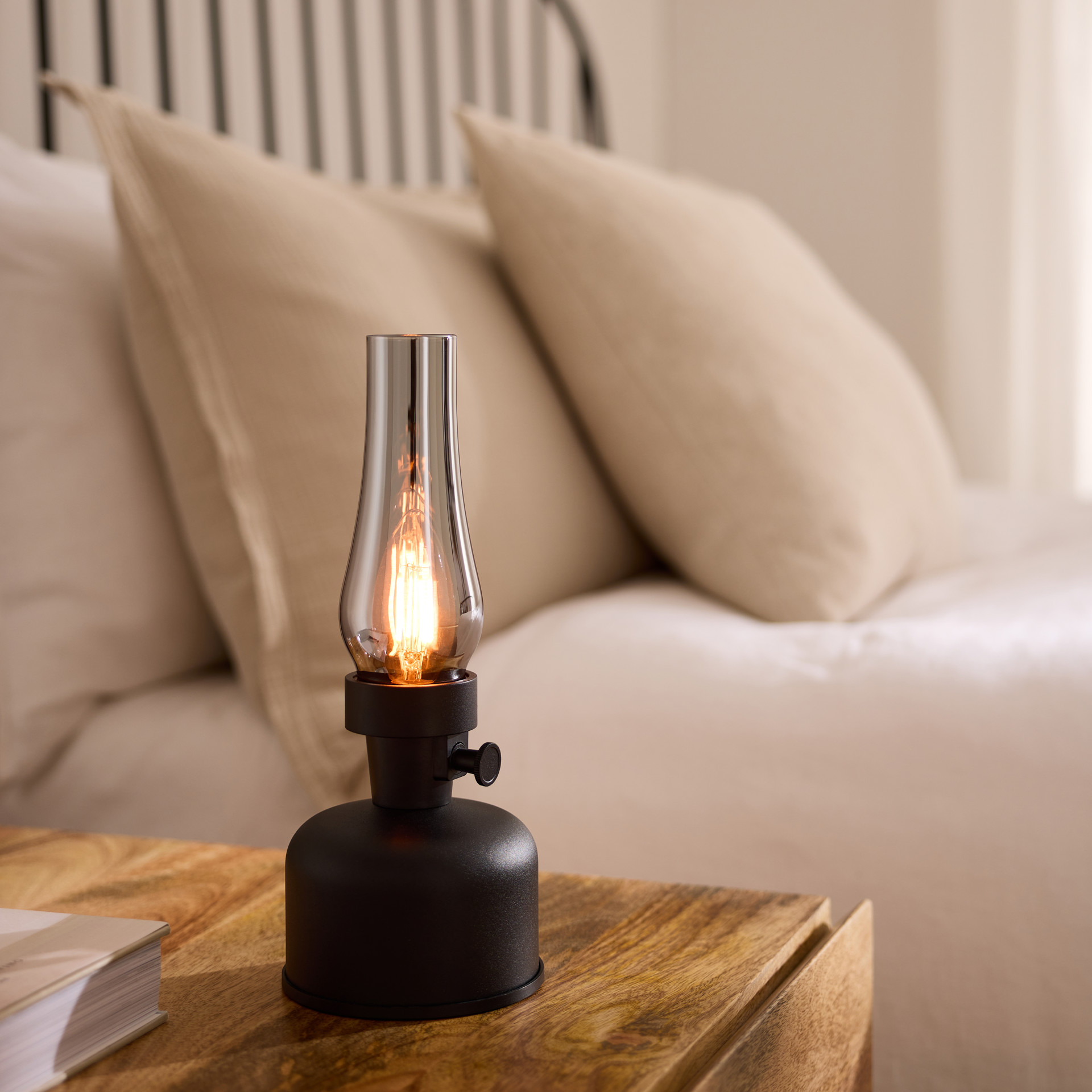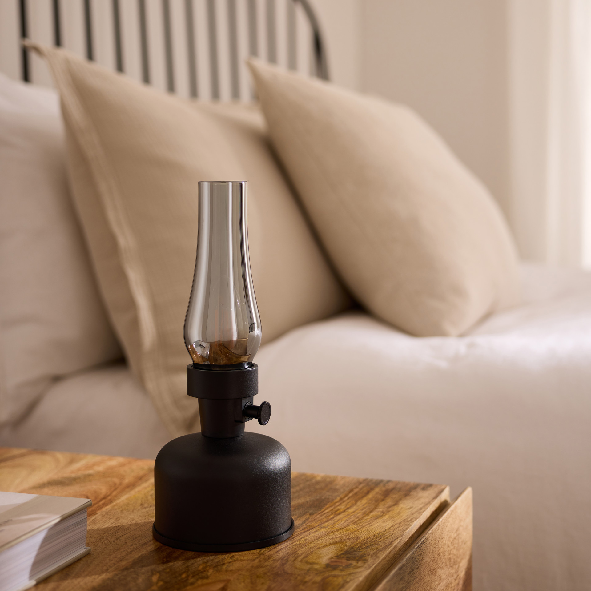 The lustrous smoke-tinted glass chimney enhances its sophisticated appeal, while the matte black metal base offers a sturdy, minimalist aesthetic that complements any decor from rustic and industrial to modern and cozy.