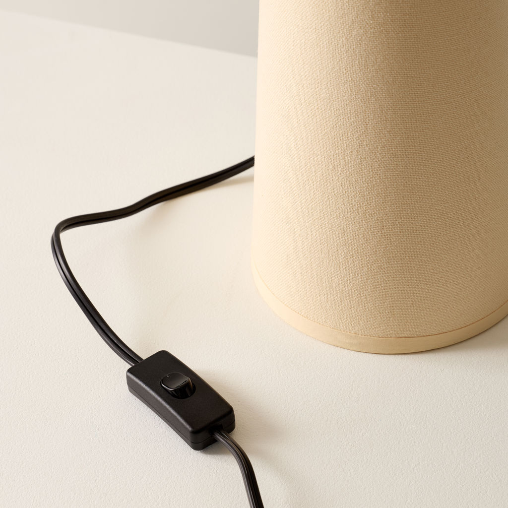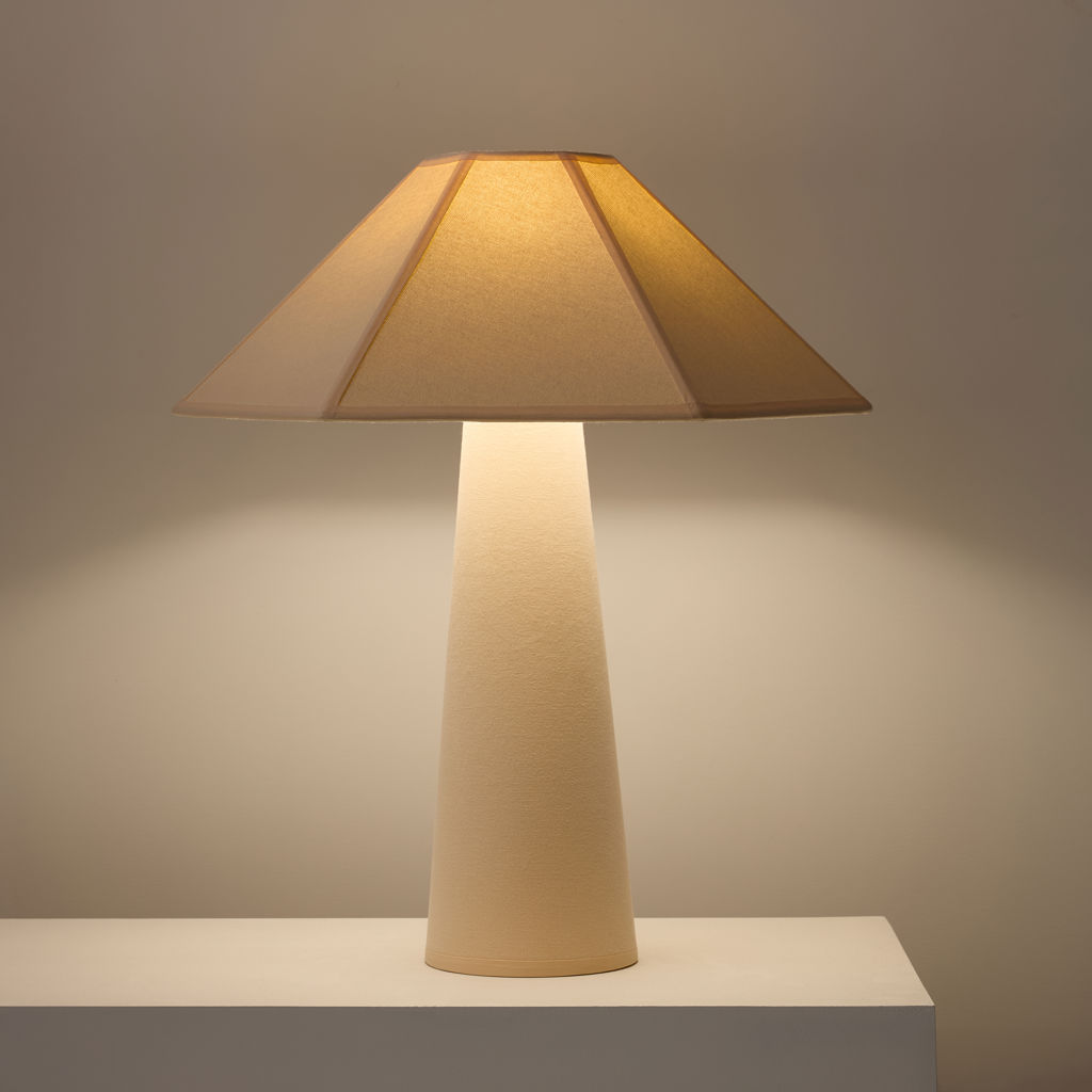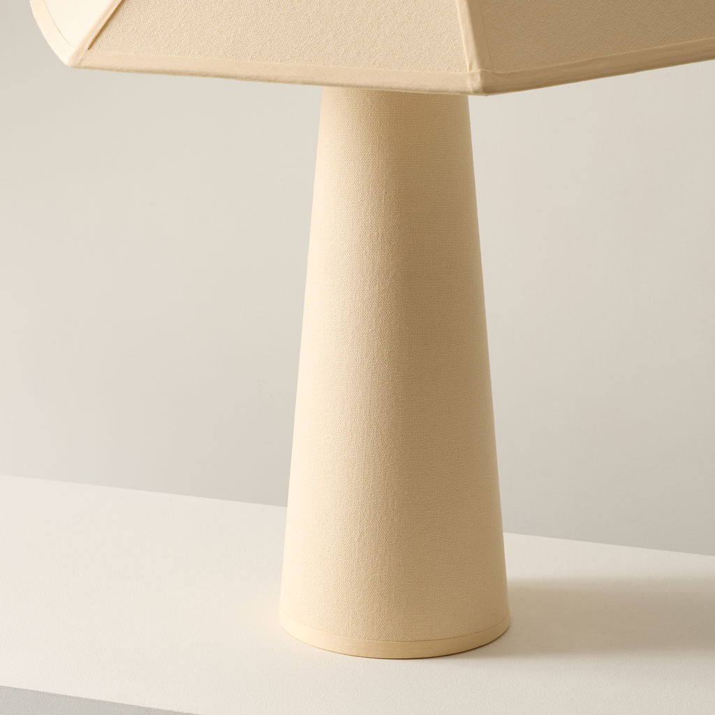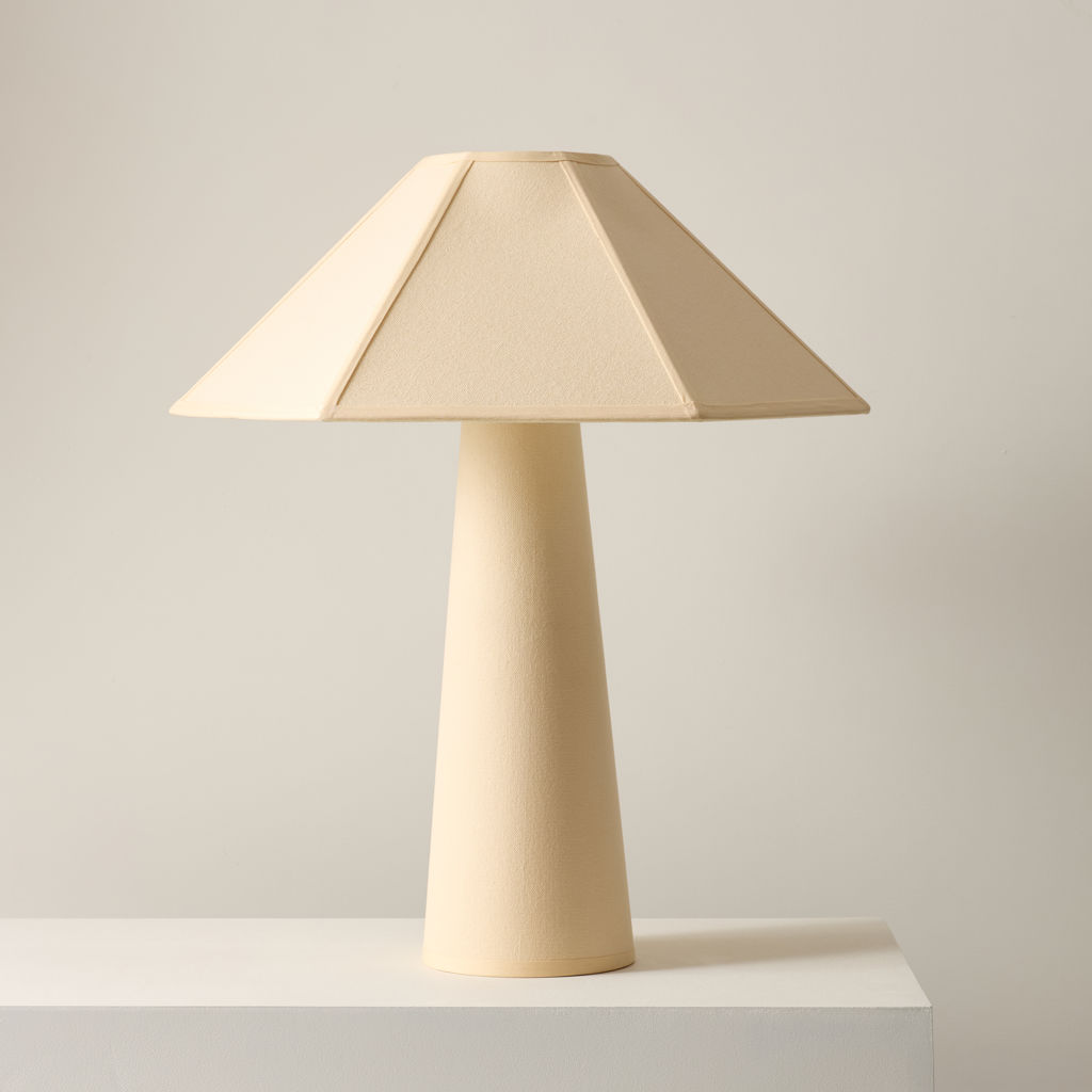 Wrapped head to toe in soft cotton fabric with tonal piping that trims the shade like fine detailing, Gigi’s tailored, sculptural, and surprisingly warm.