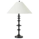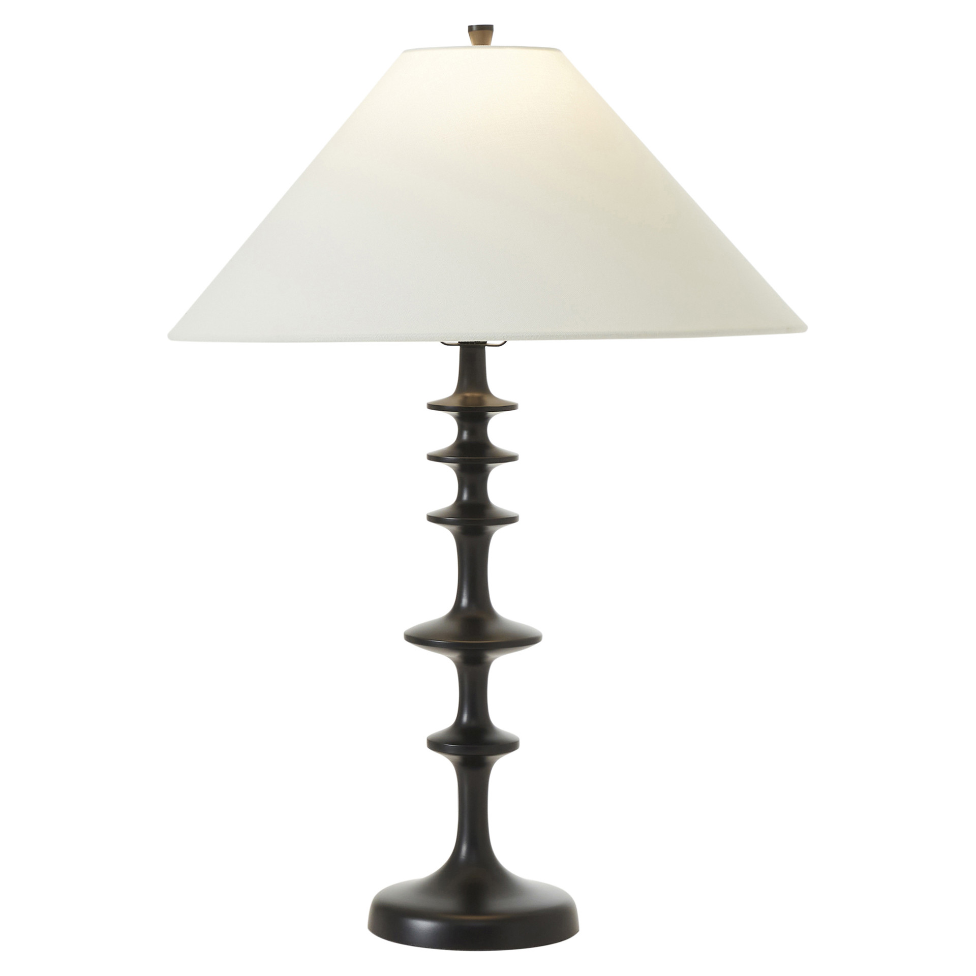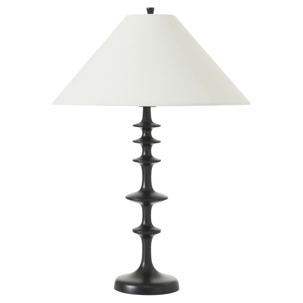 The sculpted wood table lamp reinvents a classic silhouette with bold, modern attitude. Its geometric matte black base stands out effortlessly, while an off-white linen drum shade softens the glow.
