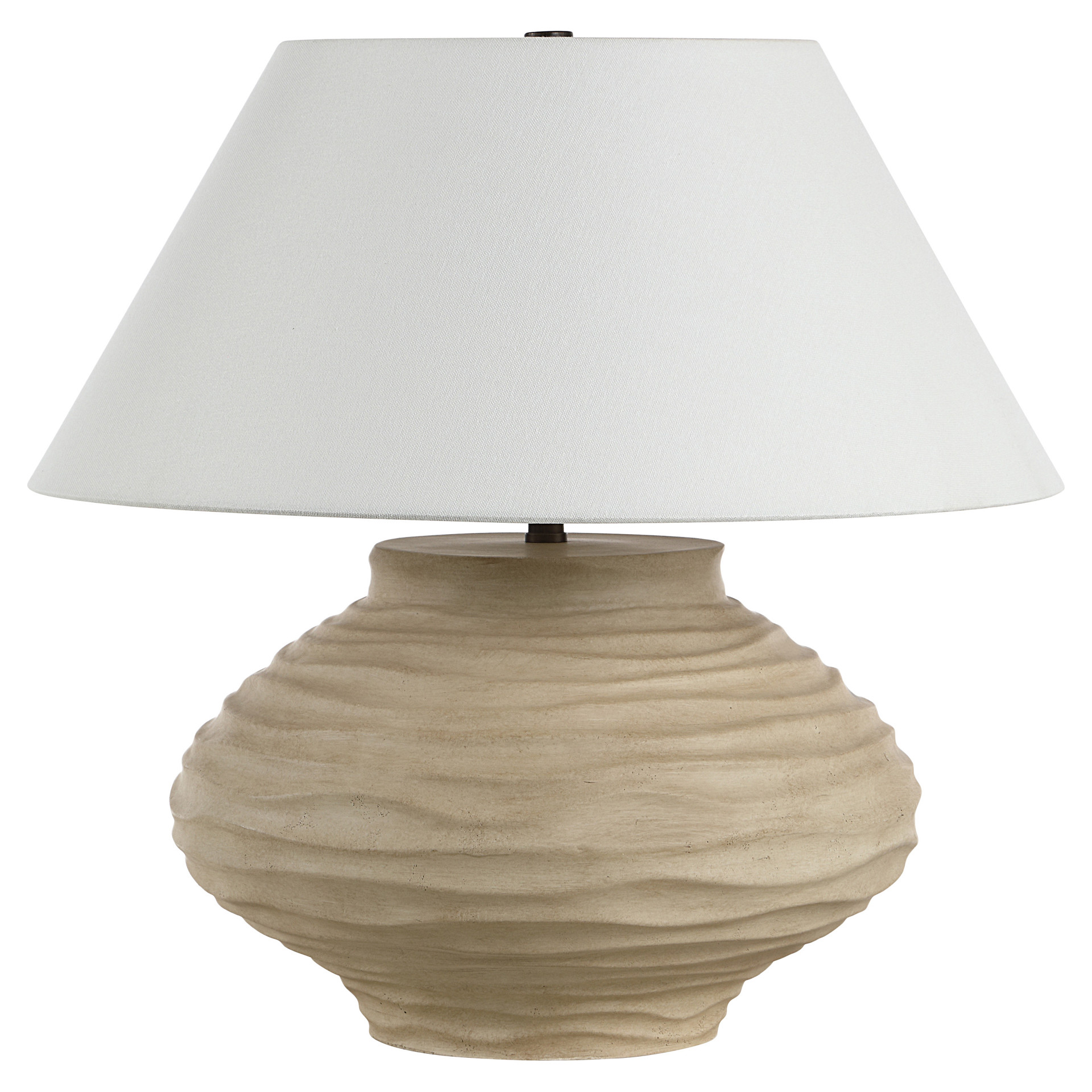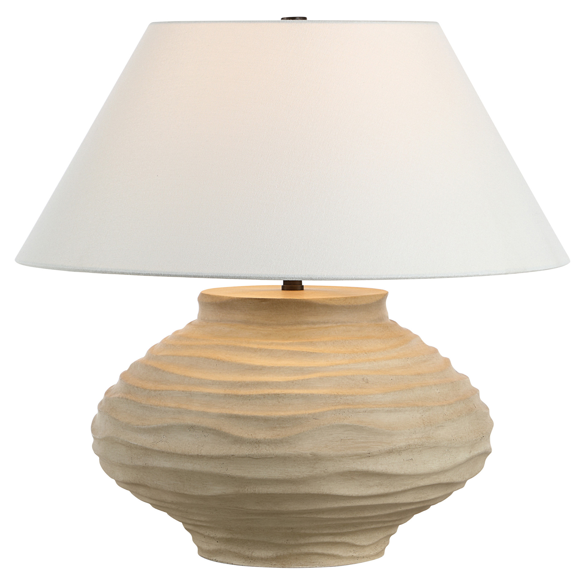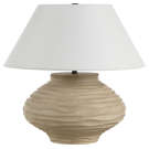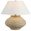 The asymmetrical table lamp exudes natural charm with its handcrafted look and sculpted beige base. Paired with an ivory linen shade and dark antique bronze accents, it delivers both sculptural beauty and soft illumination.