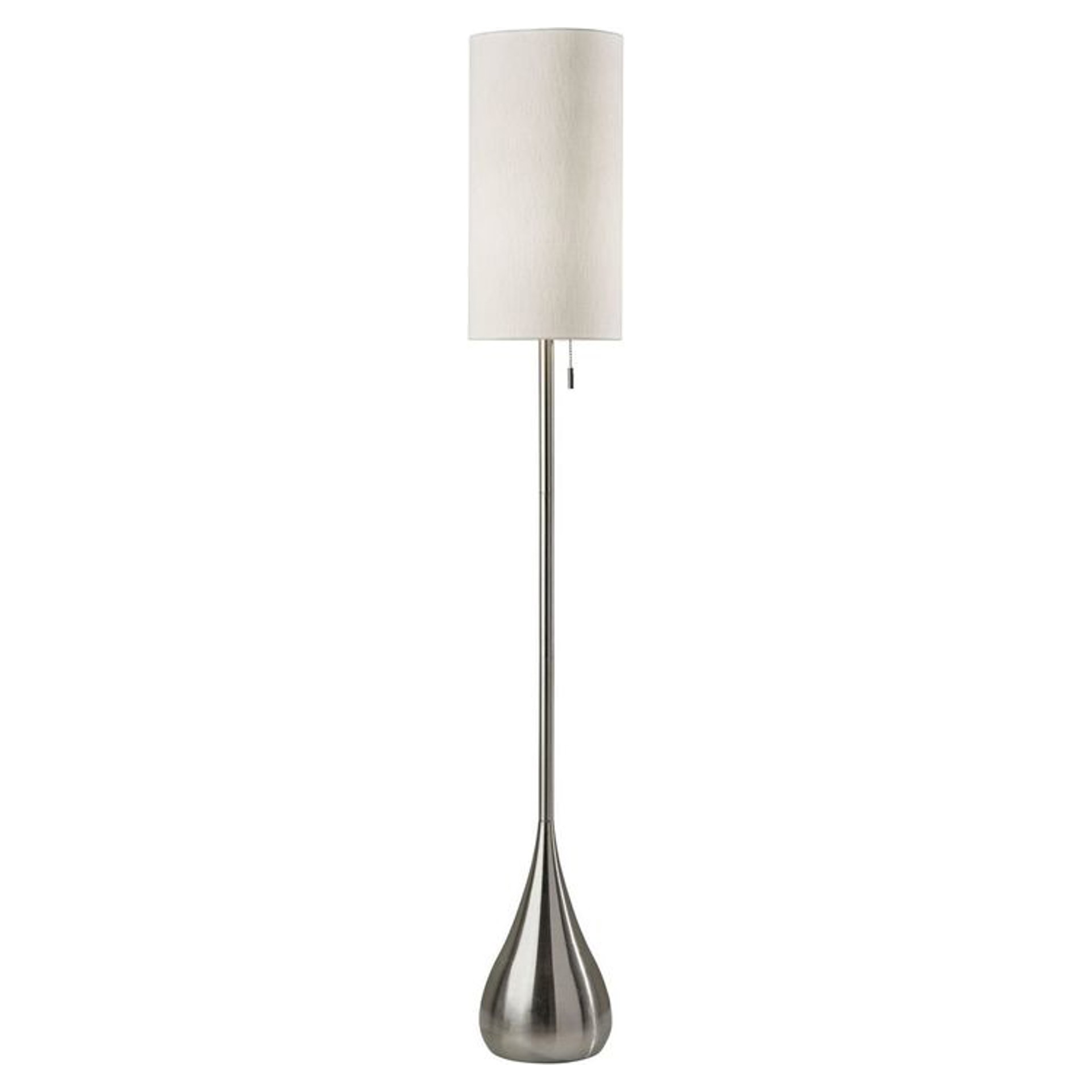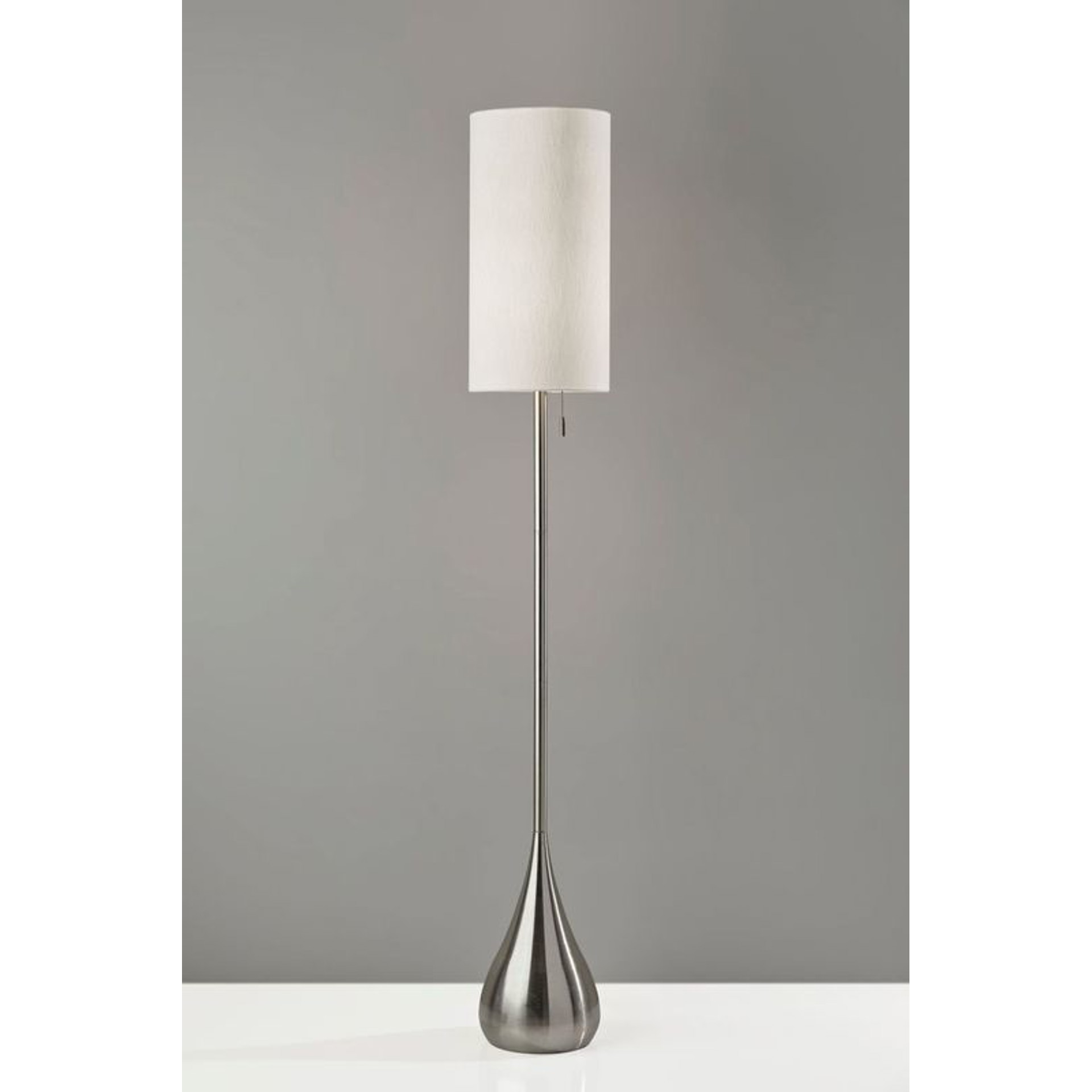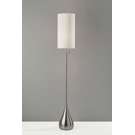 A tall, thin drum shade is made of a textured white fabric, softening the look. This majestic floor lamp stands 68 inches tall and has a strong presence in a room.