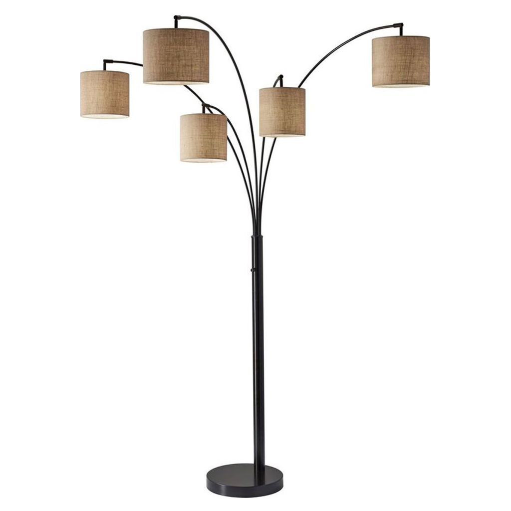 The Trinity 5-Arm Arc Lamp goes beyond the typical arc lamp. Five beige burlap drum shades hang from curved arms in an antique bronze finish to create effective airy lighting for a large area.