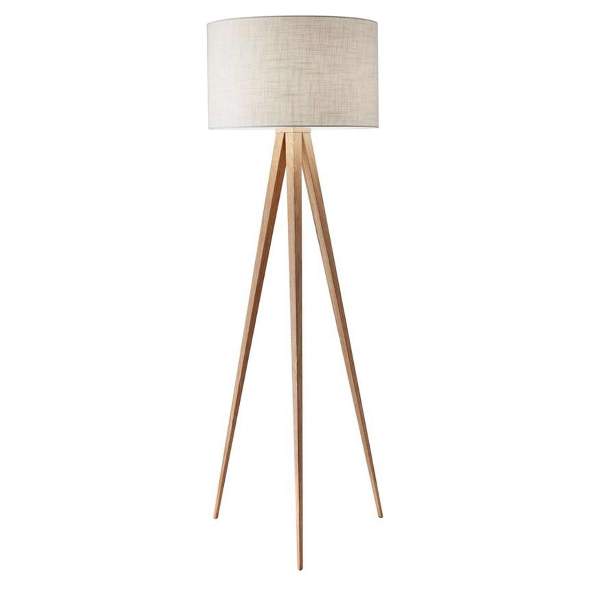Bring a contemporary touch to your living room or bedroom with the Director floor lamp. The natural wood-look tripod legs create a striking contrast with the off-white drum shade.