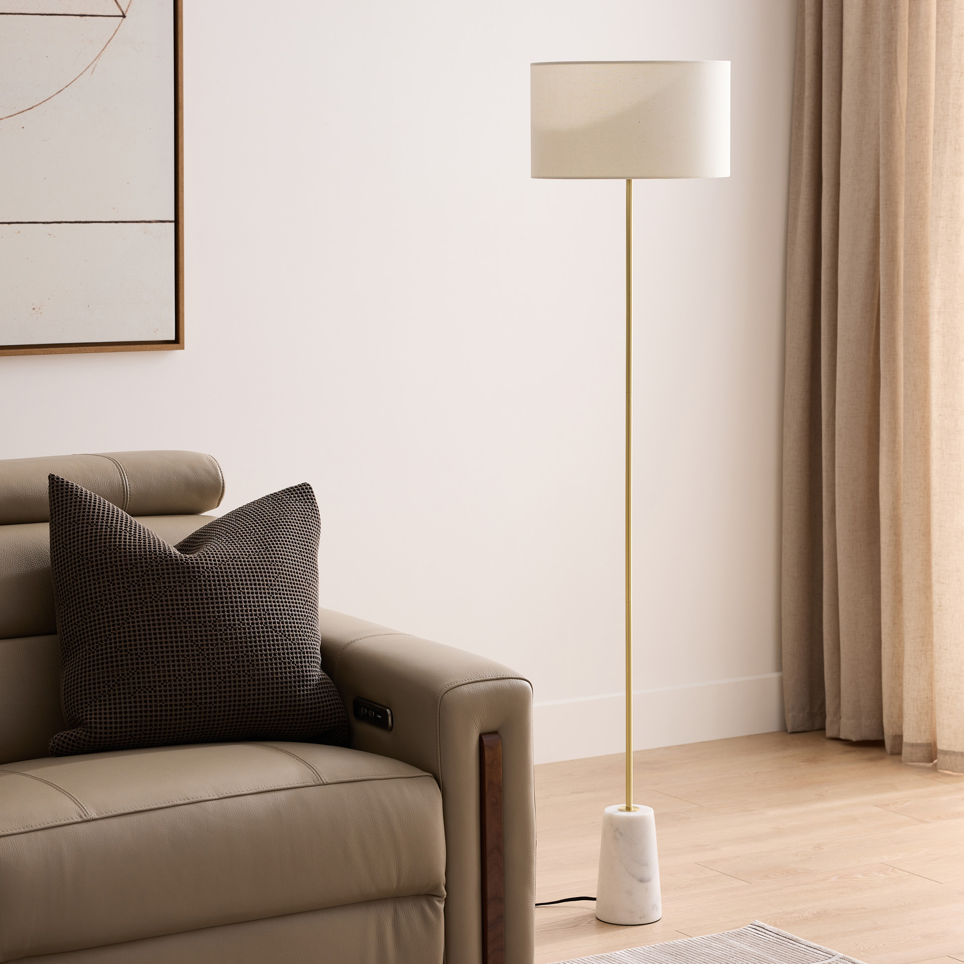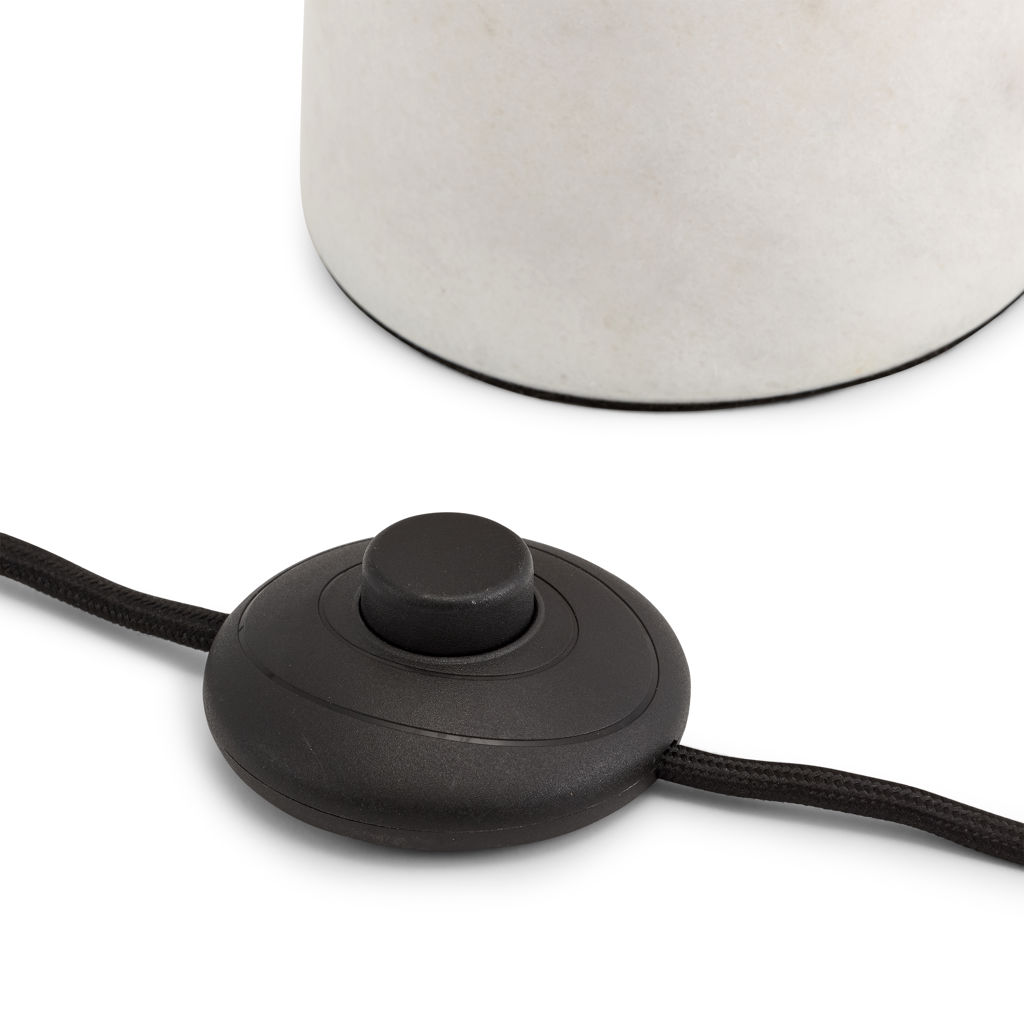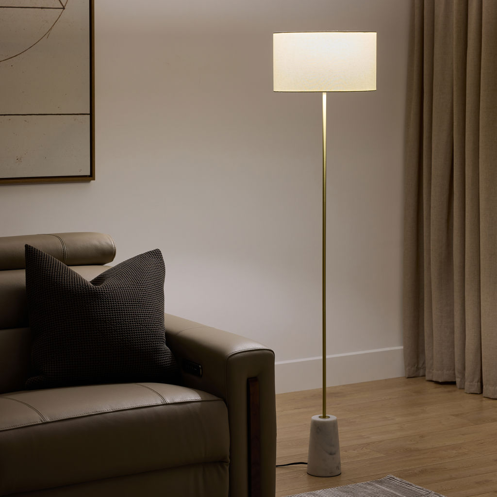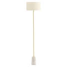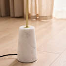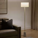 An updated take on a classic, the minimal Tab floor lamp features a steel stem anchored in a white marble base with a white fabric shade.