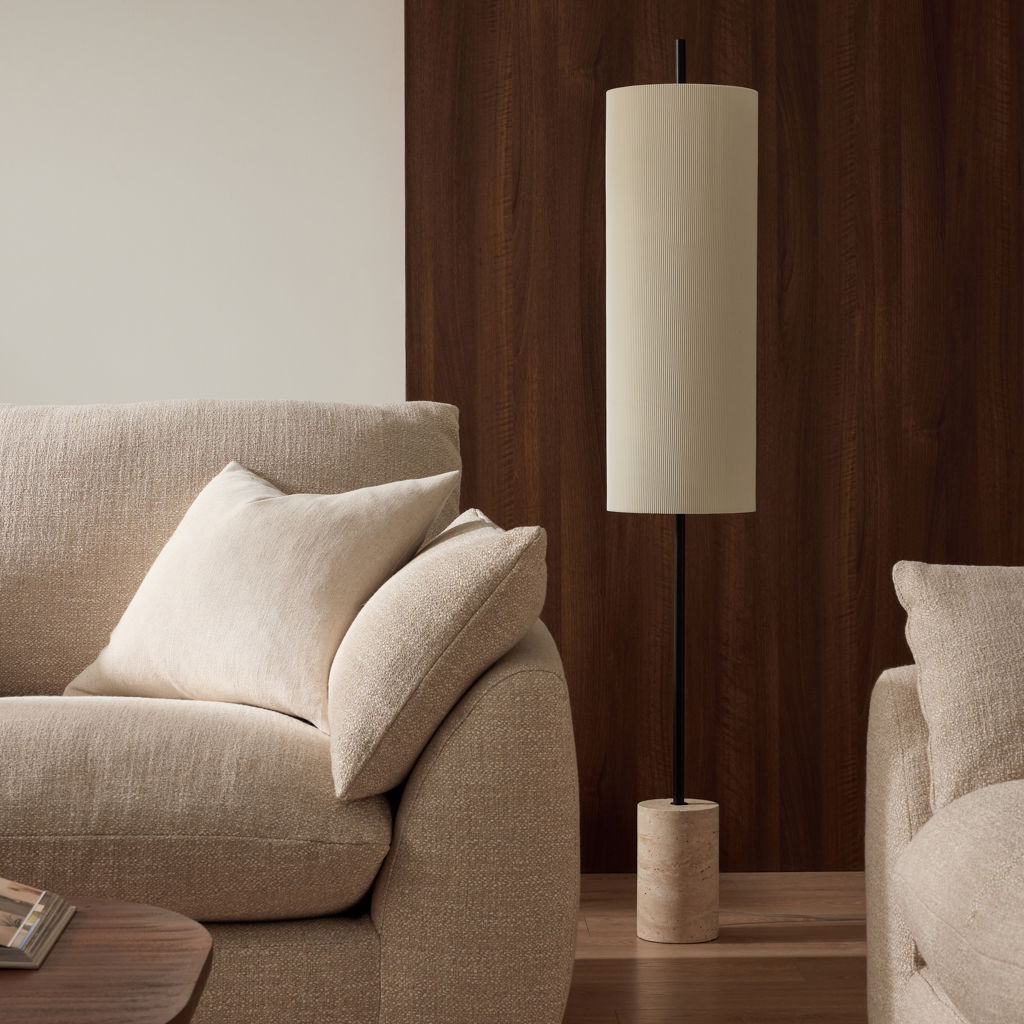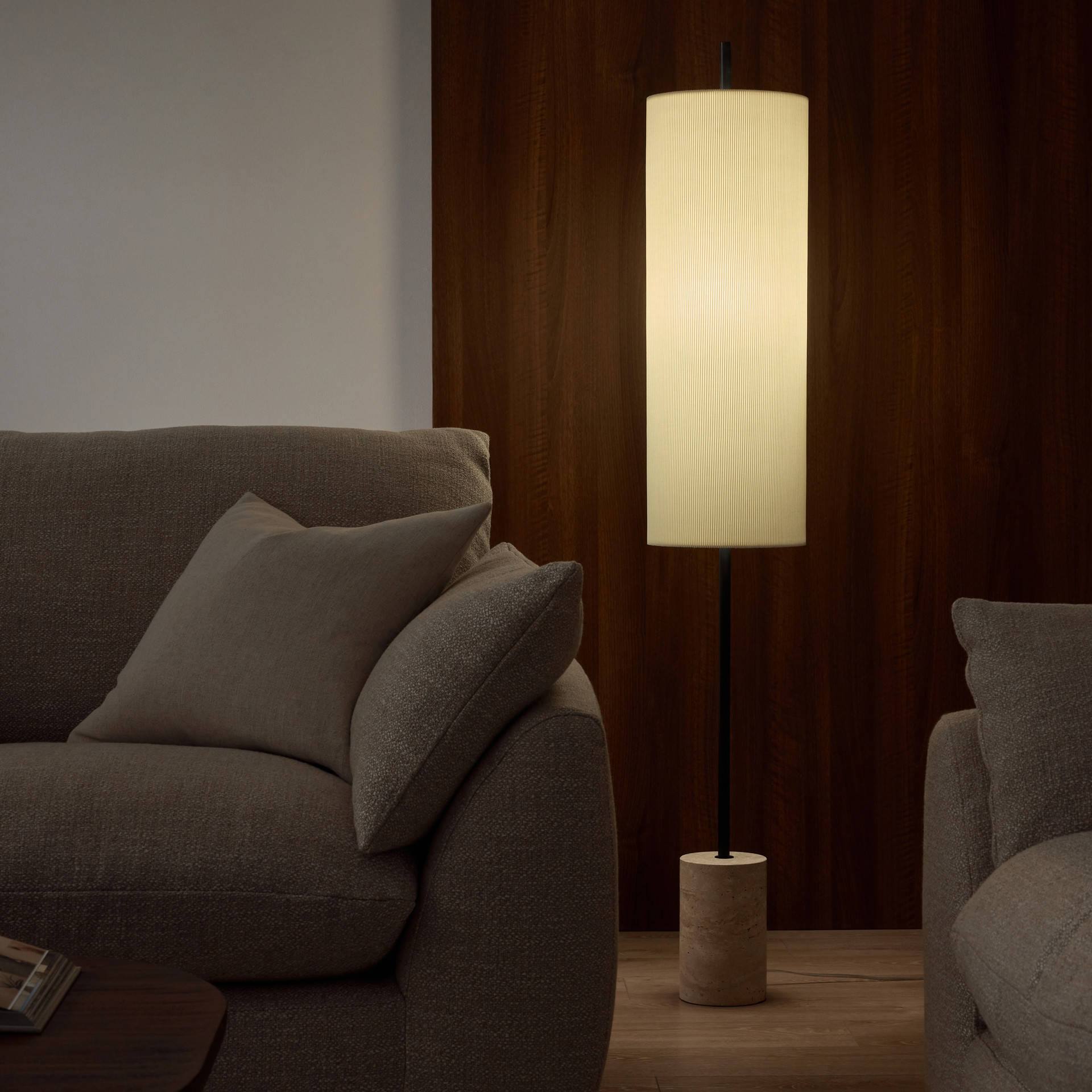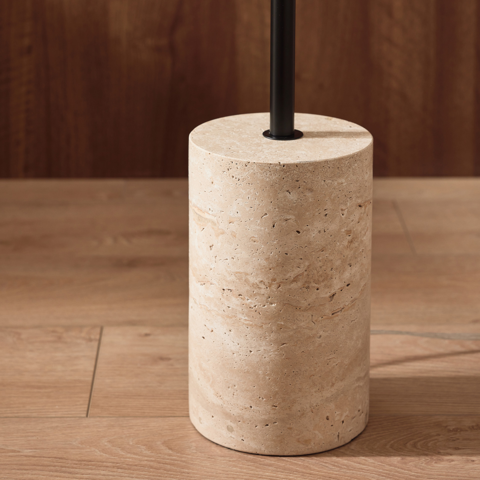 Standing tall at 60.5 inches, the Eleanor Floor Lamp becomes a commanding presence, supported by a substantial chunky travertine stone base.